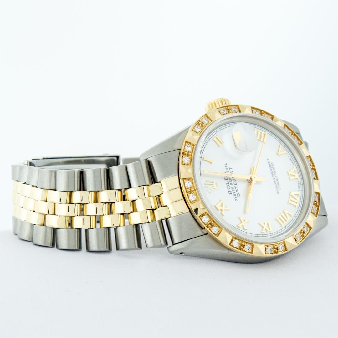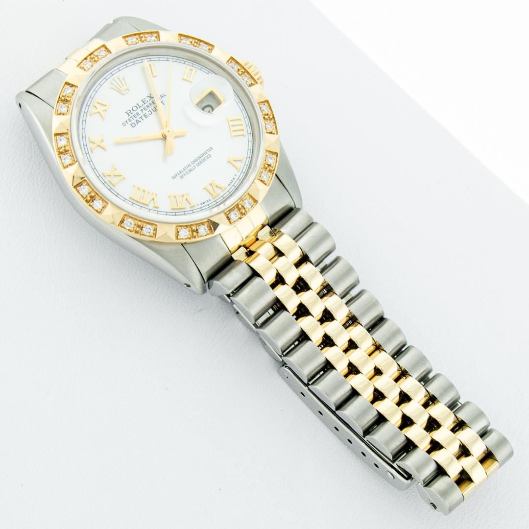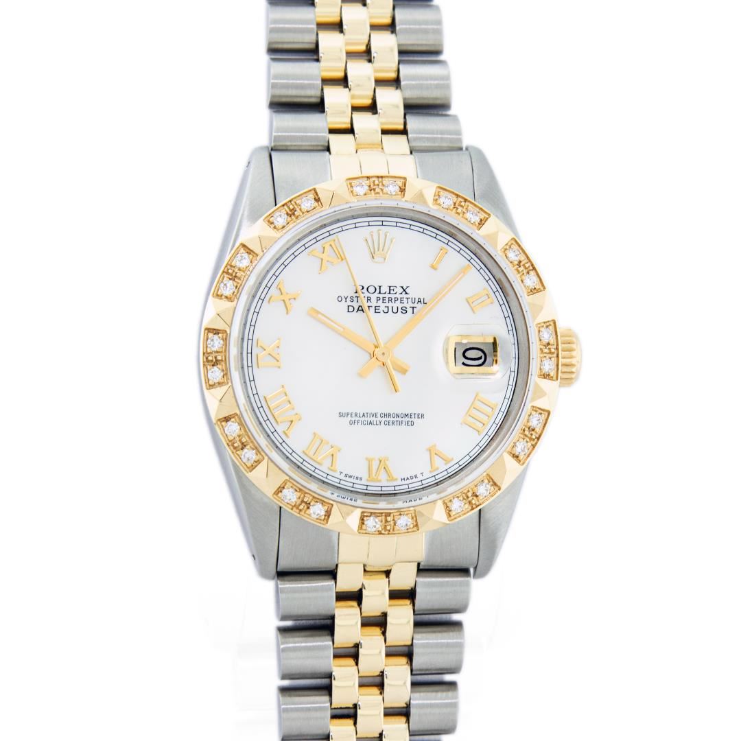 One Mens Pre Owned Two Tone Yellow Gold And Stainless Steel Rolex Datejust Polished Bright with Satin Finish, Serviced And Electronically Tested, Rolex Stainless Steel Case: 36mm, Rolex Yellow Gold Crown, Custom Bezel: New 18K Yellow Gold Pyramid Diamond Bezel, Diamond Count: 24 Diamonds. Custom Crystal: New Sapphire With Magnified Date. Custom Hands: New Luminescent Hands. Rolex Movement: Automatic Winding Movement 3035. Custom Dial: Custom White Roman With Square Track. Date Window: 3 O'Clock Position Date Display, Quickset, Model: Datejust. Condition: G-6 Extra Fine. Rolex Bracelet: Yellow Gold And Stainless Steel Jubilee Band. Bright Polish And Satin Finish. 7.0 Inch Length, Adjustable. Standard Clasp, With Rolex Logo. This Watch Has Been Serviced And Polished It Is Free Of All Scratches And Dents.