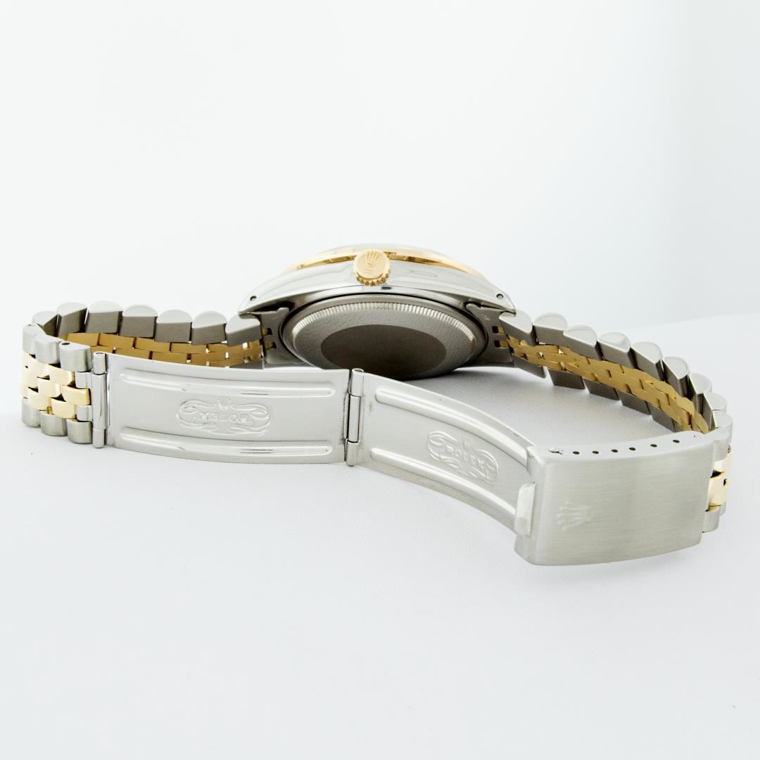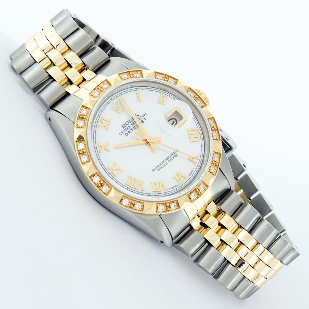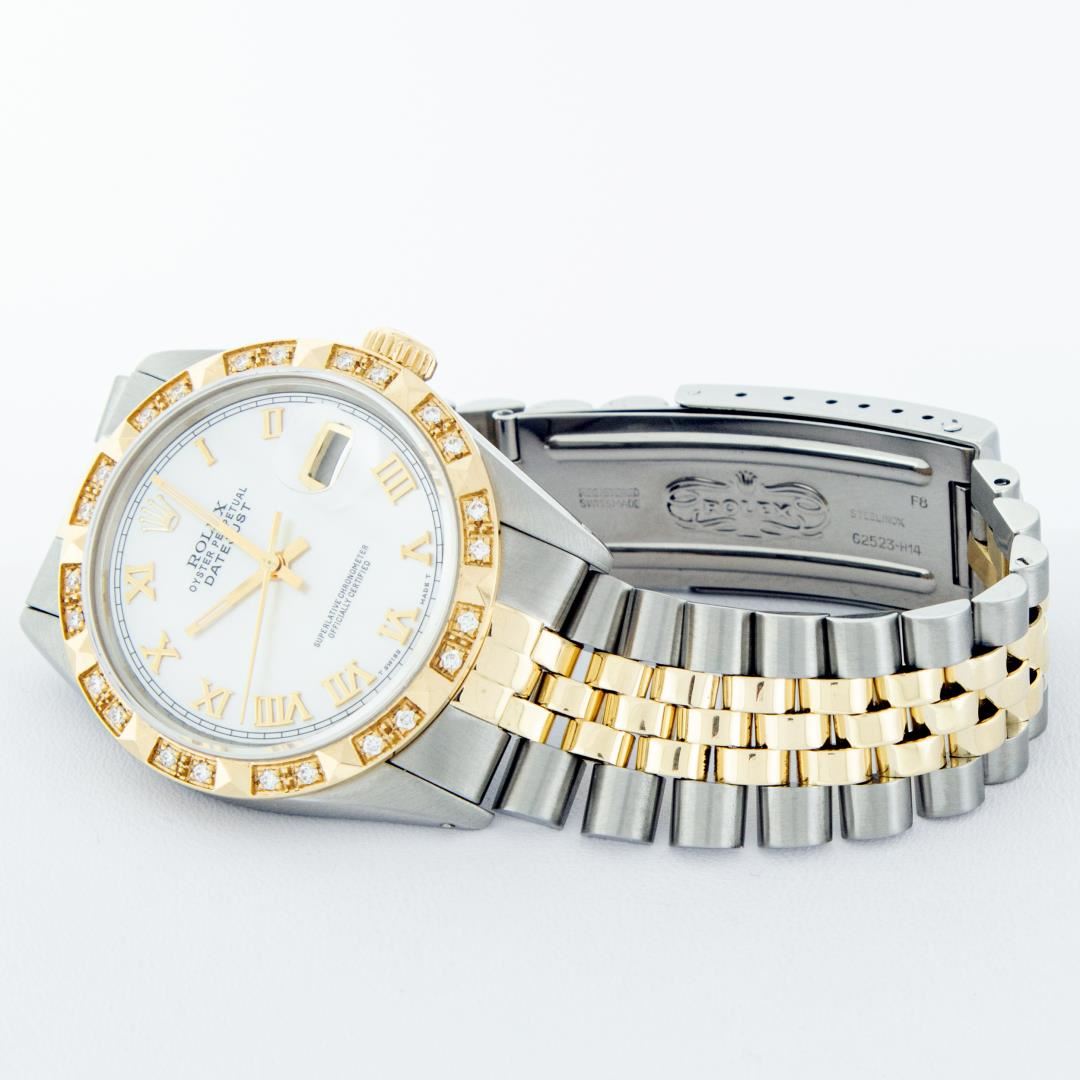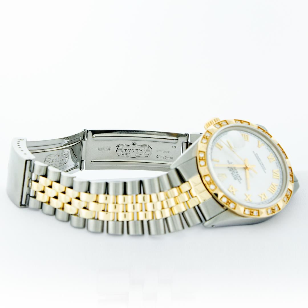 One Mens Pre Owned Two Tone Yellow Gold And Stainless Steel Rolex Datejust Polished Bright with Satin Finish, Serviced And Electronically Tested, Rolex Stainless Steel Case: 36mm, Rolex Yellow Gold Crown, Custom Bezel: New 18K Yellow Gold Pyramid Diamond Bezel, Diamond Count: 24 Diamonds. Custom Crystal: New Sapphire With Magnified Date. Custom Hands: New Luminescent Hands. Rolex Movement: Automatic Winding Movement 3035. Custom Dial: Custom White Roman With Square Track. Date Window: 3 O'Clock Position Date Display, Quickset, Model: Datejust. Condition: G-6 Extra Fine. Rolex Bracelet: Yellow Gold And Stainless Steel Jubilee Band. Bright Polish And Satin Finish. 7.0 Inch Length, Adjustable. Standard Clasp, With Rolex Logo. This Watch Has Been Serviced And Polished It Is Free Of All Scratches And Dents.