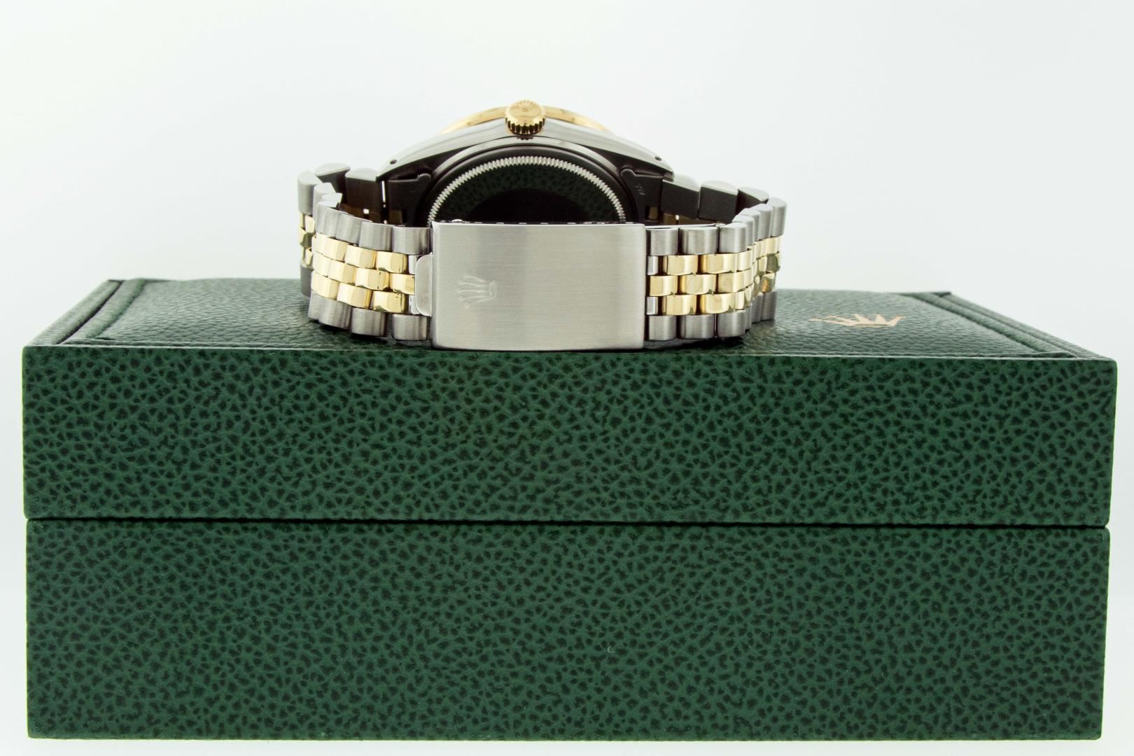 One Mens Pre Owned Yellow Gold Rolex Datejust Polished Bright with Satin Finish, Serviced & Electronically Tested, Stainless Steel Case: 36mm, Rolex Yellow Gold Crown, Custom Bezel: New 18K Yellow Gold Pyramid Diamond Bezel, Diamond Count: 24 Diamonds, Total Weight .75 Carat, Clarity: SI-VS, Color: G to H. Custom Crystal: New Sapphire With Magnified Date Window. Custom Hands: New Luminecent Hands. Rolex Movement: Automatic Winding Movement. Rolex Dial: White Roman Dial With Square Track. Date Window: 3 O'Clock Position Date Display, Quickset, Model: Datejust. Condition: G-6 Extra Fine. Rolex Bracelet: Yellow Gold And Stainless Steel Jubilee Band. Bright Polish & Satin Finish. 7.0 Inch Length, Adjustable. Standard Clasp, With Rolex Logo. This Watch Has Been Serviced And Polished It Is Free Of All Scratches And Dents. This Watch Comes With A Rolex Box.
