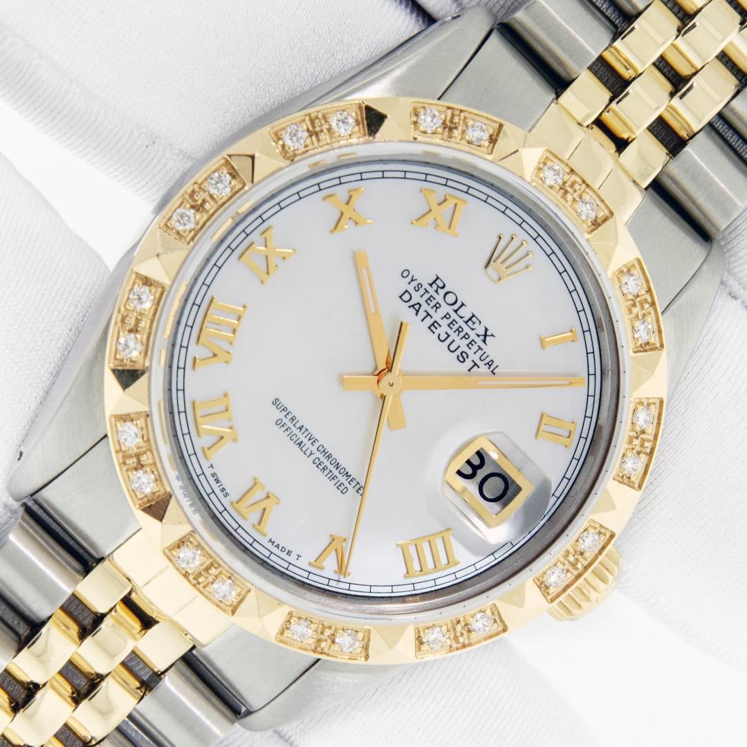 One Mens Pre Owned Yellow Gold Rolex Datejust Polished Bright with Satin Finish, Serviced & Electronically Tested, Stainless Steel Case: 36mm, Rolex Yellow Gold Crown, Custom Bezel: New 18K Yellow Gold Pyramid Diamond Bezel, Diamond Count: 24 Diamonds, Total Weight .75 Carat, Clarity: SI-VS, Color: G to H. Custom Crystal: New Sapphire With Magnified Date Window. Custom Hands: New Luminecent Hands. Rolex Movement: Automatic Winding Movement. Rolex Dial: White Roman Dial With Square Track. Date Window: 3 O'Clock Position Date Display, Quickset, Model: Datejust. Condition: G-6 Extra Fine. Rolex Bracelet: Yellow Gold And Stainless Steel Jubilee Band. Bright Polish & Satin Finish. 7.0 Inch Length, Adjustable. Standard Clasp, With Rolex Logo. This Watch Has Been Serviced And Polished It Is Free Of All Scratches And Dents. This Watch Comes With A Rolex Box.