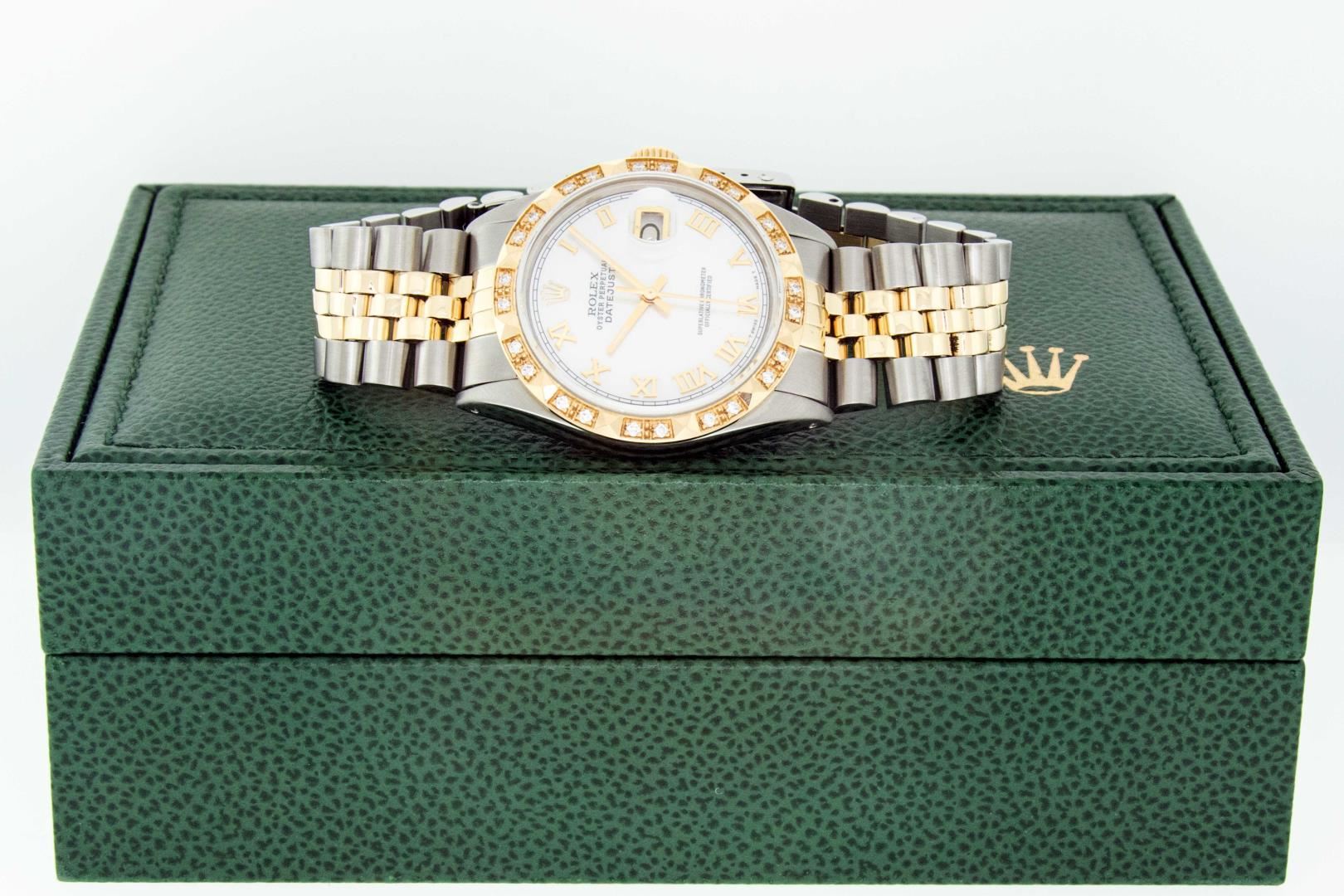 One Mens Pre Owned Yellow Gold Rolex Datejust Polished Bright with Satin Finish, Serviced & Electronically Tested, Stainless Steel Case: 36mm, Rolex Yellow Gold Crown, Custom Bezel: New 18K Yellow Gold Pyramid Diamond Bezel, Diamond Count: 24 Diamonds, Total Weight .75 Carat, Clarity: SI-VS, Color: G to H. Custom Crystal: New Sapphire With Magnified Date Window. Custom Hands: New Luminecent Hands. Rolex Movement: Automatic Winding Movement. Rolex Dial: White Roman Dial With Square Track. Date Window: 3 O'Clock Position Date Display, Quickset, Model: Datejust. Condition: G-6 Extra Fine. Rolex Bracelet: Yellow Gold And Stainless Steel Jubilee Band. Bright Polish & Satin Finish. 7.0 Inch Length, Adjustable. Standard Clasp, With Rolex Logo. This Watch Has Been Serviced And Polished It Is Free Of All Scratches And Dents. This Watch Comes With A Rolex Box.
