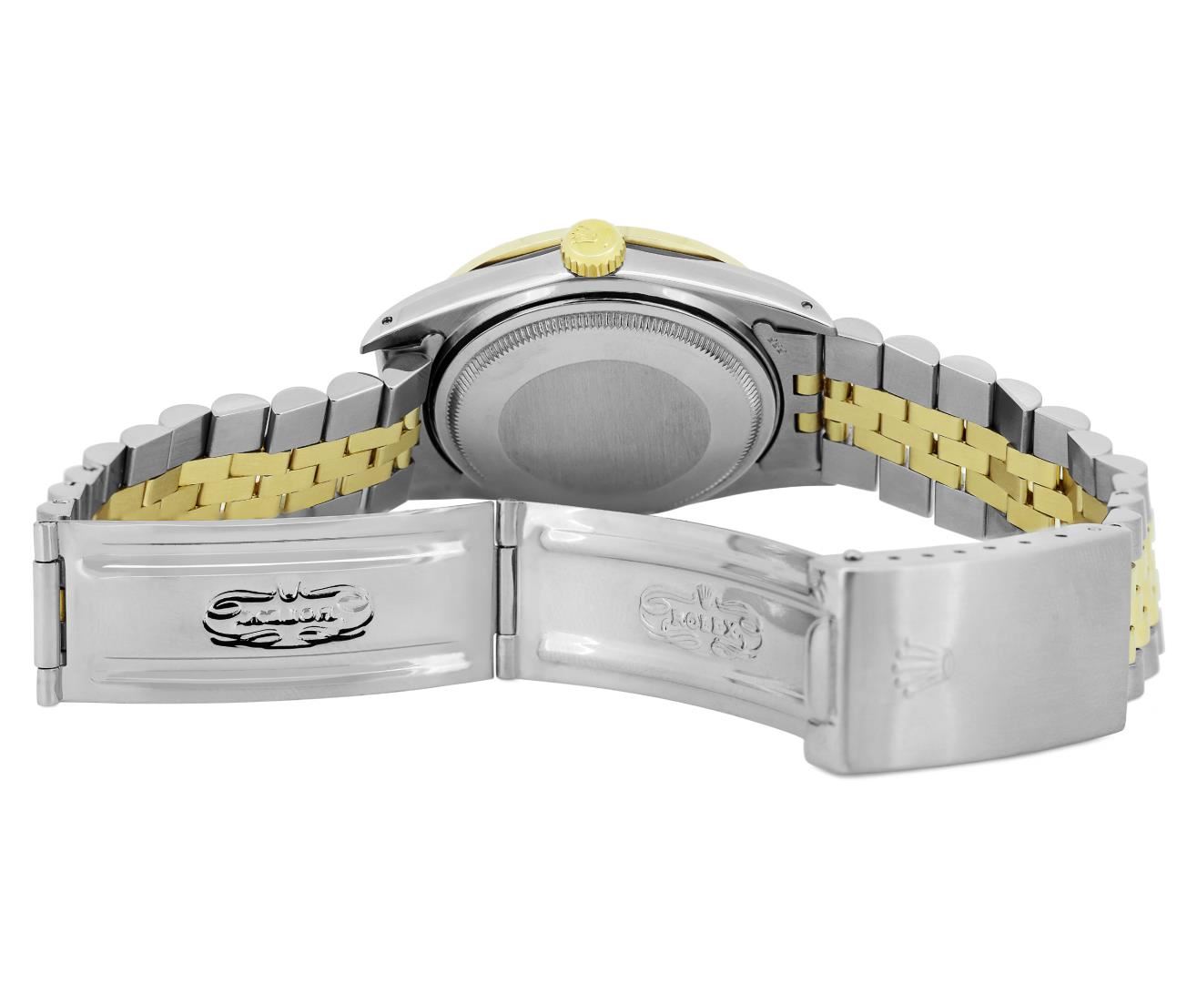 One Mens Pre Owned Yellow Gold Two Tone Rolex Datejust Polished, Serviced & Electronically Tested, Rolex Yellow Gold And Stainless Steel Case: 36mm, Rolex Yellow Gold Crown, Rolex Bezel: Yellow Gold Fluted Bezel. Custom Crystal: New Acrylic With Magnified Date Window. Custom Hands: New Luminecent Hands. Rolex Movement: Automatic Winding Movement 3035. Rolex Dial: Champagne Dial With Index Hour Markers and Dash Track With Lumi Dots. Date Window: 3 O'Clock Position Date Display, Quickset, Model: Quickset Datejust. Condition: G-6 Extra Fine. Rolex Bracelet: Two Tone Yellow Gold And Stainless Steel Jubilee Band. Bright Polish. 7.0 Inch Length, Adjustable. Standard Clasp, With Rolex Logo. This Watch Has Been Serviced Time Tested And Is In Excellent Condition It Is Free Of All Scratches And Dents.