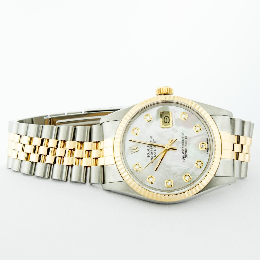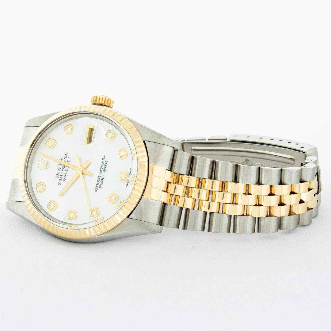 One Mens Pre Owned Two Tone Yellow Gold And Stainless Steel Rolex Datejust Polished, Serviced And Electronically Tested, Rolex Yellow Gold And Stainless Steel Case: 36mm, Rolex Yellow Gold Crown, Rolex Bezel: Yellow Gold Fluted Bezel. Custom Crystal: New Acrylic With Magnified Date Window. Custom Hands: New Hands. Rolex Movement: Automatic Winding Movement 3035. Custom Dial: Custom White Dial With Added Genuine Diamond Hour Markers, Diamond Count: 10 Diamonds On Dial. Date Window: 3 O'Clock Position Date Display, Quickset, Model: Datejust. Condition: G-6 Extra Fine. Rolex Bracelet: Two Tone Yellow Gold And Stainless Steel Jubilee Band. Bright Polish. 7.0 Inch Length, Adjustable. Standard Clasp, With Rolex Logo. Watch Has Been Serviced And Polished It Is Free Of All Scratches And Dents.