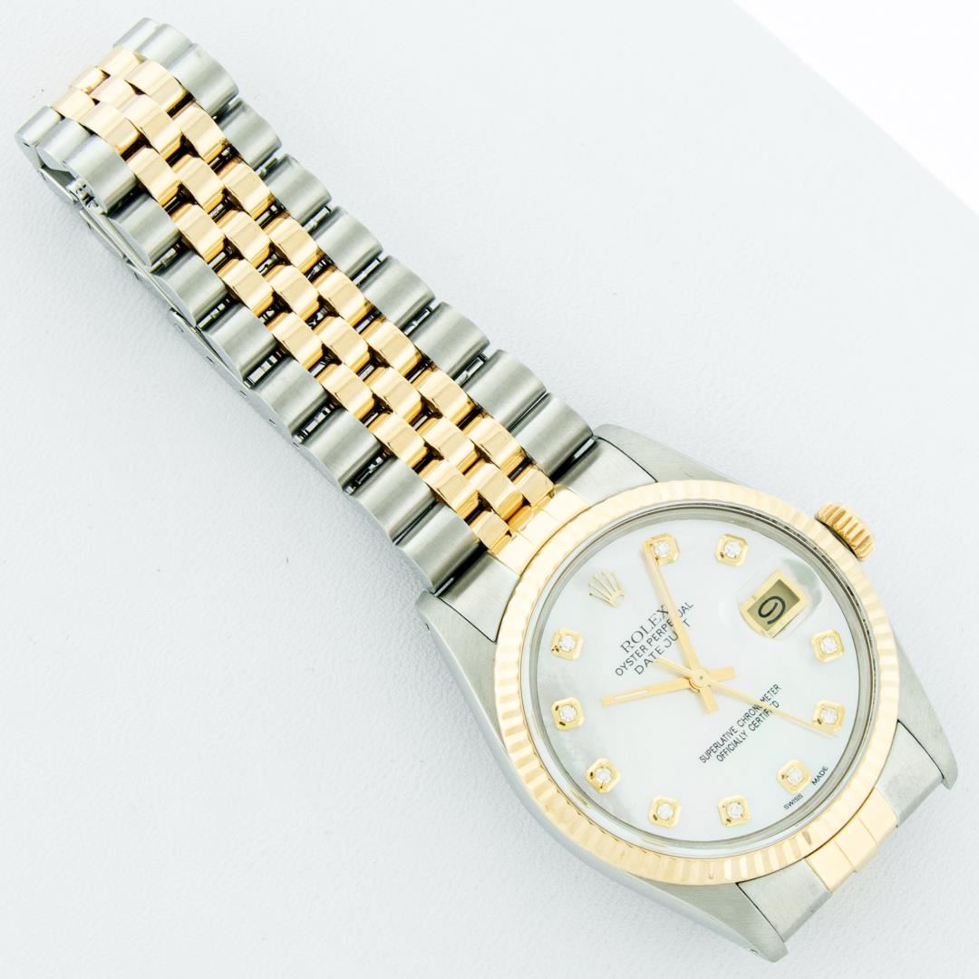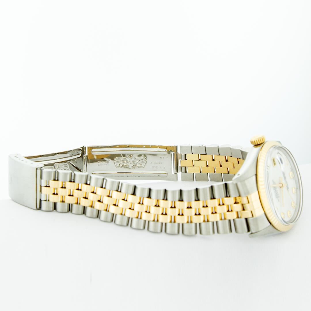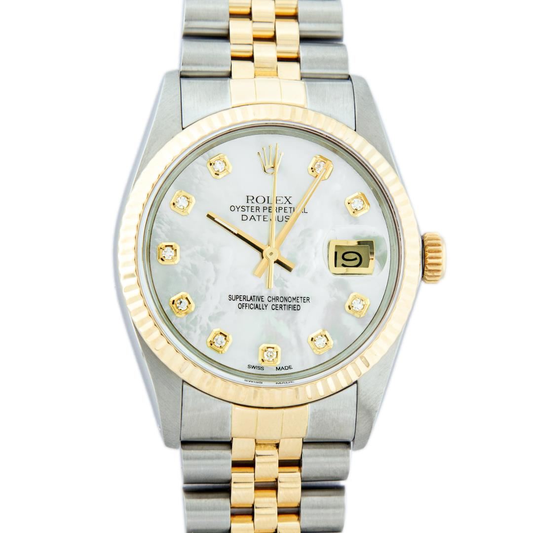 One Mens Pre Owned Two Tone Yellow Gold And Stainless Steel Rolex Datejust Polished, Serviced And Electronically Tested, Rolex Yellow Gold And Stainless Steel Case: 36mm, Rolex Yellow Gold Crown, Rolex Bezel: Yellow Gold Fluted Bezel. Custom Crystal: New Acrylic With Magnified Date Window. Custom Hands: New Hands. Rolex Movement: Automatic Winding Movement 3035. Custom Dial: Custom White Dial With Added Genuine Diamond Hour Markers, Diamond Count: 10 Diamonds On Dial. Date Window: 3 O'Clock Position Date Display, Quickset, Model: Datejust. Condition: G-6 Extra Fine. Rolex Bracelet: Two Tone Yellow Gold And Stainless Steel Jubilee Band. Bright Polish. 7.0 Inch Length, Adjustable. Standard Clasp, With Rolex Logo. Watch Has Been Serviced And Polished It Is Free Of All Scratches And Dents.