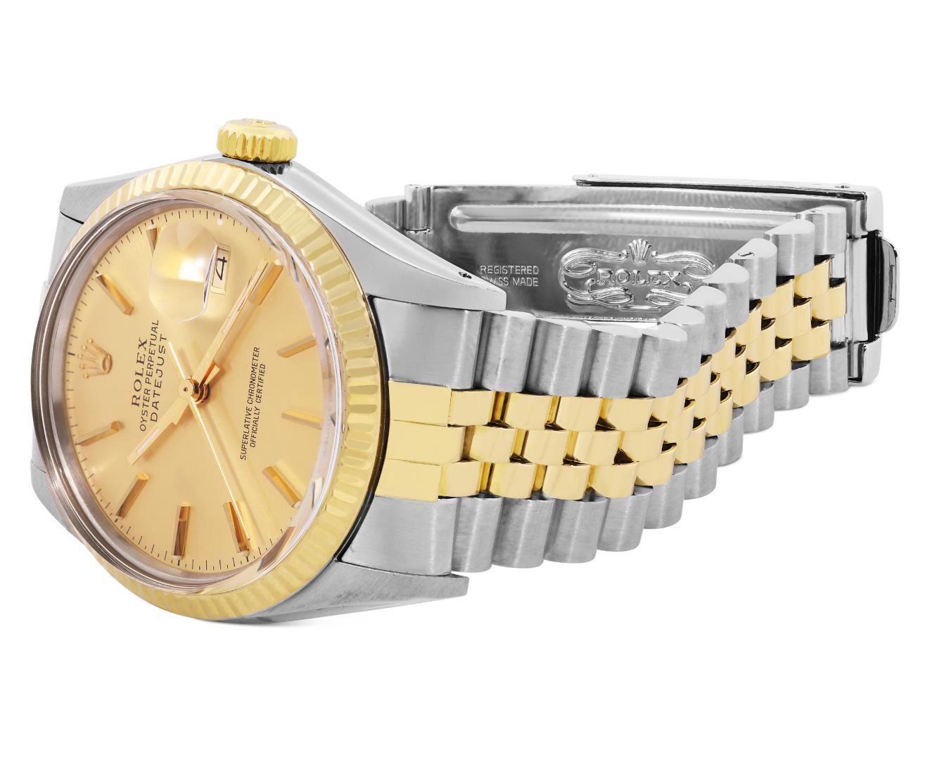 One Mens Pre Owned 18K Two Tone Yellow Gold And Stainless Steel Rolex Datejust Polished, Serviced And Electronically Tested, Rolex Yellow Gold And Stainless Steel Case: 36mm, Rolex Yellow Gold Crown, Rolex Bezel: Yellow Gold Fluted Bezel. Custom Crystal: New Plastic With Magnified Date Window. Hands: Luminescent Hands. Rolex Movement: Automatic Winding Movement 3035. Rolex Dial: Champagne Dial With Index Hour Markers and Dash Track With Lumi Dots. Date Window: 3 O'Clock Position Date Display, Quickset, Model: Quickset Datejust. Condition: G-6 Extra Fine. Rolex Bracelet: Two Tone Yellow Gold And Stainless Steel Jubilee Band. Bright Polish. 7.0 Inch Length, Adjustable. Standard Clasp, With Rolex Logo. This Watch Has Been Serviced Time Tested And Is In Excellent Condition It Is Free Of All Scratches And Dents.