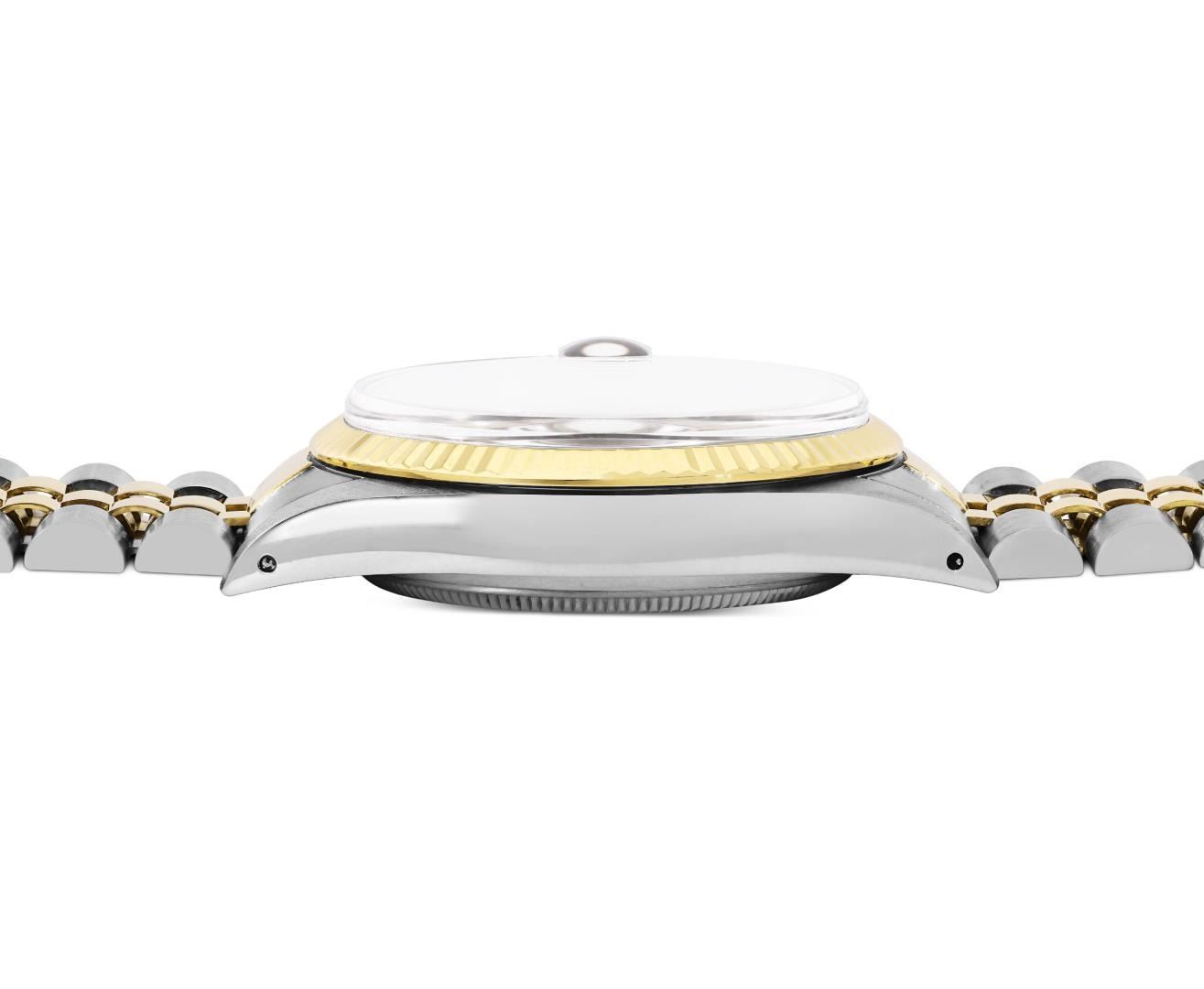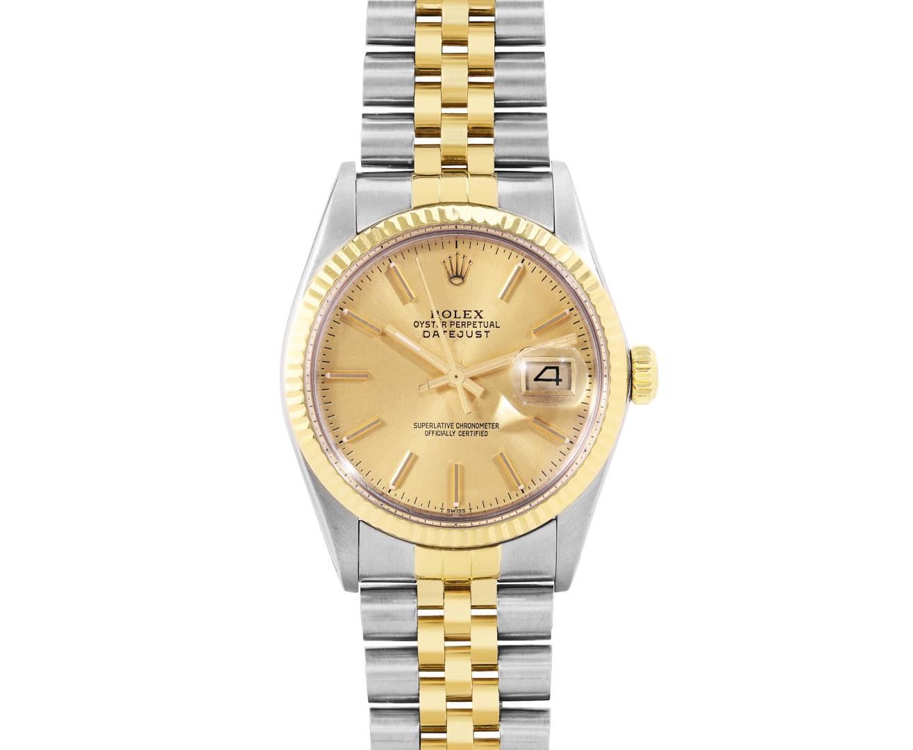 One Mens Pre Owned 18K Two Tone Yellow Gold And Stainless Steel Rolex Datejust Polished, Serviced And Electronically Tested, Rolex Yellow Gold And Stainless Steel Case: 36mm, Rolex Yellow Gold Crown, Rolex Bezel: Yellow Gold Fluted Bezel. Custom Crystal: New Plastic With Magnified Date Window. Hands: Luminescent Hands. Rolex Movement: Automatic Winding Movement 3035. Rolex Dial: Champagne Dial With Index Hour Markers and Dash Track With Lumi Dots. Date Window: 3 O'Clock Position Date Display, Quickset, Model: Quickset Datejust. Condition: G-6 Extra Fine. Rolex Bracelet: Two Tone Yellow Gold And Stainless Steel Jubilee Band. Bright Polish. 7.0 Inch Length, Adjustable. Standard Clasp, With Rolex Logo. This Watch Has Been Serviced Time Tested And Is In Excellent Condition It Is Free Of All Scratches And Dents.