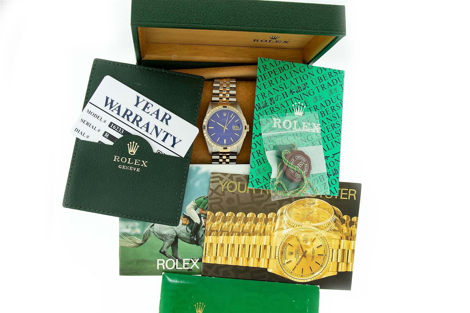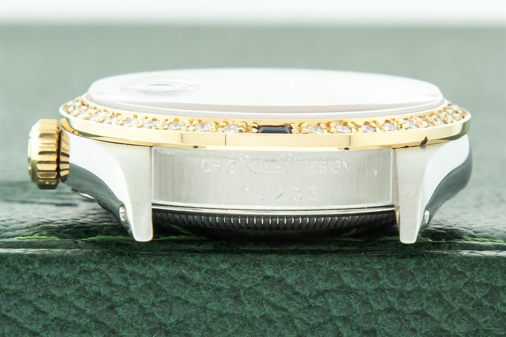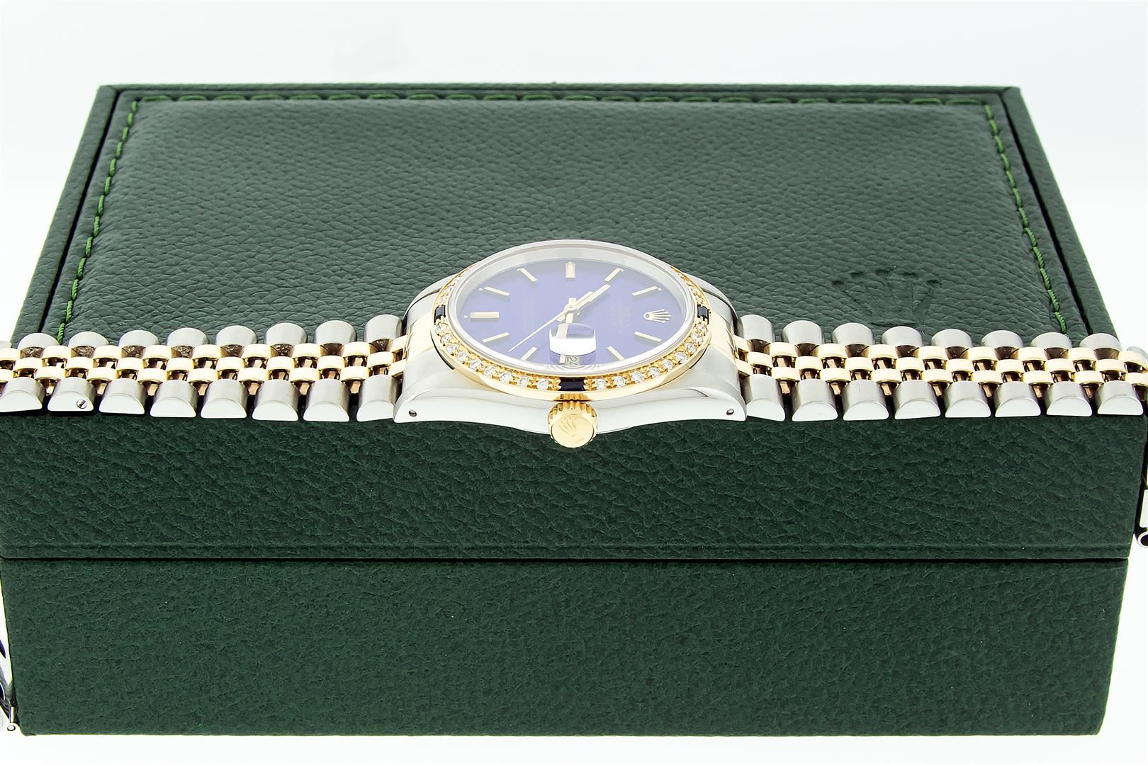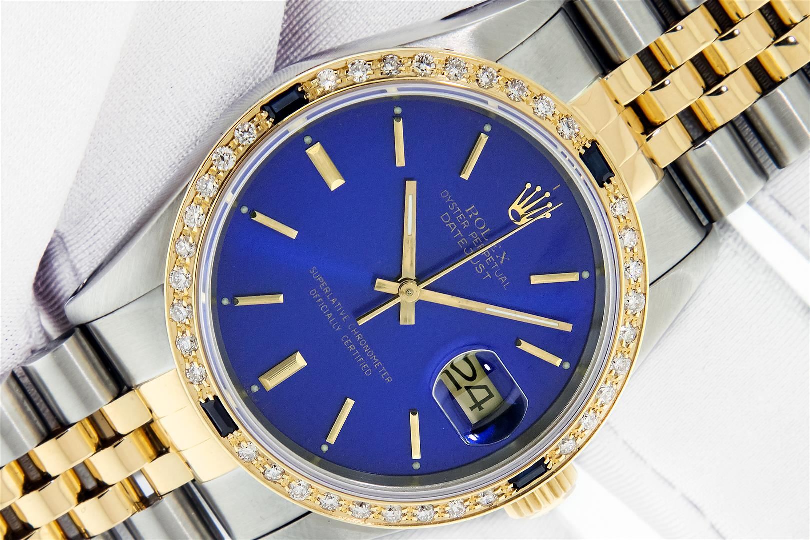 One Mens 18K Yellow Gold & Stainless Steel Two Tone Rolex Oyster Perpetual Datejust Polished, Serviced & Electronically Tested, 18K Yellow Gold & Stainless Steel Case: 36mm, Original 18K Yellow Gold Crown, Custom Bezel: New 18K Yellow Gold Sapphire Beadset Diamond Bezel, Diamond Count: 36 Diamonds + 4 Sapphires Custom Crystal: New Scratch Resistant Sappphire Crystal Lens. Hands: Genuine Rolex Luminecent Hands. Movement: Automatic Winding Movement 3135. Custom Dial:Refinished Blue dial with Index Hour Markers. Date Window: 3 O'Clock Position Date Display, Quickset, Model: Sapphire Datejust 16233, Condition: G-6 Extra Fine. Bracelet: Nice Condition Two Tone 18K Yellow Gold & Stainless Steel Jubilee Band. Bright Polish. 7.0 Inch Length, Adjustable. Standard Clasp, With Rolex Logo. This Watch Has Been Serviced, Time Tested And Polished It Is Free Of All Scratches And Dents. This Watch Comes With The Following Accessories: Rolex Box, Rolex Booklets, Rolex Tag, Rolex Wallet and Rolex Carry Pouch.