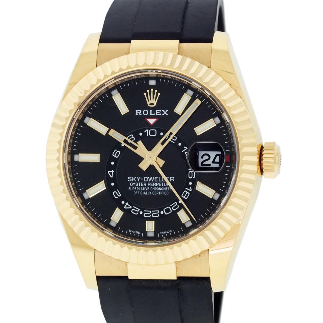 One Mens Pre Owned 18K Yellow Gold Rolex Sky Dweller With Date Polished, Serviced & Electronically Tested, Rolex 18K Yellow Gold Case: 42mm, Rolex Yellow Gold Crown, Rolex Bezel: 18K Yellow Gold Rotatable Fluted Bezel. Rolex Crystal: Sapphire With Magnifi