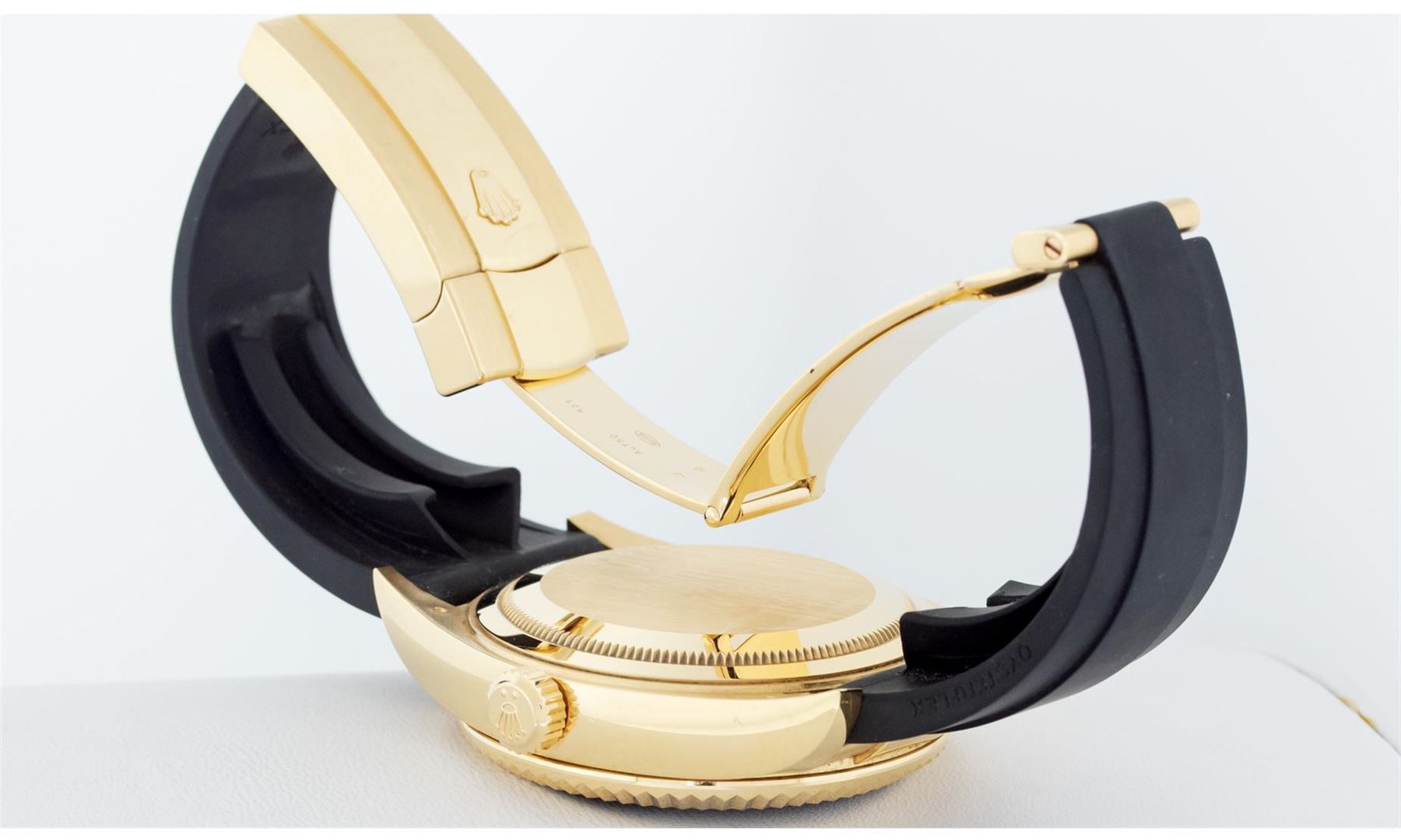 One Mens Pre Owned 18K Yellow Gold Rolex Sky Dweller With Date Polished, Serviced & Electronically Tested, Rolex 18K Yellow Gold Case: 42mm, Rolex Yellow Gold Crown, Rolex Bezel: 18K Yellow Gold Rotatable Fluted Bezel. Rolex Crystal: Sapphire With Magnified Date Window. Rolex Movement: Automatic Winding Movement Caliber 9001. Rolex Dial: Rolex Black Sky Dweller Dial with Luminous Index Hour Markers. Date Window: 3 O'Clock Position Date Display, Model: Sky Dweller, Quickset, Month Calendar Feature, Dual Time, 72 Hour Power Reserve, Condition: G-6 Extra Fine. Rolex Bracelet: Rubber Oyster Flex Band. 7.25 Inch Length, Standard Clasp, With Rolex Logo. This Watch Has Been Serviced Time Tested And Is In Excellent Condition It Is Free Of All Scratches And Dents. This Watch Comes With Rolex Box And Papers.