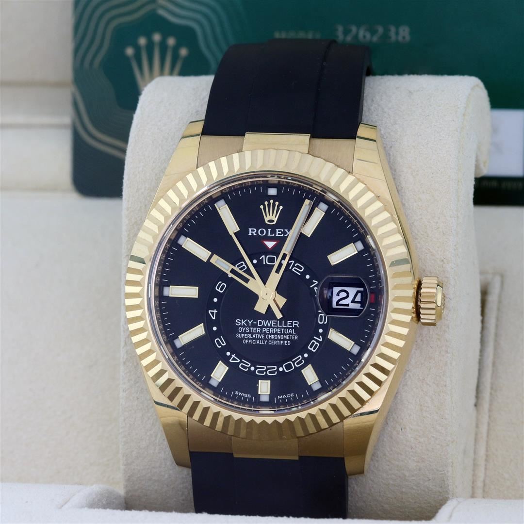 One Mens Pre Owned 18K Yellow Gold Rolex Sky Dweller With Date Polished, Serviced & Electronically Tested, Rolex 18K Yellow Gold Case: 42mm, Rolex Yellow Gold Crown, Rolex Bezel: 18K Yellow Gold Rotatable Fluted Bezel. Rolex Crystal: Sapphire With Magnified Date Window. Rolex Movement: Automatic Winding Movement Caliber 9001. Rolex Dial: Rolex Black Sky Dweller Dial with Luminous Index Hour Markers. Date Window: 3 O'Clock Position Date Display, Model: Sky Dweller, Quickset, Month Calendar Feature, Dual Time, 72 Hour Power Reserve, Condition: G-6 Extra Fine. Rolex Bracelet: Rubber Oyster Flex Band. 7.25 Inch Length, Standard Clasp, With Rolex Logo. This Watch Has Been Serviced Time Tested And Is In Excellent Condition It Is Free Of All Scratches And Dents. This Watch Comes With Rolex Box And Papers.