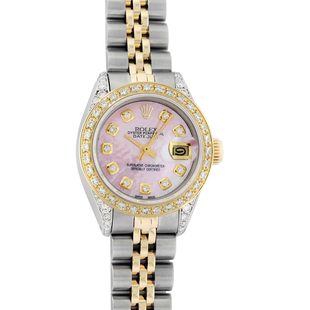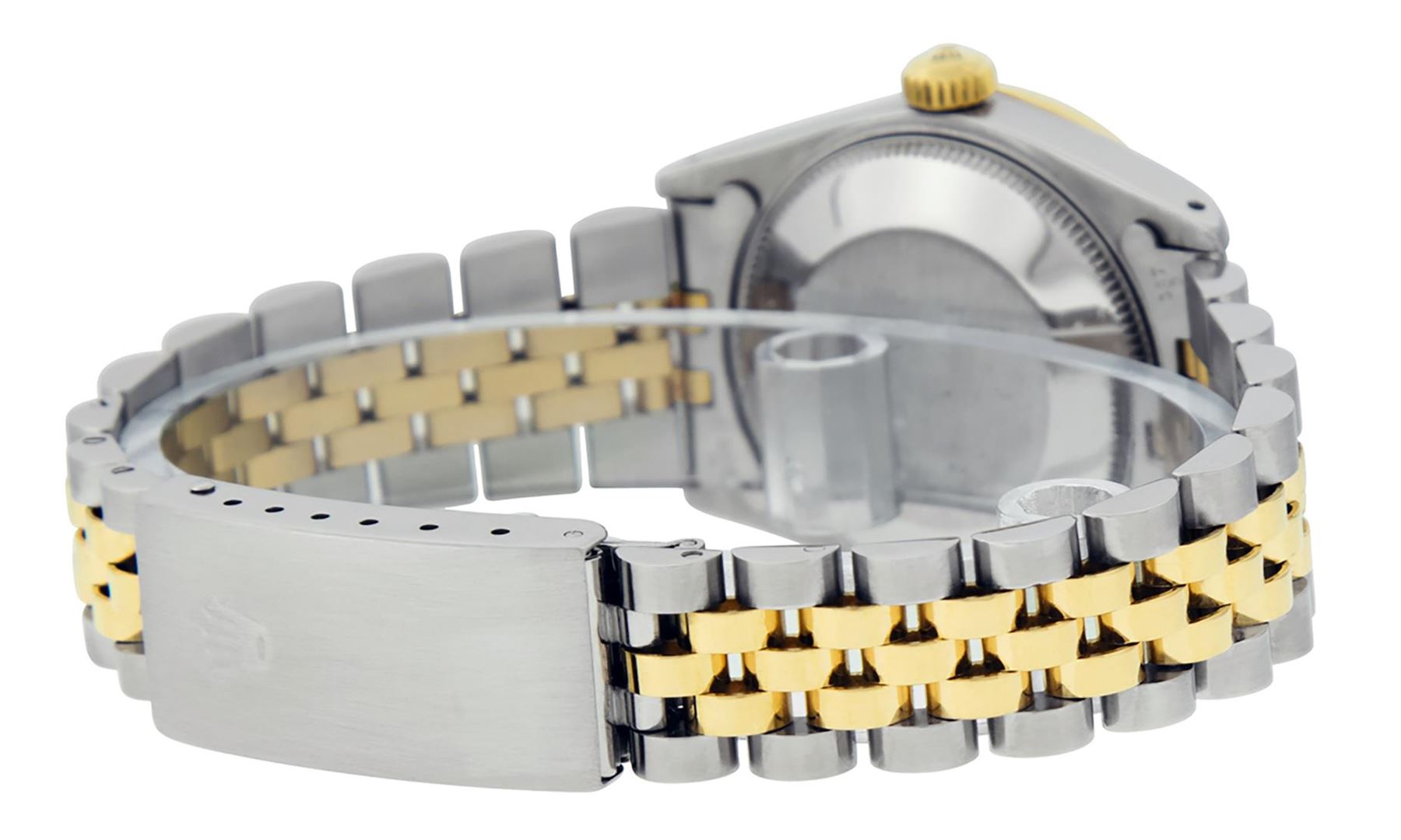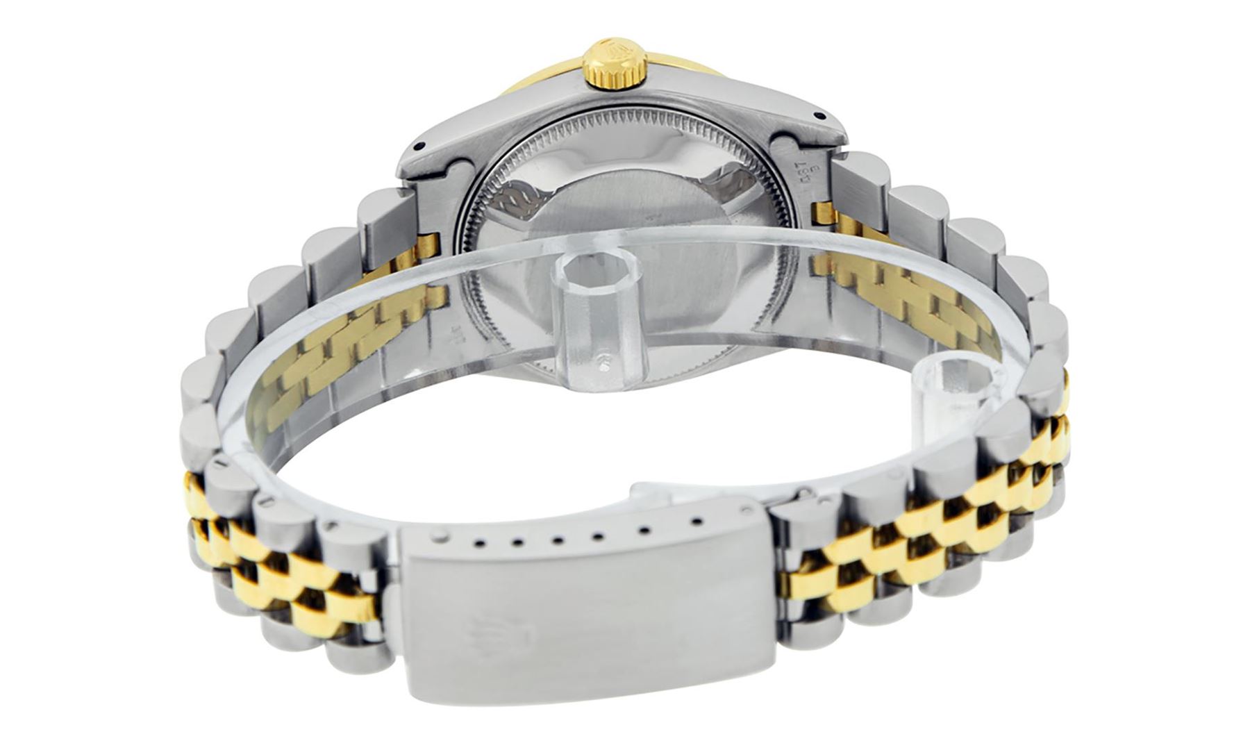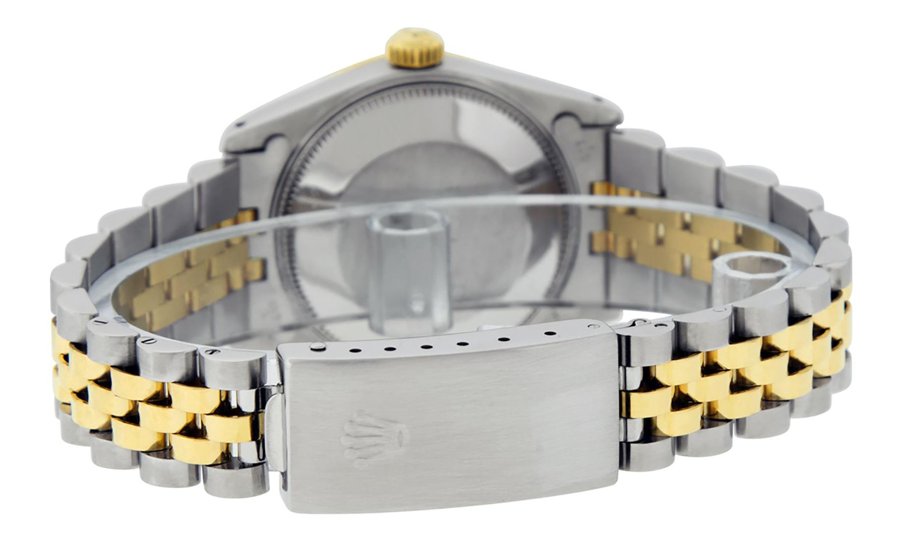 One Womens Pre Owned Midsize Stainless Steel and Yellow Gold Rolex Datejust Polished, Serviced & Electronically Tested, Stainless Steel Case Case: 31mm, Stainless Steel Crown, Custom Diamond Lugs: 24 Diamonds On Lugs. Custom Bezel: New 18K Yellow Gold Beadset Diamond Bezel, Diamond Count: 44 Diamonds On Bezel. Custom Crystal: New Sapphire With Magnified Date Window. Custom Hands: New Luminescent Hands. Rolex Movement: Automatic Winding Movement Caliber 2135. Custom Dial: Pink MOP With Custom Added Diamonds. Diamond Count: 10 Diamonds On Dial. Date Window: 3 O'Clock Position Date Display, Quickset, Model: Midsize Datejust. Condition: G-6 Extra Fine. Rolex Bracelet: Stainless Steel and Yellow Gold Jubilee Band. Bright Polish. 6.0 Inch Length, Adjustable. Standard Clasp, With Rolex Logo. This Watch Has Been Serviced Time Tested And Is In Excellent Condition It Is Free Of All Scratches And Dents.