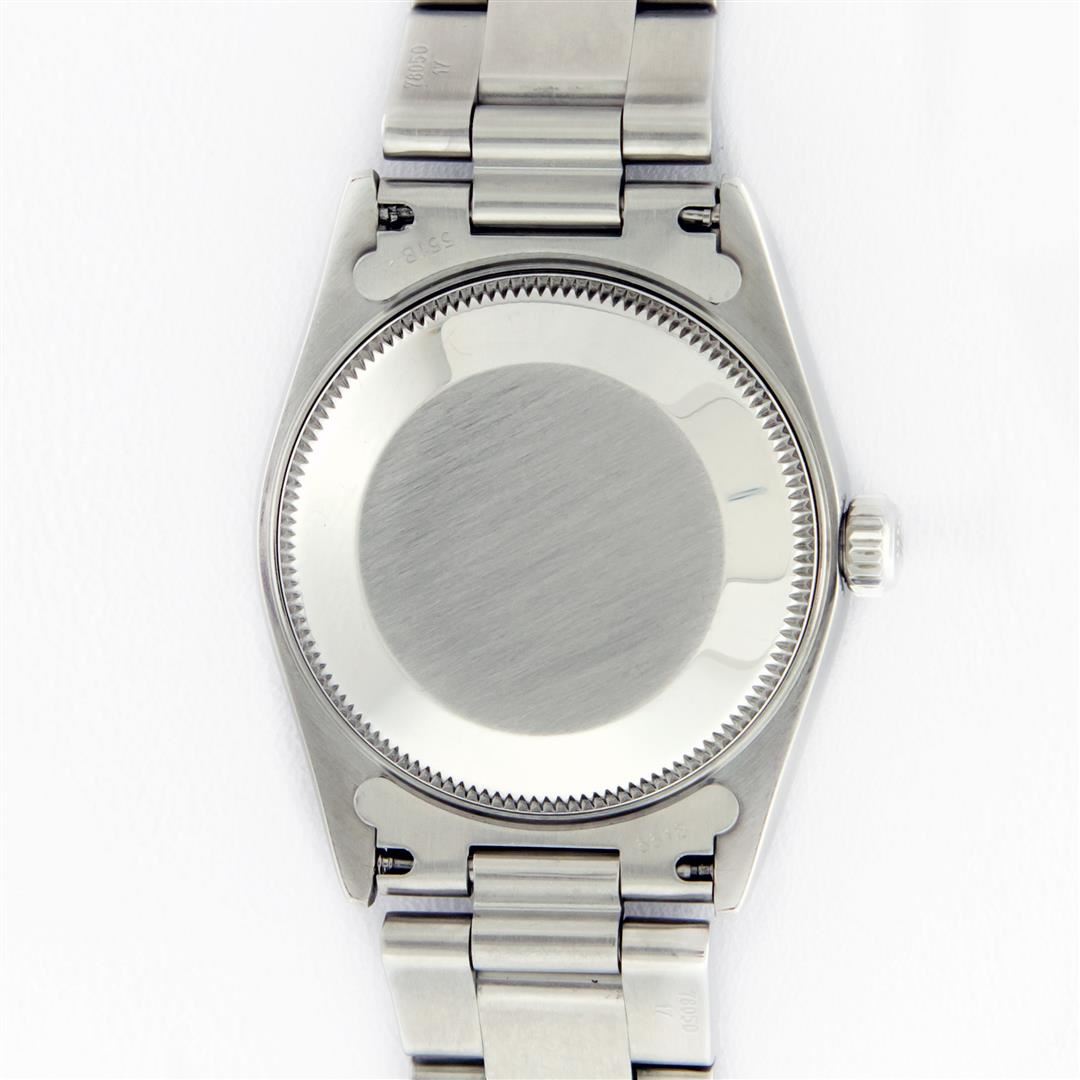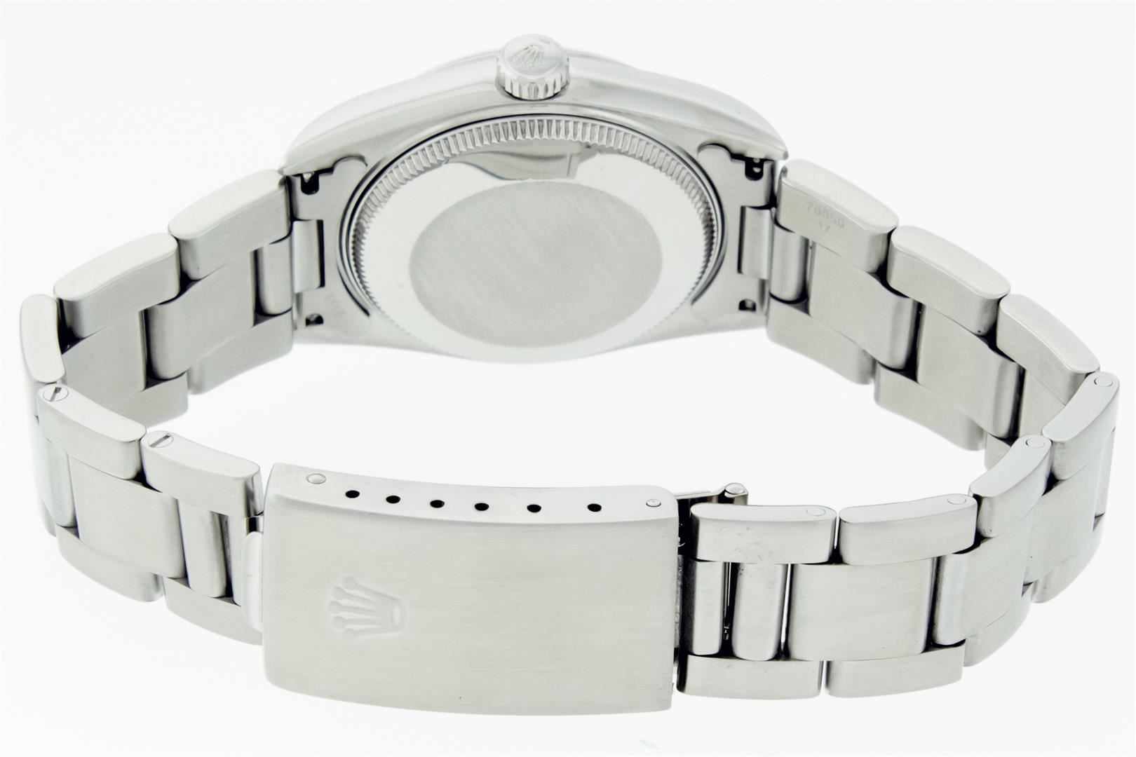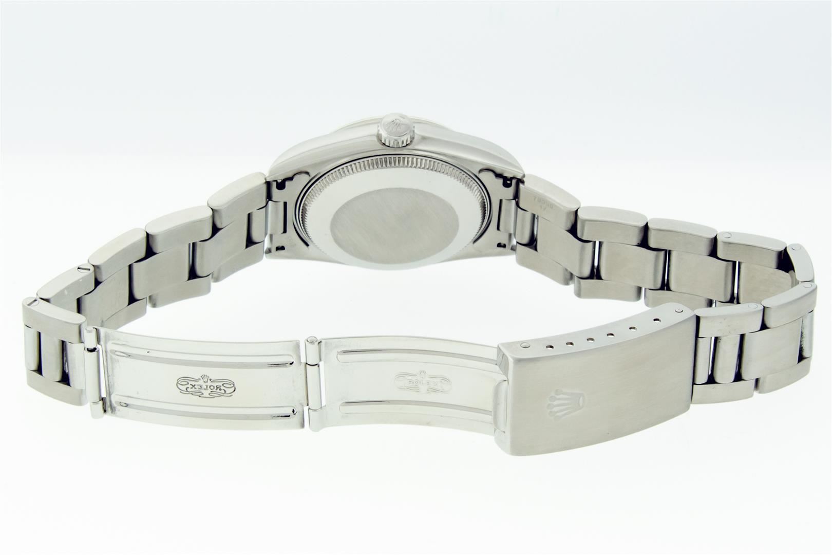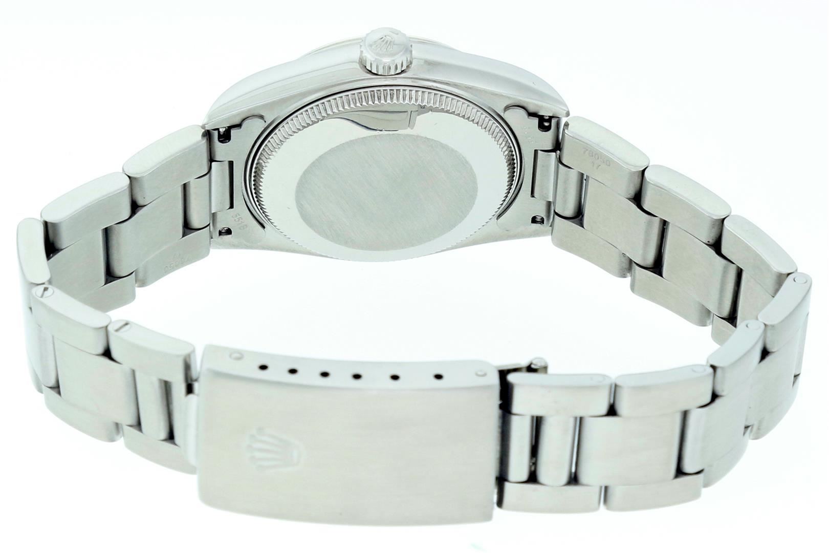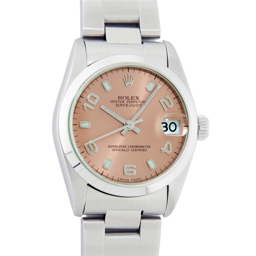 One Womens Pre Owned Midsize Stainless Steel Rolex Datejust Polished, Serviced & Electronically Tested, Rolex Stainless Steel Case Case: 31mm, Rolex Stainless Steel Crown, Rolex Bezel: 18K White Gold Fluted Bezel, Rolex Crystal: Sapphire With Cyclops Lens. Rolex Hands: Lumi Hands. Rolex Movement: Automatic Winding Movement. Rolex Dial: Factory Salmon Arabic Dial With Index Hour Markers. Date Window: 3 O'Clock Position Date Display, Quickset, Model: Midsize Datejust. Condition: G-6 Extra Fine. Rolex Bracelet: Stainless Steel Oyster Band. Bright Polish. 6.0 Inch Length, Adjustable. Standard Clasp, With Rolex Logo. This Watch Has Been Serviced Time Tested And Is In Excellent Condition It Is Free Of All Scratches And Dents.
