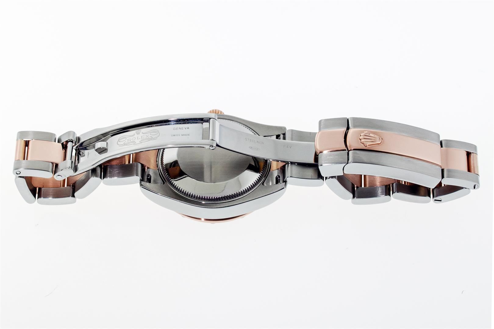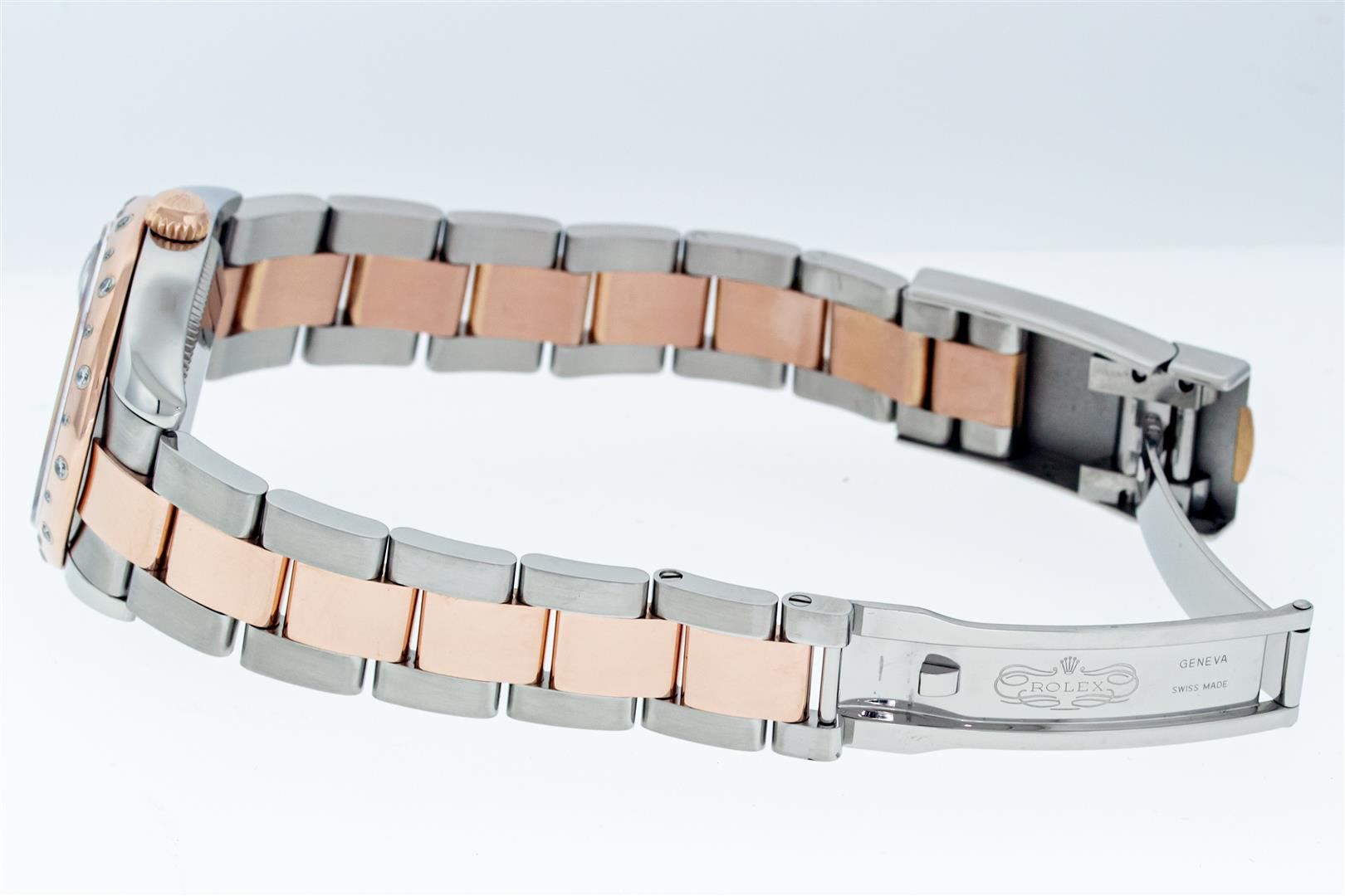 One Women's Pre Owned Midsize 31MM Stainless Steel and 18K Rose Gold Rolex Datejust Polished, Serviced & Electronically Tested, Rolex Stainless Steel & 18K Rose Gold Case: 31mm, Rolex Rose Gold Crown, Rolex Bezel: 18K Rose Gold Diamond Bezel, Diamond Count: 24 Diamonds On Bezel, Color: G To H, Clarity: VS2-SI1. Crystal: Sapphire With Magnified Date Window. Hands: Solid Hands. Rolex Movement: Automatic Winding Movement Caliber 2235. Rolex Dial: Chocolate Roman Dial WIth Diamond Six Hour Marker. Date Window: 3 O'Clock Position Date Display, Quickset, Model: Midsize Datejust. Condition: G-6 Extra Fine. Rolex Bracelet: Stainless Steel and 18K Rose Gold Oyster Band. Bright Polish. 6.0 Inch Length, Adjustable. Standard Clasp, With Rolex Logo. This Watch Has Been Serviced Time Tested And Is In Excellent Condition It Is Free Of All Scratches And Dents.