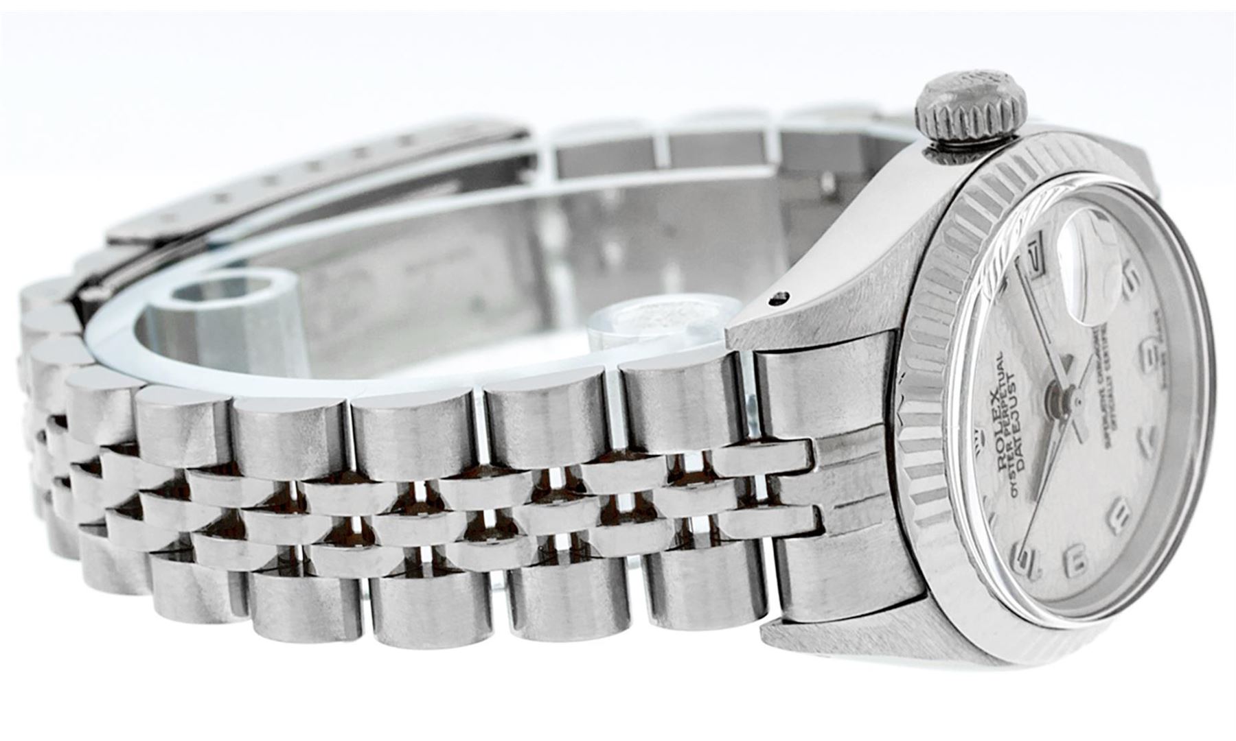 One Womens Pre Owned Midsize Stainless Steel Rolex Datejust Polished, Serviced & Electronically Tested, Rolex Stainless Steel Case Case: 31mm, Rolex Stainless Steel Crown, Rolex Bezel: White Gold Fluted Bezel, Crystal: Sapphire Cyclops Lens. Hands: Solid Hands. Rolex Movement: Automatic Quickset Winding Movement. Rolex Dial: Cream Arabic Dial, Date Window: 3 O'Clock Position Date Display, Quickset, Model: Midsize Datejust. Condition: G-6 Extra Fine. Rolex Bracelet: Stainless Steel Jubilee Band. Bright Polish. 6.0 Inch Length, Adjustable. Standard Clasp, With Rolex Logo. This Watch Has Been Serviced Time Tested And Is In Excellent Condition It Is Free Of All Scratches And Dents.