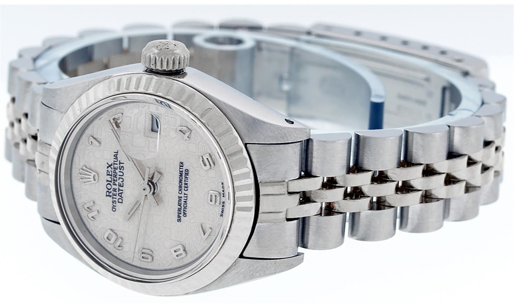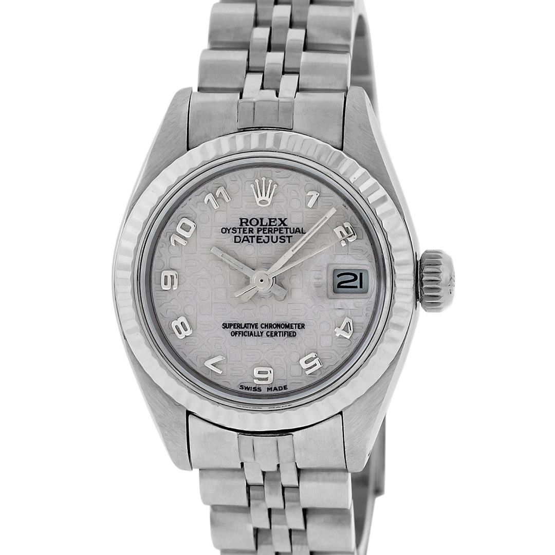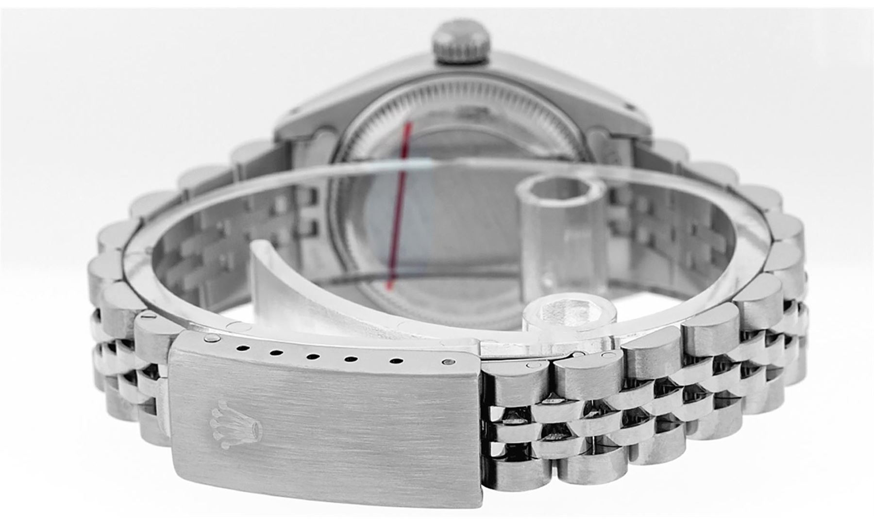 One Womens Pre Owned Midsize Stainless Steel Rolex Datejust Polished, Serviced & Electronically Tested, Rolex Stainless Steel Case Case: 31mm, Rolex Stainless Steel Crown, Rolex Bezel: White Gold Fluted Bezel, Crystal: Sapphire Cyclops Lens. Hands: Solid Hands. Rolex Movement: Automatic Quickset Winding Movement. Rolex Dial: Cream Arabic Dial, Date Window: 3 O'Clock Position Date Display, Quickset, Model: Midsize Datejust. Condition: G-6 Extra Fine. Rolex Bracelet: Stainless Steel Jubilee Band. Bright Polish. 6.0 Inch Length, Adjustable. Standard Clasp, With Rolex Logo. This Watch Has Been Serviced Time Tested And Is In Excellent Condition It Is Free Of All Scratches And Dents.