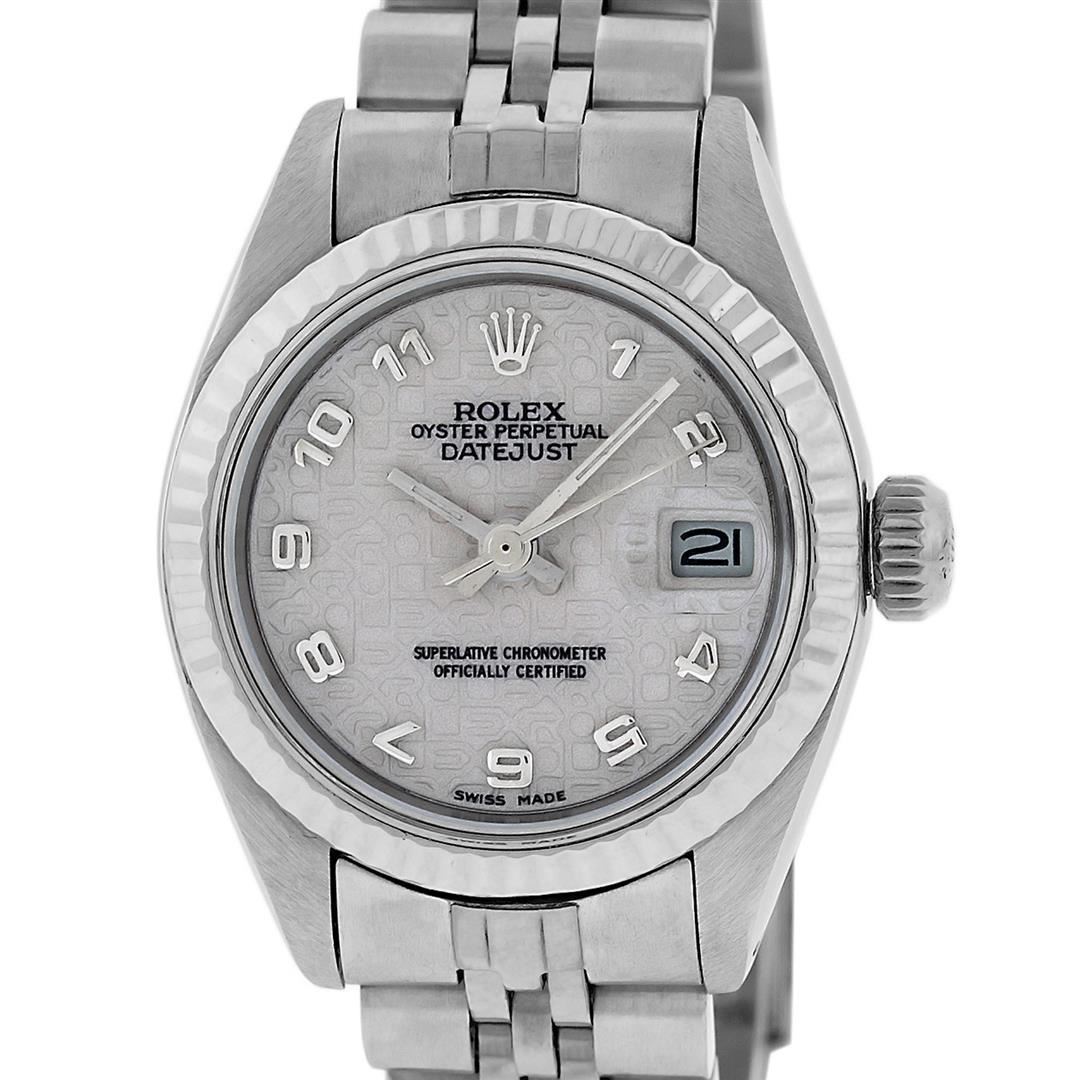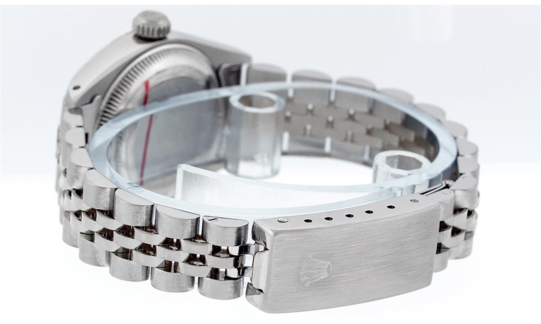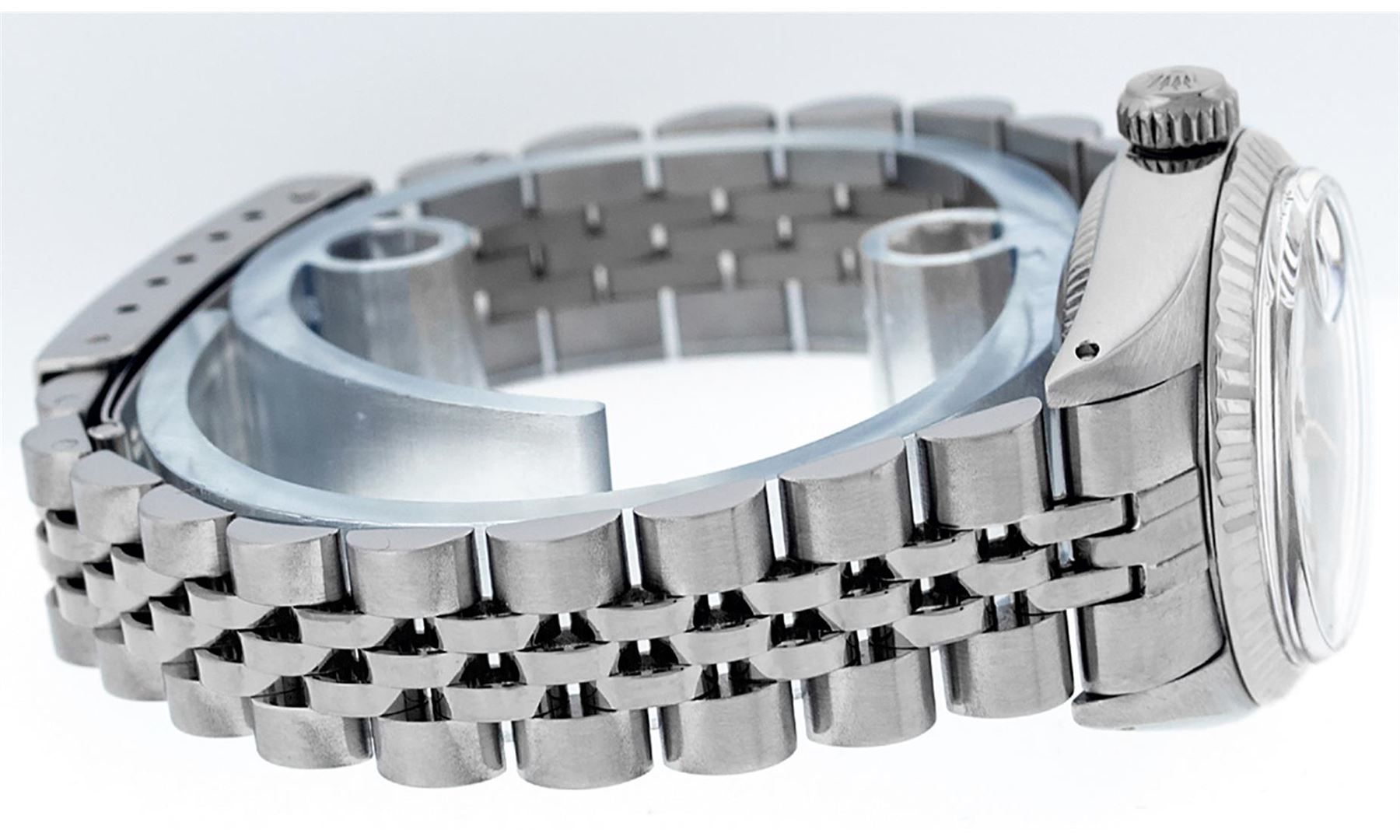 One Womens Pre Owned Midsize Stainless Steel Rolex Datejust Polished, Serviced & Electronically Tested, Rolex Stainless Steel Case Case: 31mm, Rolex Stainless Steel Crown, Rolex Bezel: White Gold Fluted Bezel, Crystal: Sapphire Cyclops Lens. Hands: Solid Hands. Rolex Movement: Automatic Quickset Winding Movement. Rolex Dial: Cream Arabic Dial, Date Window: 3 O'Clock Position Date Display, Quickset, Model: Midsize Datejust. Condition: G-6 Extra Fine. Rolex Bracelet: Stainless Steel Jubilee Band. Bright Polish. 6.0 Inch Length, Adjustable. Standard Clasp, With Rolex Logo. This Watch Has Been Serviced Time Tested And Is In Excellent Condition It Is Free Of All Scratches And Dents.