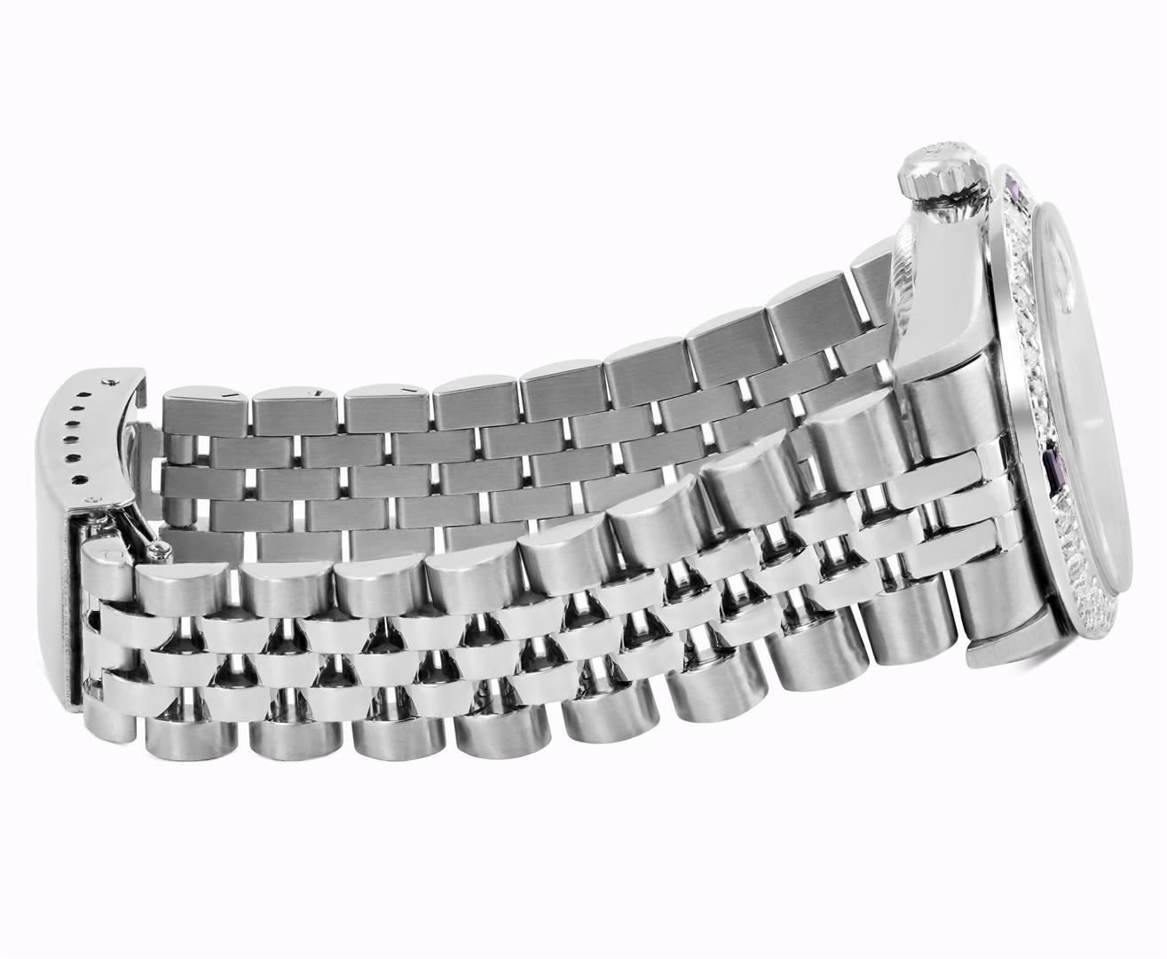 One Rolex Midsize 31MM Quickset Pre Owned Stainless Steel Datejust Wristwatch Polished Bright with Satin Finish, Serviced & Electronically Tested, Stainless Steel Case: 31mm, Stainless Steel Crown, Custom Bezel: New 18K White Gold Sapphire Beadset Diamond Bezel, Diamond + Gem Count: 36 Diamonds + 4 Sapphires, Clarity: SI-VS, Color: G to H. Crystal: Sapphire With Magnified Date Window. Hands: Luminescent Hands. Rolex Movement: Automatic Winding Movement 2235. Rolex Dial: Factory Silver With Index Hour Markers, Lumi Dots, and Roman Track. Date Window: 3 O'Clock Position Date Display, Model: 31MM Quickset Datejust. Condition: G-6 Extra Fine. Rolex Bracelet: Stainless Steel Jubilee Band. Bright Polish & Satin Finish. 6.0 Inch Length, Adjustable. Fold Clasp, With Rolex Logo. This Watch Has Been Serviced Time Tested And Is In Excellent Condition It Is Free Of All Scratches And Dents. This Watch Comes With A Rolex Box.