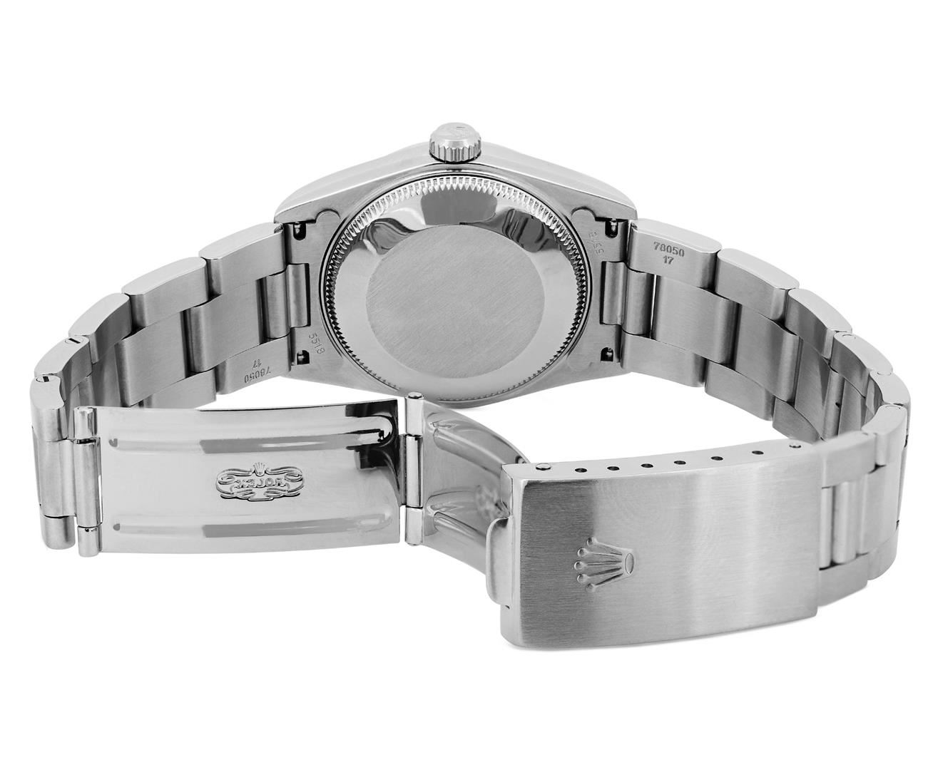 One Rolex Midsize Quickset Pre Owned Stainless Steel Datejust Wristwatch Polished with Satin Finish, Serviced & Electronically Tested, Stainless Steel Case: 31mm, Stainless Steel Crown, 18K White Gold Fluted Bezel. Custom Crystal: New Sapphire With Magnified Date Window. Hands: Luminescent Hands. Rolex Movement: Automatic Winding Movement 2235. Custom Dial: Custom Black Dial With Added Diamond Hour Markers. Date Window: 3 O'Clock Position Date Display, Model: 31MM Quickset Datejust. Condition: G-6 Extra Fine. Rolex Bracelet: Stainless Steel Oyster Band. Bright Polish & Satin Finish. 6.0 Inch Length, Adjustable. Standard Clasp, With Rolex Logo. This Watch Has Been Serviced Time Tested And Is In Excellent Condition It Is Free Of All Scratches And Dents. This Watch Comes With A Rolex Box.
