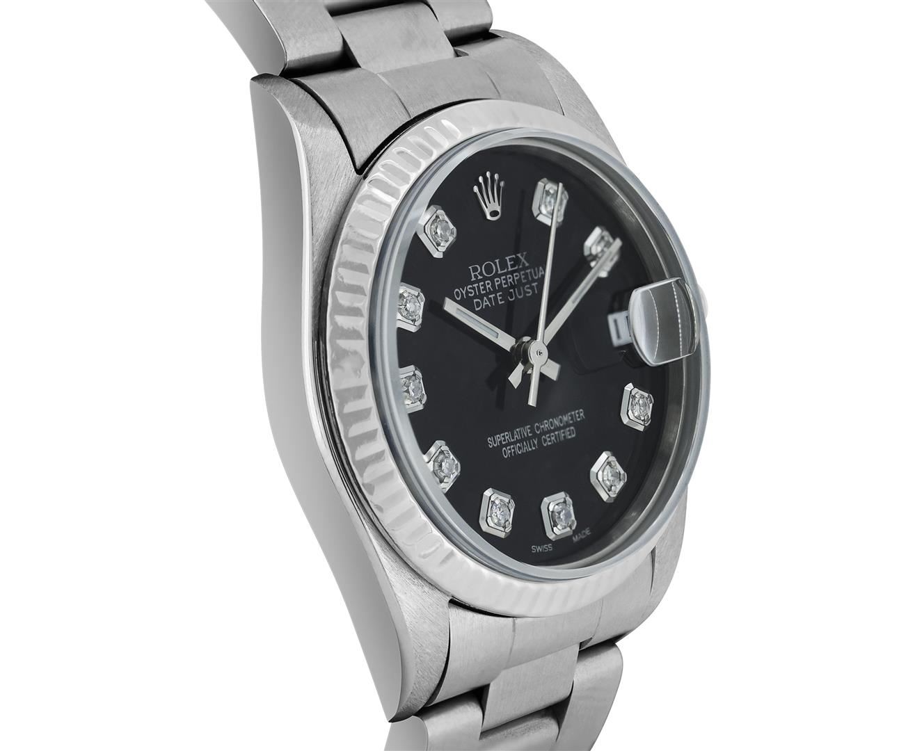 One Rolex Midsize Quickset Pre Owned Stainless Steel Datejust Wristwatch Polished with Satin Finish, Serviced & Electronically Tested, Stainless Steel Case: 31mm, Stainless Steel Crown, 18K White Gold Fluted Bezel. Custom Crystal: New Sapphire With Magnified Date Window. Hands: Luminescent Hands. Rolex Movement: Automatic Winding Movement 2235. Custom Dial: Custom Black Dial With Added Diamond Hour Markers. Date Window: 3 O'Clock Position Date Display, Model: 31MM Quickset Datejust. Condition: G-6 Extra Fine. Rolex Bracelet: Stainless Steel Oyster Band. Bright Polish & Satin Finish. 6.0 Inch Length, Adjustable. Standard Clasp, With Rolex Logo. This Watch Has Been Serviced Time Tested And Is In Excellent Condition It Is Free Of All Scratches And Dents. This Watch Comes With A Rolex Box.
