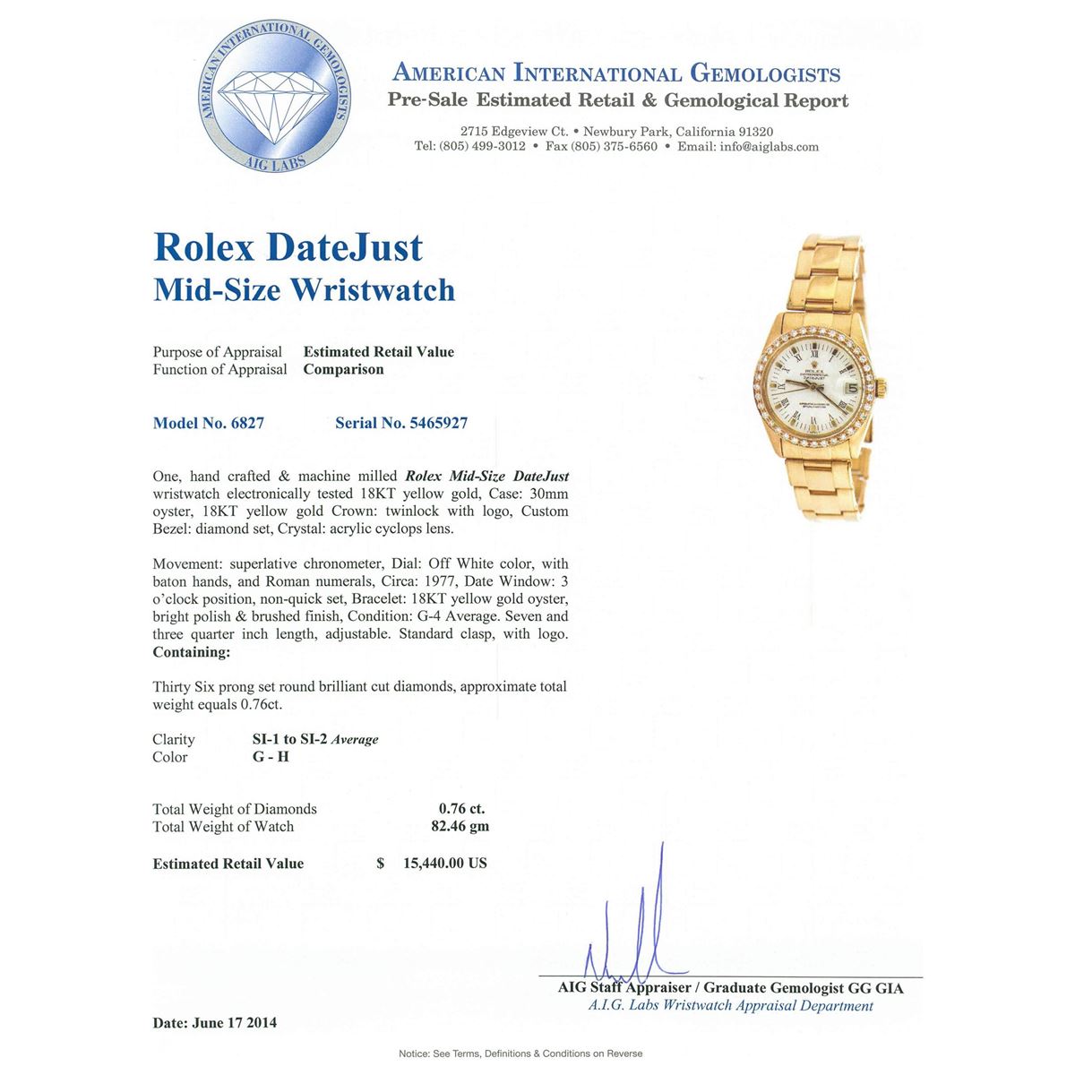 One, hand crafted and machine milled Rolex Mid-Size DateJust wristwatch electronically tested 18KT Yellow Gold, Case 30mm oyster, 18KT yellow gold Crown: twinlock with logo, Custom bezel: diamond set, Crystal: acrylic cyclops lens. Movement: superlative chronometer, Dial: Off White color, with baton hands, and Roman numerals, Circa 1977, Date Window: 3 o'clock position, non-quick set, Bracelet: 18KT yellow gold oyster, bright polish and brushed finish, Condition: G-4 Average. Seven and three quarter inch length, adjustable. Standard clasp, with logo. Containing: Thirty Six prong set round brilliant cut diamonds, approximate total weight equals 0.76ct. Clarity SI-1 to SI-2 Average. Color G-H. Total Weight of Diamonds 0.76ct. Total Weight of Watch 82.46 grams. AIG Appraised at $15,440.00.