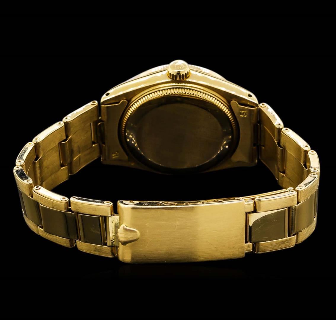 One, hand crafted and machine milled Rolex Mid-Size DateJust wristwatch electronically tested 18KT Yellow Gold, Case 30mm oyster, 18KT yellow gold Crown: twinlock with logo, Custom bezel: diamond set, Crystal: acrylic cyclops lens. Movement: superlative chronometer, Dial: Off White color, with baton hands, and Roman numerals, Circa 1977, Date Window: 3 o'clock position, non-quick set, Bracelet: 18KT yellow gold oyster, bright polish and brushed finish, Condition: G-4 Average. Seven and three quarter inch length, adjustable. Standard clasp, with logo. Containing: Thirty Six prong set round brilliant cut diamonds, approximate total weight equals 0.76ct. Clarity SI-1 to SI-2 Average. Color G-H. Total Weight of Diamonds 0.76ct. Total Weight of Watch 82.46 grams. AIG Appraised at $15,440.00.