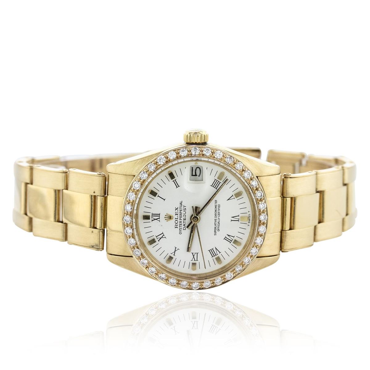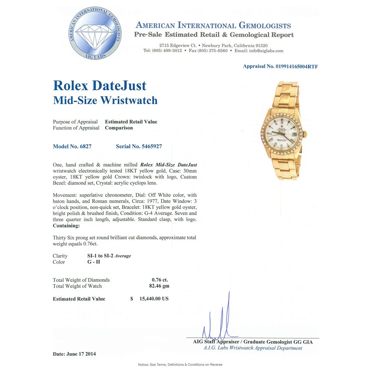 One, hand crafted and machine milled Rolex Mid-Size DateJust wristwatch electronically tested 18KT Yellow Gold, Case 30mm oyster, 18KT yellow gold Crown: twinlock with logo, Custom bezel: diamond set, Crystal: acrylic cyclops lens. Movement: superlative chronometer, Dial: Off White color, with baton hands, and Roman numerals, Circa 1977, Date Window: 3 o'clock position, non-quick set, Bracelet: 18KT yellow gold oyster, bright polish and brushed finish, Condition: G-4 Average. Seven and three quarter inch length, adjustable. Standard clasp, with logo. Containing: Thirty Six prong set round brilliant cut diamonds, approximate total weight equals 0.76ct. Clarity SI-1 to SI-2 Average. Color G-H. Total Weight of Diamonds 0.76ct. Total Weight of Watch 82.46 grams. AIG Appraised at $15,440.00.