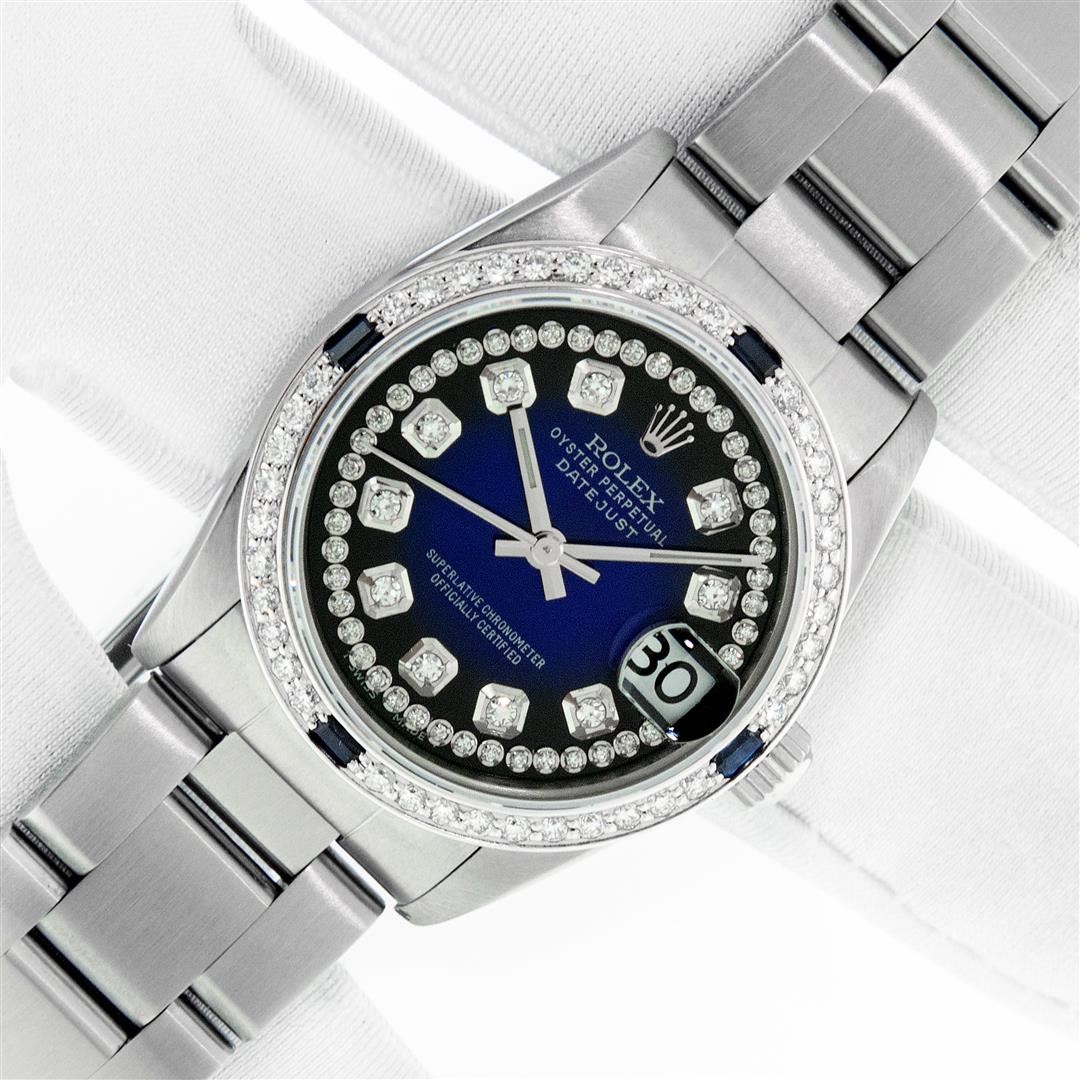 One Women's Midsize Stainless Steel Rolex Datejust Polished, Serviced & Electronically Tested, Rolex Stainless Steel Case : 31mm, Rolex Stainless Steel Crown, Custom Bezel: New 18K White Gold Sapphire Beadset Diamond Bezel, Diamond Count: 40 Diamonds + 4 Sapphires On Bezel, Color: G To H, Clarity: VS2-SI1. Custom Crystal: New Sapphire With Magnified Date Window. Custom Hands: New Luminescent Hands. Rolex Movement: Automatic Winding Movement Caliber 2235. Custom Dial: Refinished To Blue With Custom Added Diamond Hour Markers. Diamond Count: 43 Single Diamonds On Dial; Color: G to H, Clarity: VS2-SI1, Date Window: 3 O'clock Position Date Display, Quickset, Model: Midsize Datejust. Condition: G-6 Extra Fine. Rolex Bracelet: Stainless Steel Oyster Band. Bright Polish. 6.0 Inch Length, Adjustable. Standard Clasp, With Rolex Logo. This Pre Owned Watch Has Been Serviced Time Tested And Is In Excellent Condition It Is Free Of All Scratches And Dents. This Watch Comes With A Rolex Box.