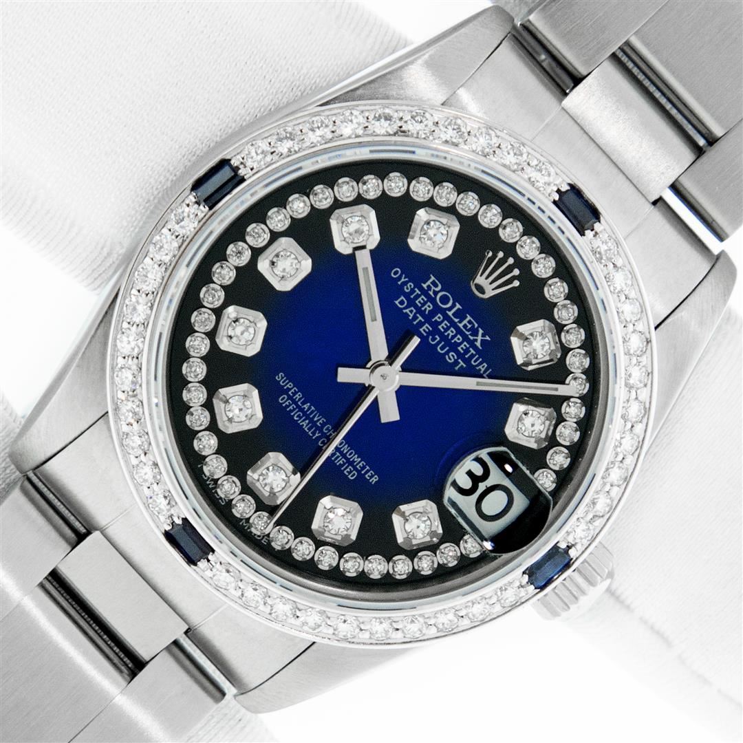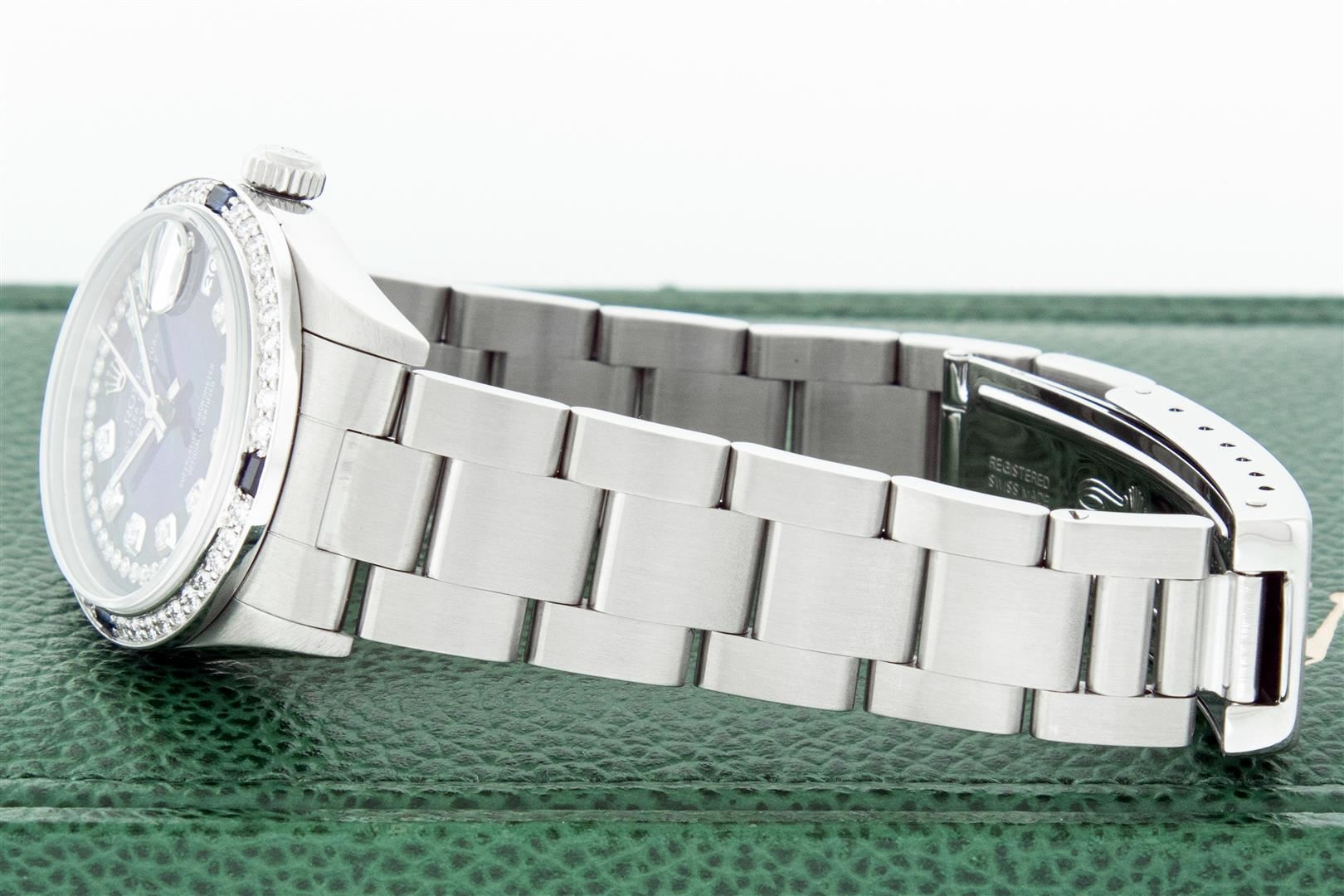 One Women's Midsize Stainless Steel Rolex Datejust Polished, Serviced & Electronically Tested, Rolex Stainless Steel Case : 31mm, Rolex Stainless Steel Crown, Custom Bezel: New 18K White Gold Sapphire Beadset Diamond Bezel, Diamond Count: 40 Diamonds + 4 Sapphires On Bezel, Color: G To H, Clarity: VS2-SI1. Custom Crystal: New Sapphire With Magnified Date Window. Custom Hands: New Luminescent Hands. Rolex Movement: Automatic Winding Movement Caliber 2235. Custom Dial: Refinished To Blue With Custom Added Diamond Hour Markers. Diamond Count: 43 Single Diamonds On Dial; Color: G to H, Clarity: VS2-SI1, Date Window: 3 O'clock Position Date Display, Quickset, Model: Midsize Datejust. Condition: G-6 Extra Fine. Rolex Bracelet: Stainless Steel Oyster Band. Bright Polish. 6.0 Inch Length, Adjustable. Standard Clasp, With Rolex Logo. This Pre Owned Watch Has Been Serviced Time Tested And Is In Excellent Condition It Is Free Of All Scratches And Dents. This Watch Comes With A Rolex Box.