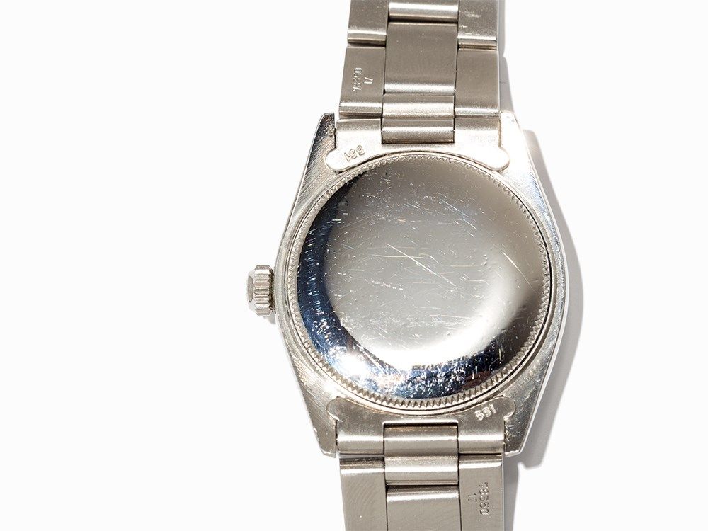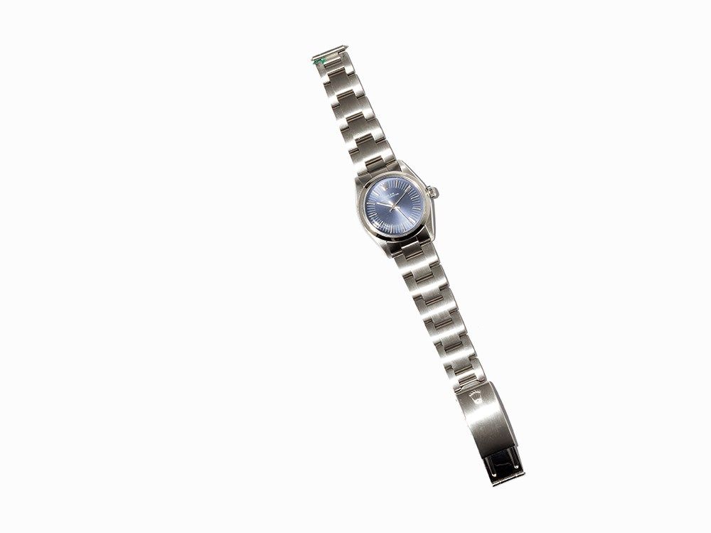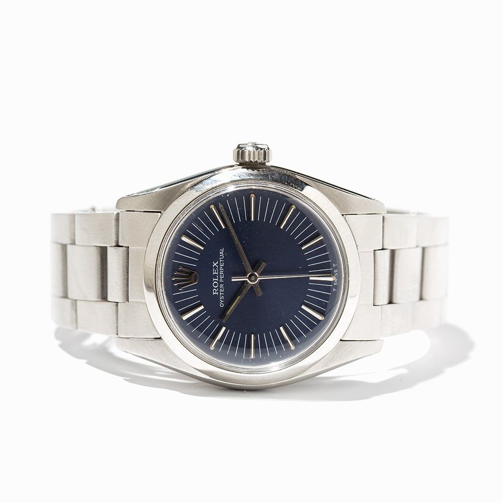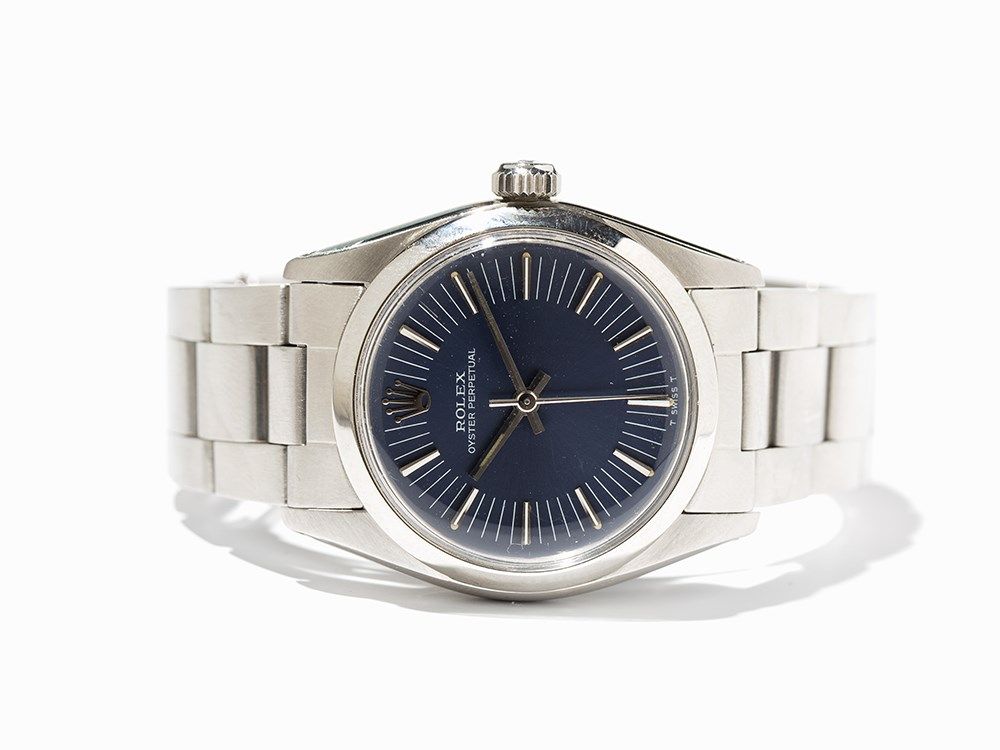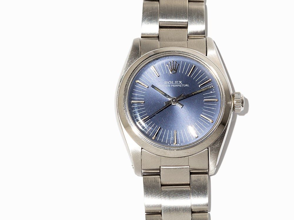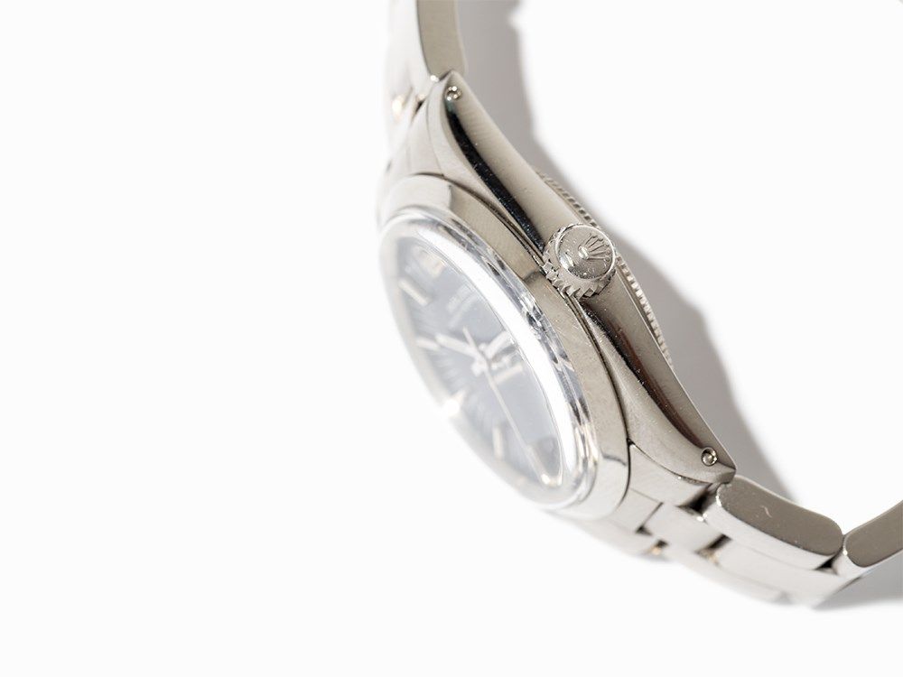 This Rolex Midsize Oyster Perpetual wristwatch, ref. 6748, was made in Switzerland around 1980. The watch is fitted with an automatic movement Rolex calibre and displays hour, minute and second. The blue dial shows silver hands. The watch case, strap and folding clasp are made of stainless steel. The watch case number is 4193166.