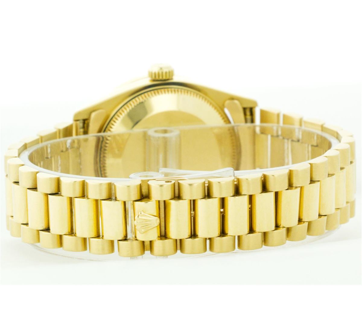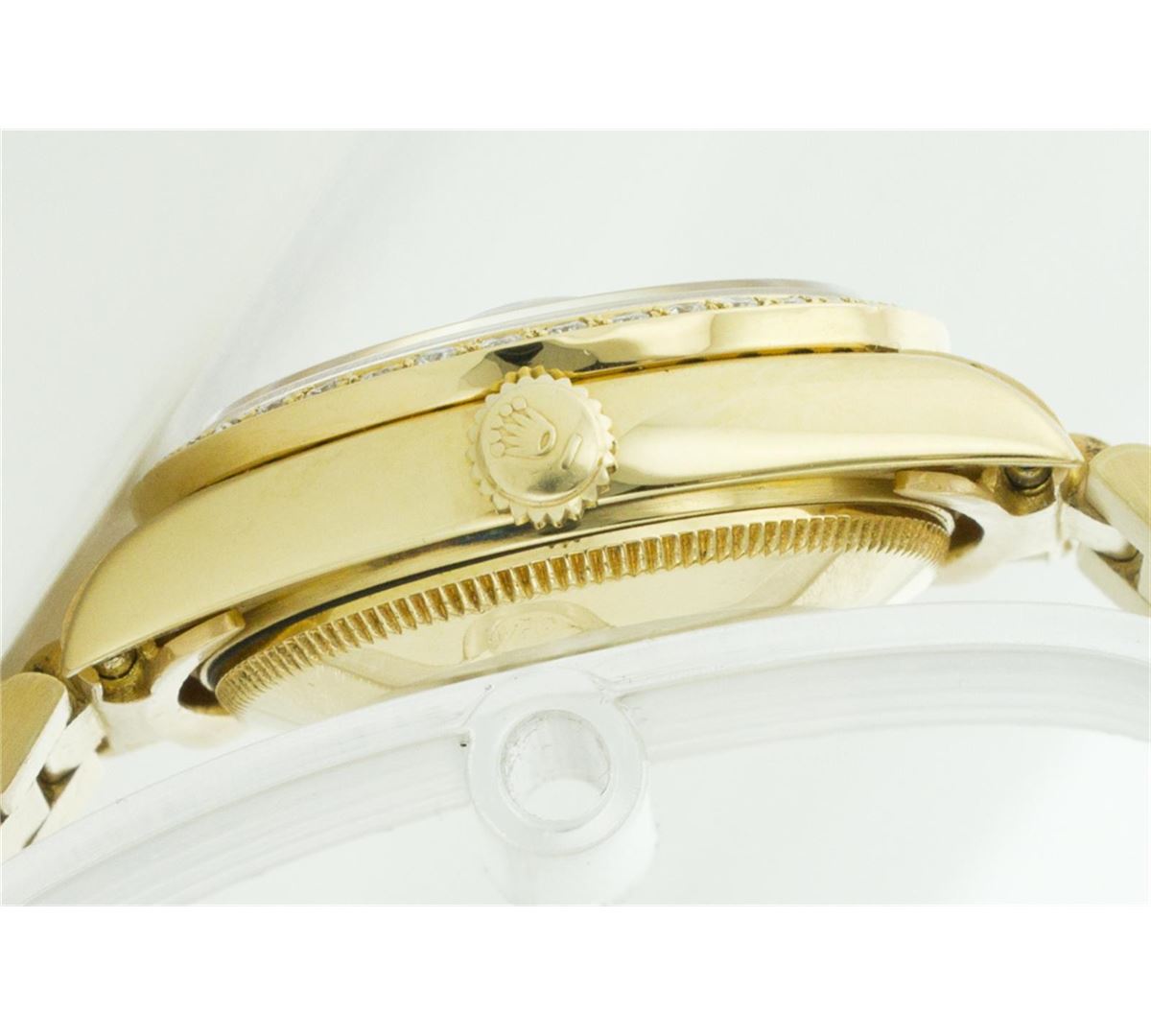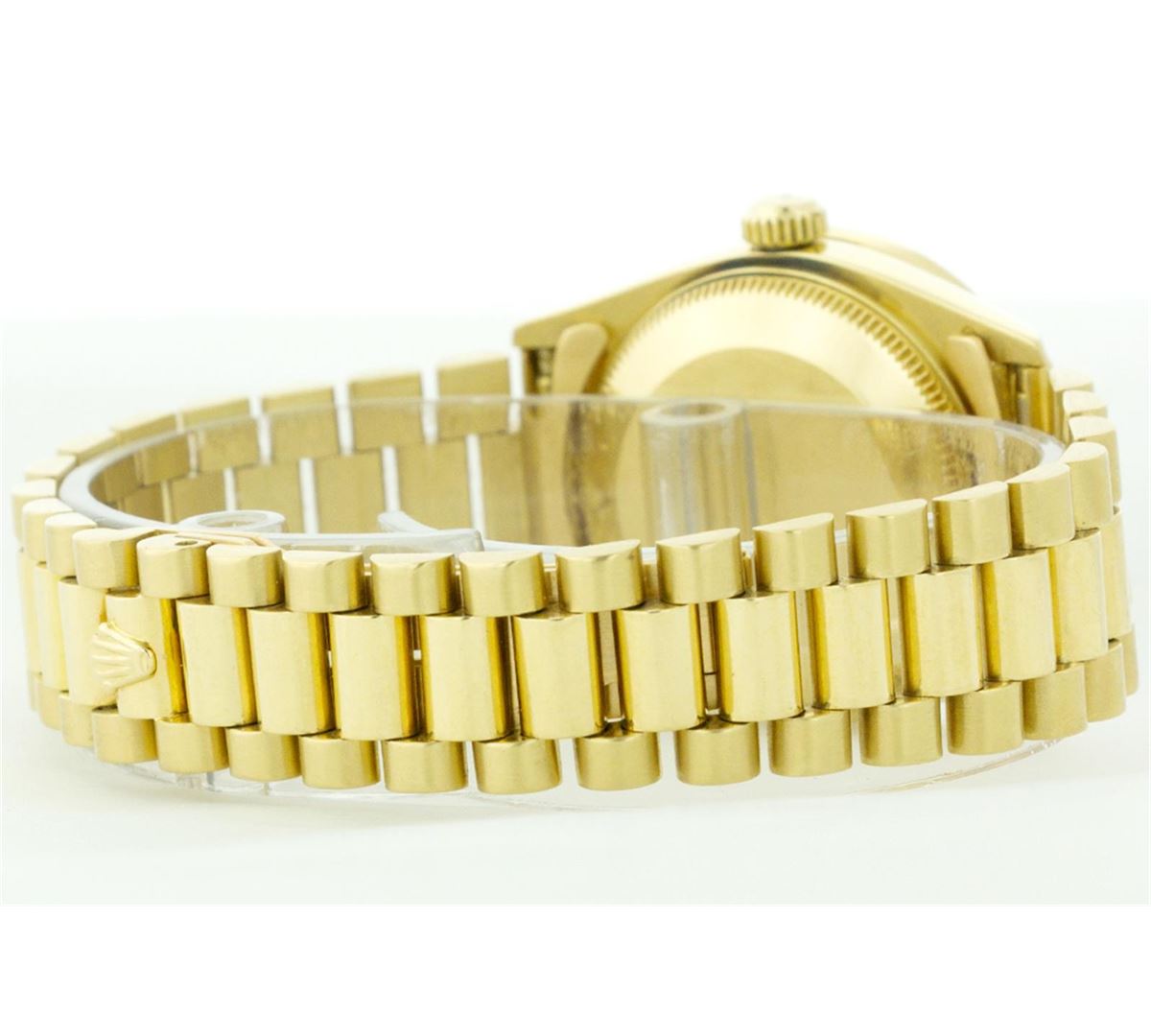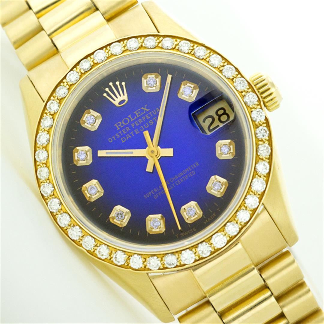 One Midsize 18K Yellow Gold Rolex Datejust President Polished Bright with Satin Finish, Serviced & Electronically Tested, Yellow Gold Case:31mm, Yellow Gold Crown, Custom Bezel: 18K Yellow Gold Beadset Diamond Bezel, Diamond Count: 40 Diamonds Total Weight .80 Carat, Clarity: SI-VS, Color: G to H. Custom Crystal: Synthetic Sapphire Cyclops Lens. Movement: Automatic Winding Movement Caliber 2135. Custom Dial: Blue Vignette Dial with Diamond Hour Markers. Clarity: SI-VS, Color: G to H. Date Window: 3 O'Clock Position Date Display, Model: 68278, Quickset Condition: G-6 Extra Fine. Bracelet: 18K Yellow Gold President Band. Bright Polish & Satin Finish. 5.5 Inch Length, Adjustable. Standard Clasp, With Rolex Logo.