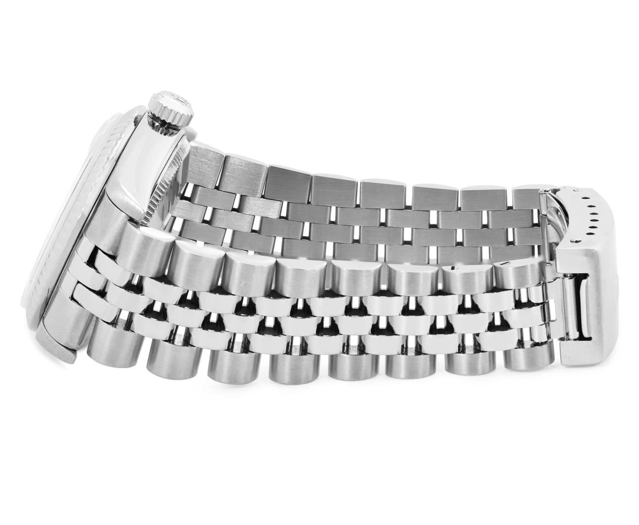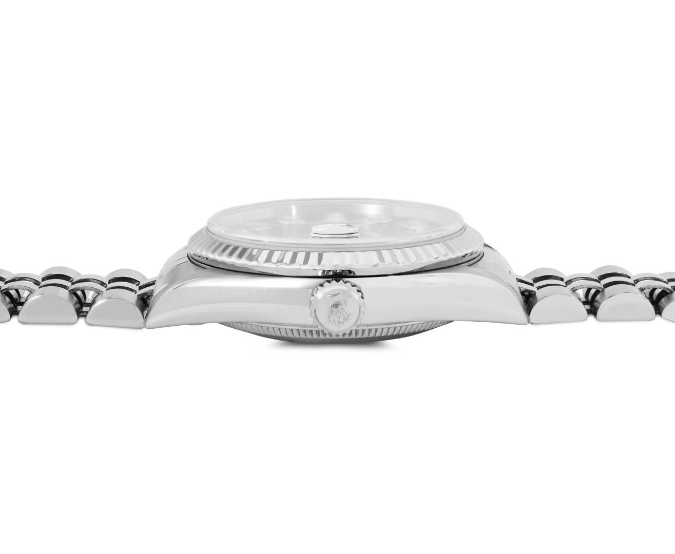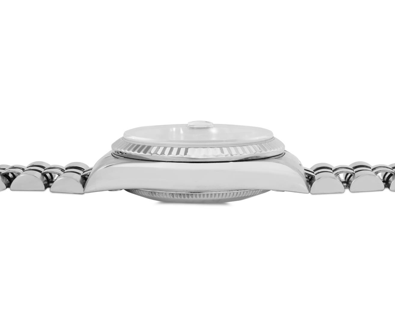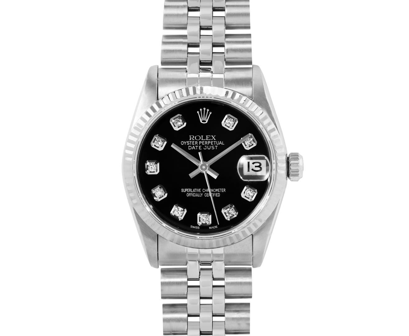 One Rolex Midsize Quickset Pre Owned Stainless Steel Datejust Wristwatch Polished with Satin Finish, Serviced And Electronically Tested, Stainless Steel Case: 31mm, Stainless Steel Crown, 18K White Gold Fluted Bezel. Custom Crystal: New Sapphire With Magnified Date Window. Custom Hands: New Solid Hands. Rolex Movement: Automatic Winding Movement 2235. Custom Dial: Custom Black Dial With Added Diamond Hour Markers, Diamond Count: 10 Diamonds On Dial. Date Window: 3 O'Clock Position Date Display, Model: 31MM Quickset Datejust. Condition: G-6 Extra Fine. Rolex Bracelet: Stainless Steel Jubilee Band. Bright Polish And Satin Finish. 6.0 Inch Length, Adjustable. Standard Clasp, With Rolex Logo. This Watch Has Been Serviced Time Tested And Is In Excellent Condition It Is Free Of All Scratches And Dents. This Watch Comes With A Rolex Box.