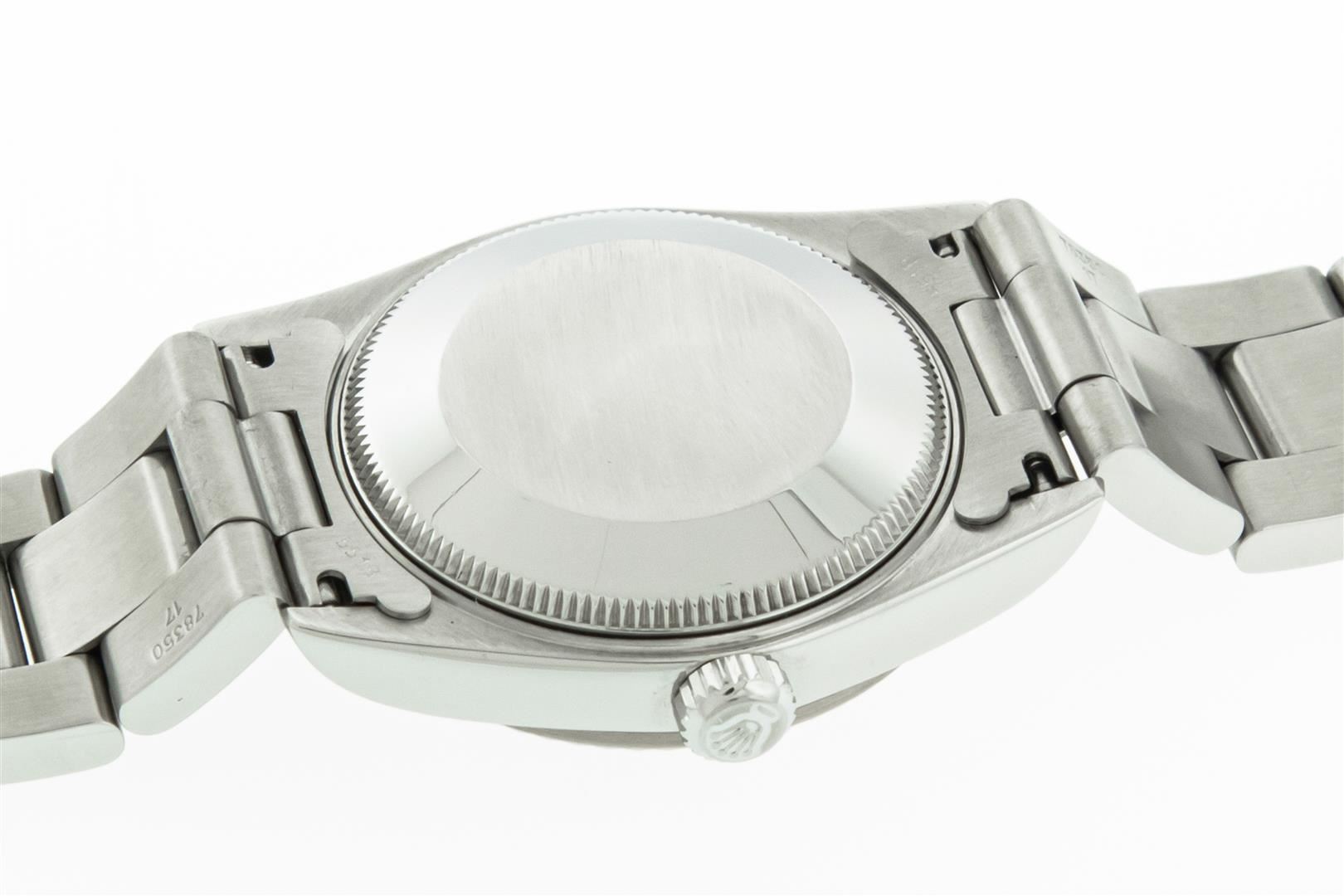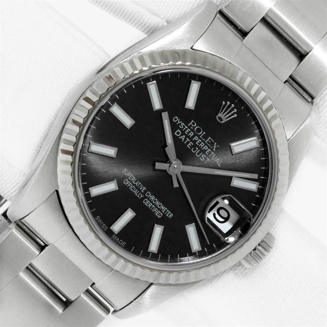 One Women's Midsize Stainless Steel Rolex Datejust Polished, Serviced & Electronically Tested, Rolex Stainless Steel case: 31mm, Rolex Stainless Steel Crown, Bezel: 18K White Gold Fluted Bezel, Custom Crystal: New Sapphire with Magnified Date Window. Custom Hands: New Luminescent Hands. Rolex Movement: Automatic Winding Movement Caliber 2235. Custom Dial: Black with Index Hour Markers, Date Window: 3 O'Clock Position Date Display, Quickset, Model: Midsize Datejust. Condition: G-6 Extra Fine. Rolex Bracelet: Stainless Steel Oyster Band. Bright Polish. 6.0 Inch Length, Adjustable. Standard Clasp, with Rolex Logo. This Pre Owned Watch Has Been Serviced Time Tested And Is In Excellent Condition It Is Free Of All Scratches And Dents.