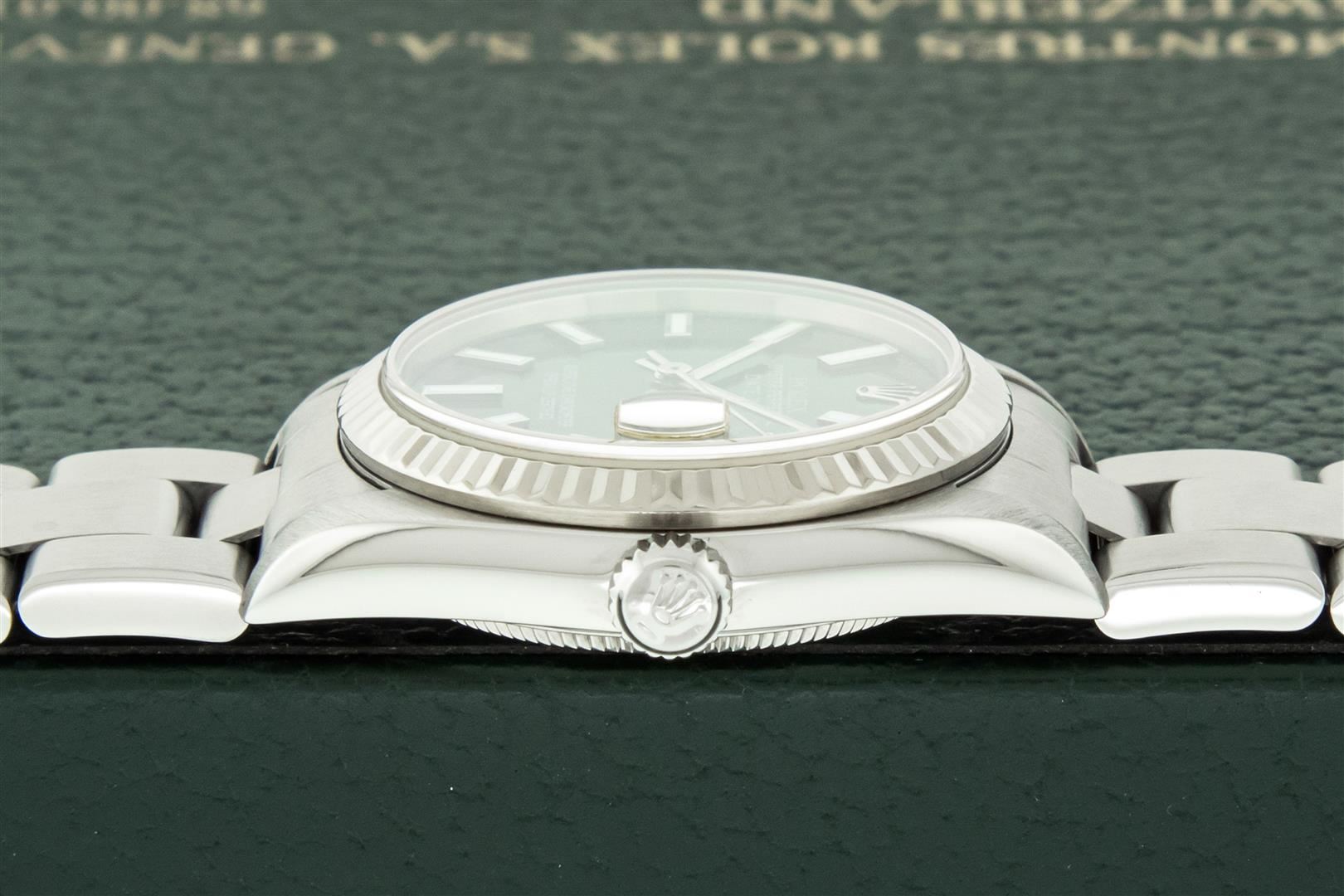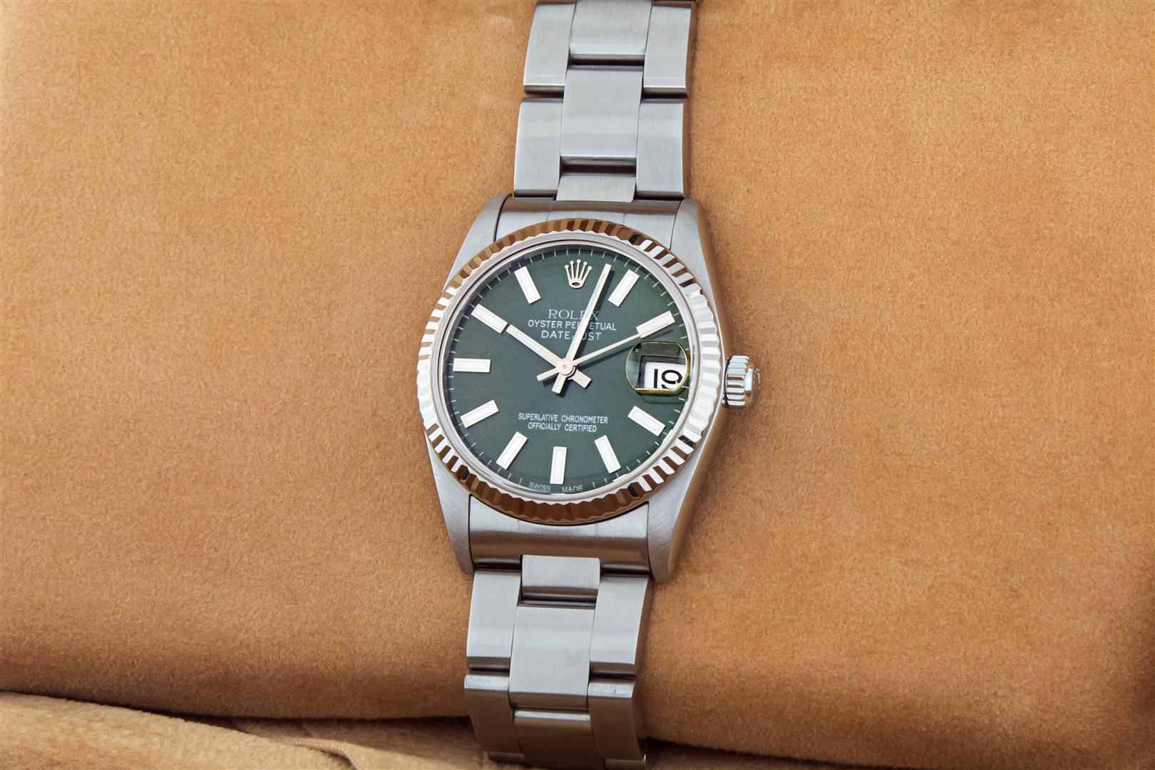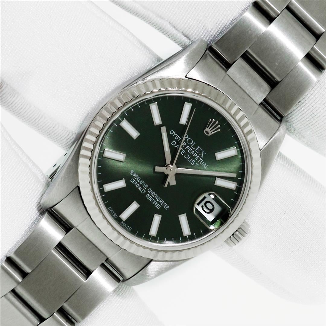 One Women's Midsize Stainless Steel Rolex Datejust Polished, Serviced & Electronically Tested, Rolex Stainless Steel Case : 31mm, Rolex Stainless Steel Crown, Bezel: 18K White Gold Fluted Bezel, Custom Crystal: New Sapphire With Magnified Date Window. Custom Hands: New Luminescent Hands. Rolex Movement: Automatic Winding Movement Caliber 2235. Custom Dial: Green With Index Hour Markers, Date Window: 3 O'clock Position Date Display, Quickset, Model: Midsize Datejust. Condition: G-6 Extra Fine. Rolex Bracelet: Stainless Steel Oyster Band. Bright Polish. 6.0 Inch Length, Adjustable. Standard Clasp, With Rolex Logo. This Pre Owned Watch Has Been Serviced Time Tested And Is In Excellent Condition It Is Free Of All Scratches And Dents. This Watch Comes With A Rolex Box.