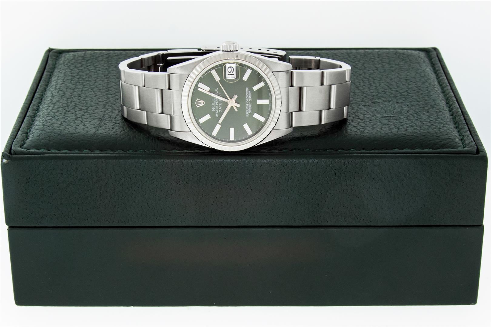 One Women's Midsize Stainless Steel Rolex Datejust Polished, Serviced & Electronically Tested, Rolex Stainless Steel Case : 31mm, Rolex Stainless Steel Crown, Bezel: 18K White Gold Fluted Bezel, Custom Crystal: New Sapphire With Magnified Date Window. Custom Hands: New Luminescent Hands. Rolex Movement: Automatic Winding Movement Caliber 2235. Custom Dial: Green With Index Hour Markers, Date Window: 3 O'clock Position Date Display, Quickset, Model: Midsize Datejust. Condition: G-6 Extra Fine. Rolex Bracelet: Stainless Steel Oyster Band. Bright Polish. 6.0 Inch Length, Adjustable. Standard Clasp, With Rolex Logo. This Pre Owned Watch Has Been Serviced Time Tested And Is In Excellent Condition It Is Free Of All Scratches And Dents. This Watch Comes With A Rolex Box.