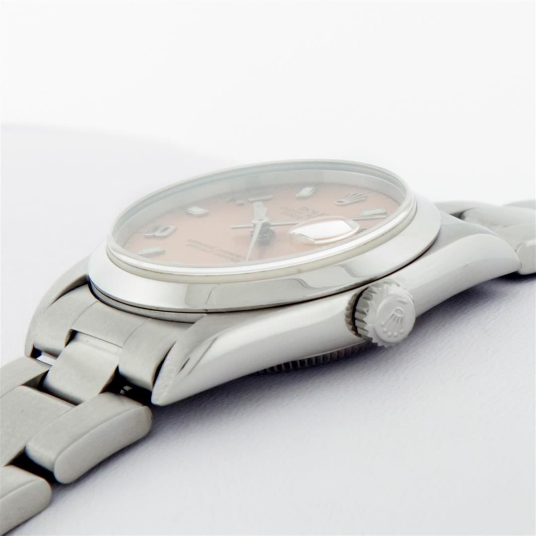 One Women's Pre Owned Midsize Stainless Steel Rolex Datejust Polished, Serviced & Electronically Tested, Rolex Stainless Steel case : 31mm, Rolex Stainless Steel Crown, Rolex Bezel: 18K White Gold Fluted Bezel, Crystal: Sapphire With Cyclops Lens. Hands: Lumi Hands. Rolex Movement: Automatic Winding Movement. Rolex Dial: Factory Salmon Arabic Dial With Index Hour Markers. Date Window: 3 O'Clock Position Date Display, Quickset, Model: Midsize Datejust. Condition: G-6 Extra Fine. Rolex Bracelet: Stainless Steel Oyster Band. Bright Polish. 6.0 Inch Length, Adjustable. Standard Clasp, With Rolex Logo. This Watch Has Been Serviced Time Tested And Is In Excellent Condition It Is Free Of All Scratches And Dents.