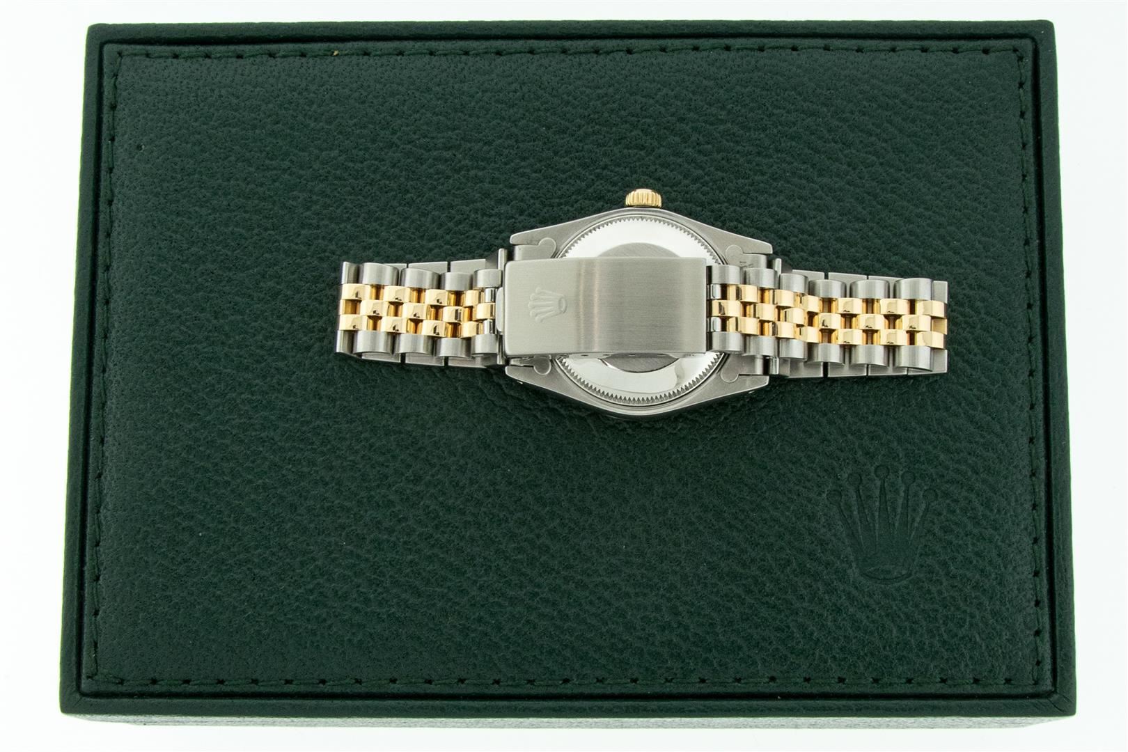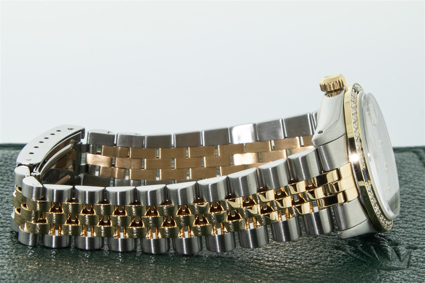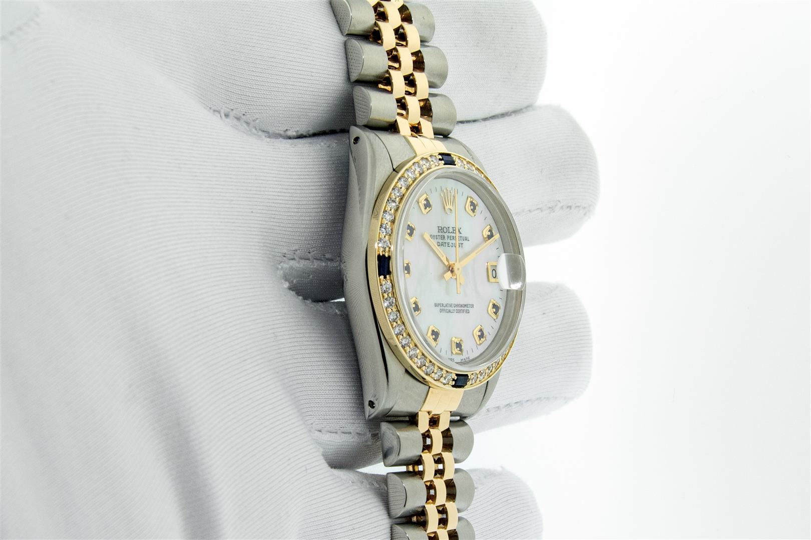One Women's Midsize Stainless Steel and Yellow Gold Rolex Datejust Polished, Serviced & Electronically Tested, Stainless Steel case: 31mm, Stainless Steel Crown, Custom Bezel: New 18K Yellow Gold Sapphire Beadset Diamond Bezel, Diamond Count: 40 Diamonds + 4 Sapphires On Bezel, Color: G To H, Clarity: VS2-SI1. Custom Crystal: New Sapphire with Date Window. Custom Hands: New Luminescent Hands. Rolex Movement: Automatic Winding Movement Caliber 2235. Custom Dial: MOP Sapphire Dial. Stone Count: 10 Round Sapphire On Dial; Date Window: 3 O'Clock Position Date Display, Quickset, Model: Midsize Datejust. Condition: G-6 Extra Fine. Rolex Bracelet: Stainless Steel and Yellow Gold Jubilee Band. Bright Polish. 6.0 Inch Length, Adjustable. Standard Clasp, with Rolex Logo. This Watch Has Been Serviced Time Tested And Is In Excellent Condition It Is Free Of All Scratches And Dents.