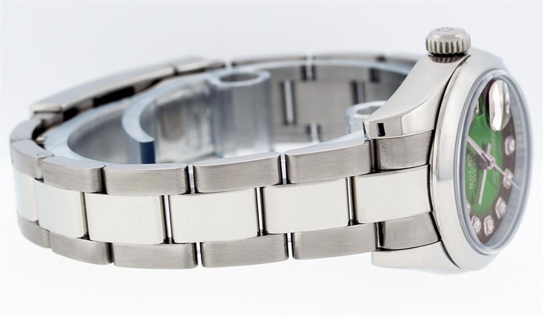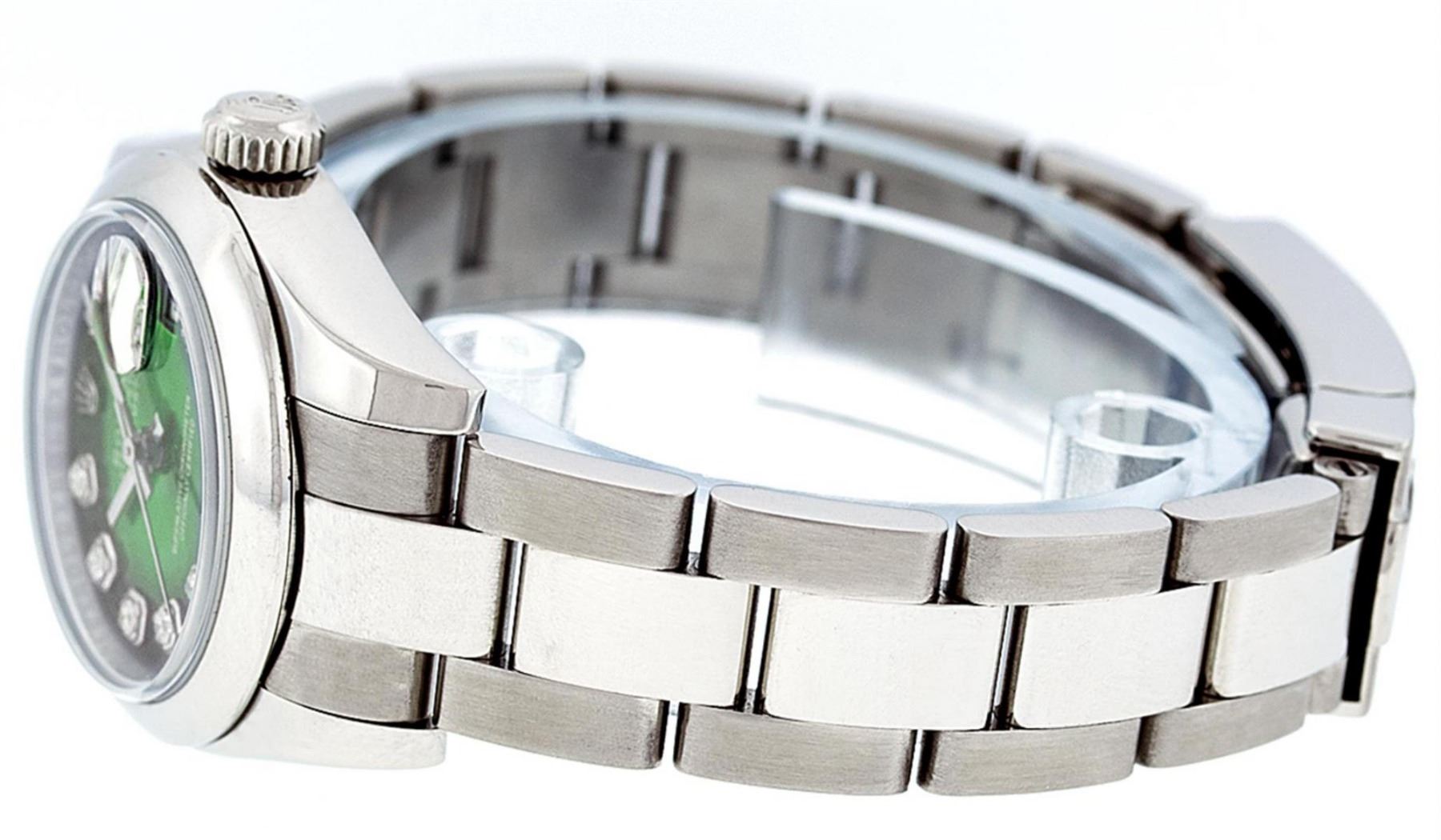 One Ladies Quickset Stainless Steel Rolex Datejust Polished Bright with Satin Finish, Serviced & Electronically Tested, Stainless Steel Case: 26mm, Stainless Steel Crown, Bezel: Stainless Steel Smooth Bezel. Custom Crystal: New Scratch Resistant Sapphire Cyclops Lens. Custom Hands: New Luminescent Hands. Movement: Automatic Winding Movement. Custom Dial: Green Vignette Single Cut VS Diamond Dial, Diamond Count: 10 Single Cut Diamonds In Dial, Color: G to H, Clarity: VS. Date Window: 3 O'Clock Position Date Display, Model: 179160 Quickset Datejust. Condition: G-6 Extra Fine. Bracelet: Stainless Steel Oyster Band. Bright Polish & Satin Finish. 6.0 Inch Length, Adjustable. Standard Clasp, With Rolex Logo. This Watch Has Been Serviced Time Tested And Is In Excellent Condition It Is Free Of All Scratches And Dents.