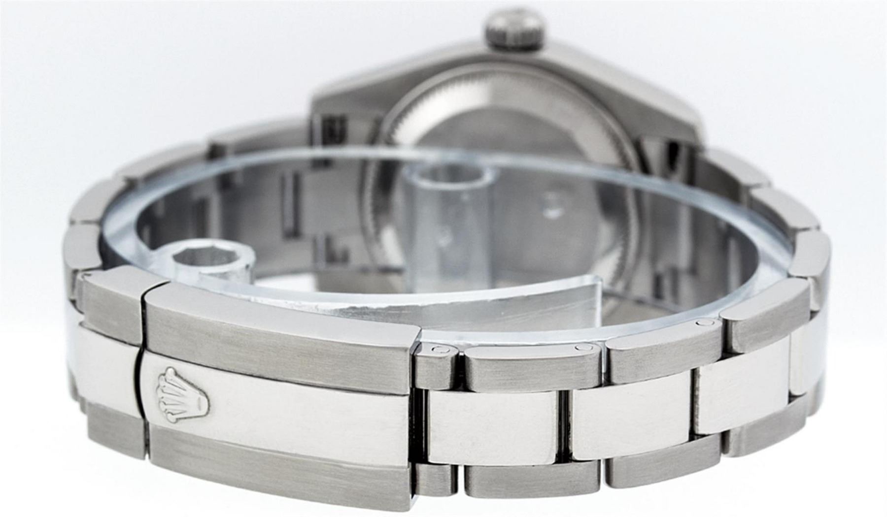 One Ladies Quickset Stainless Steel Rolex Datejust Polished Bright with Satin Finish, Serviced & Electronically Tested, Stainless Steel Case: 26mm, Stainless Steel Crown, Bezel: Stainless Steel Smooth Bezel. Custom Crystal: New Scratch Resistant Sapphire Cyclops Lens. Custom Hands: New Luminescent Hands. Movement: Automatic Winding Movement. Custom Dial: Green Vignette Single Cut VS Diamond Dial, Diamond Count: 10 Single Cut Diamonds In Dial, Color: G to H, Clarity: VS. Date Window: 3 O'Clock Position Date Display, Model: 179160 Quickset Datejust. Condition: G-6 Extra Fine. Bracelet: Stainless Steel Oyster Band. Bright Polish & Satin Finish. 6.0 Inch Length, Adjustable. Standard Clasp, With Rolex Logo. This Watch Has Been Serviced Time Tested And Is In Excellent Condition It Is Free Of All Scratches And Dents.