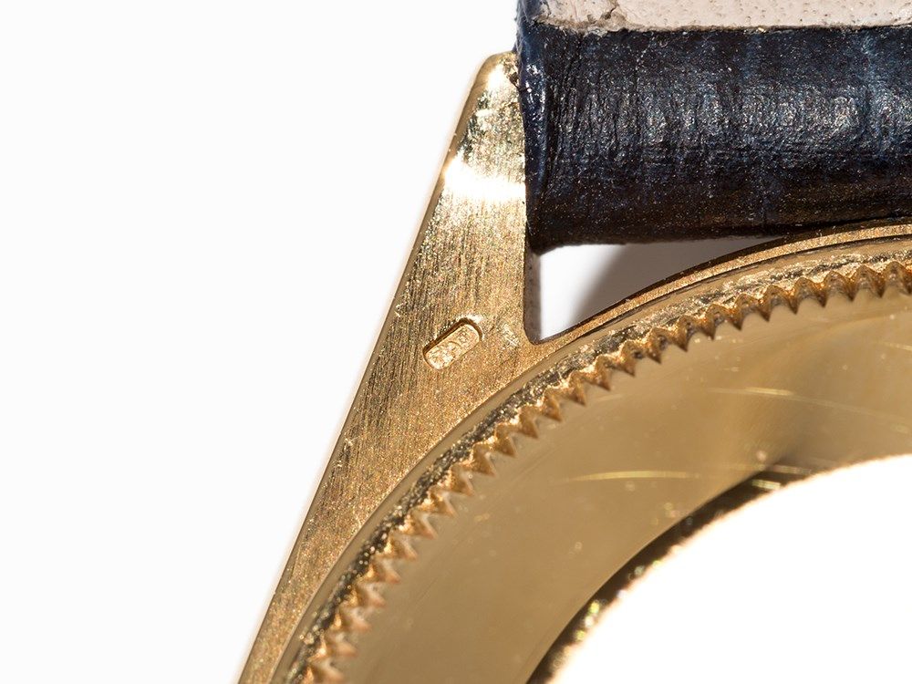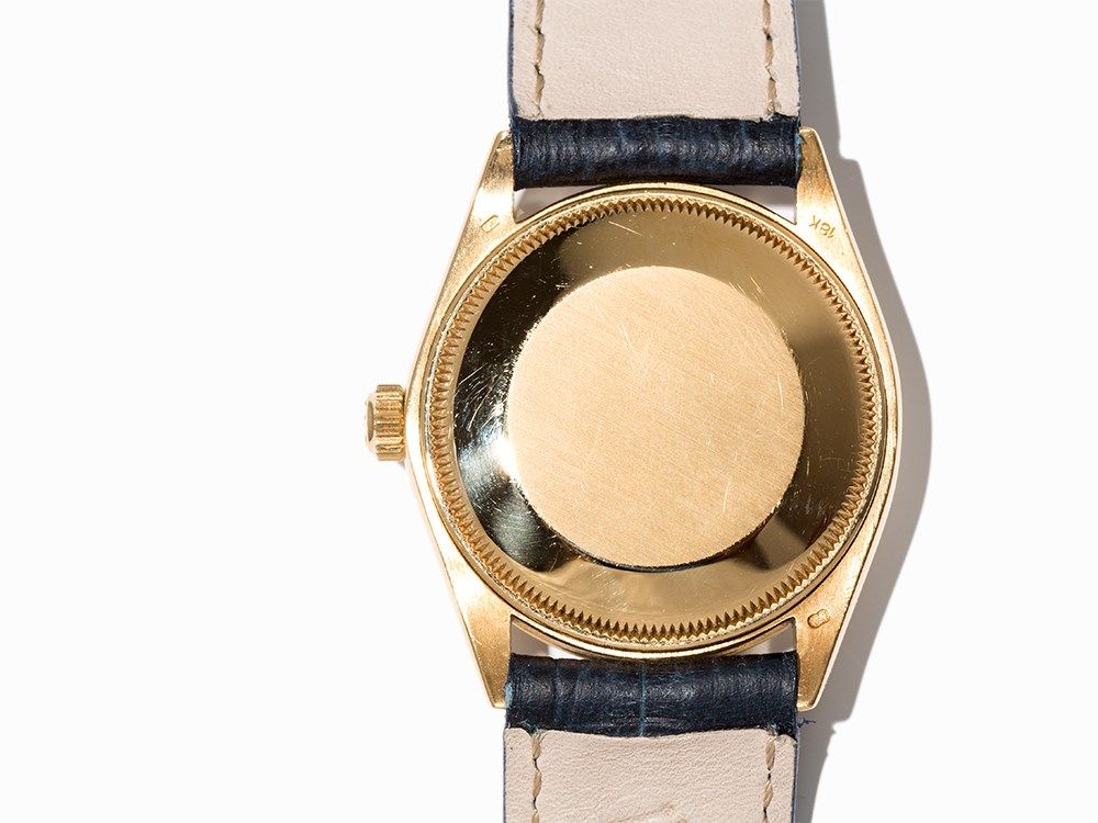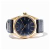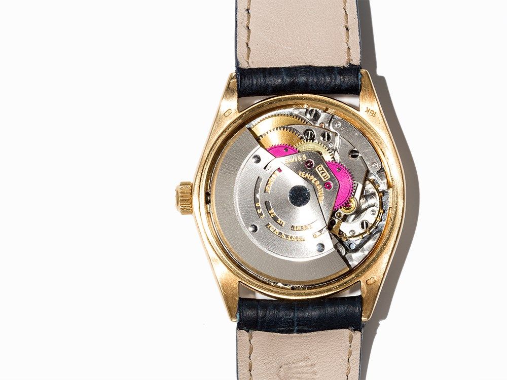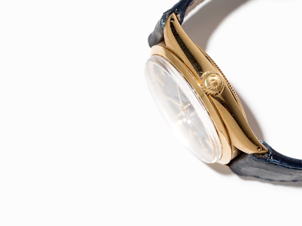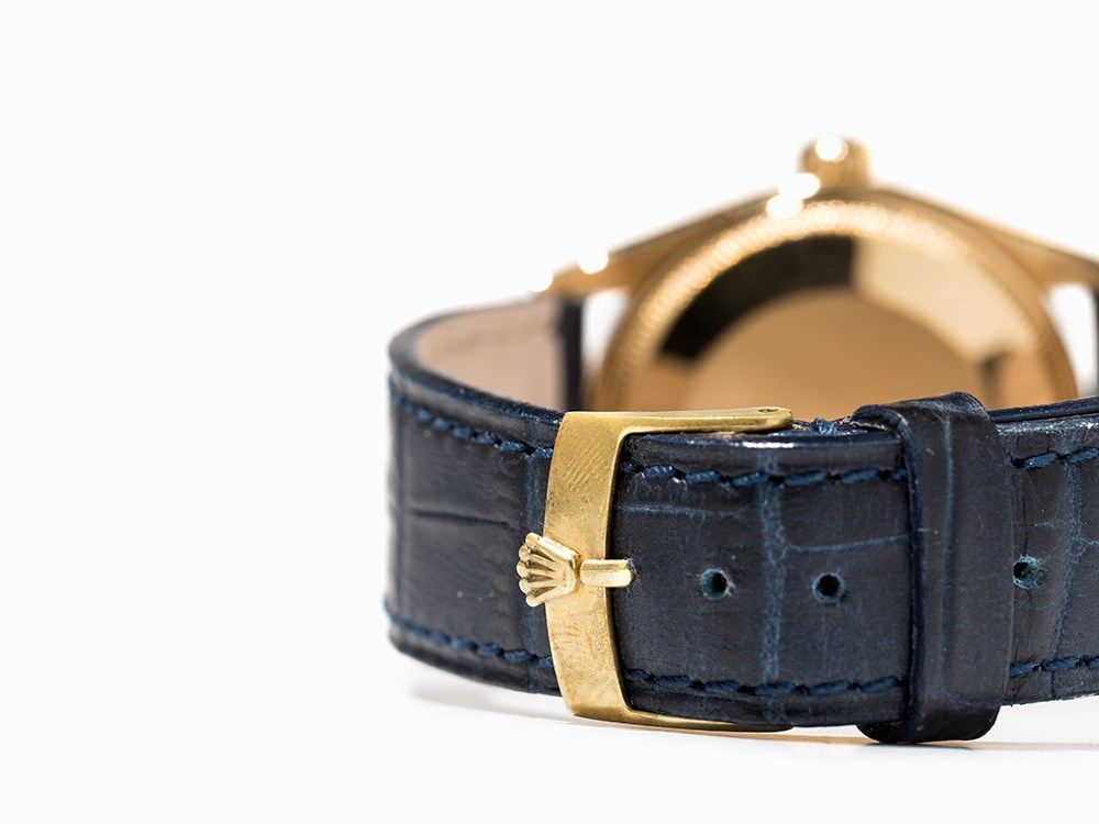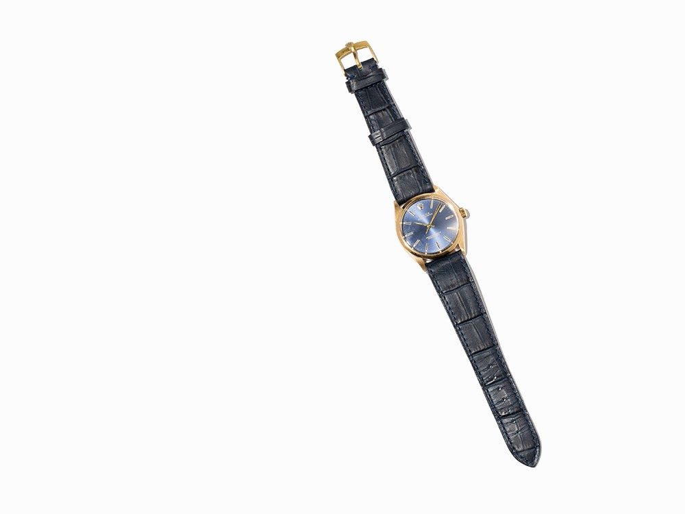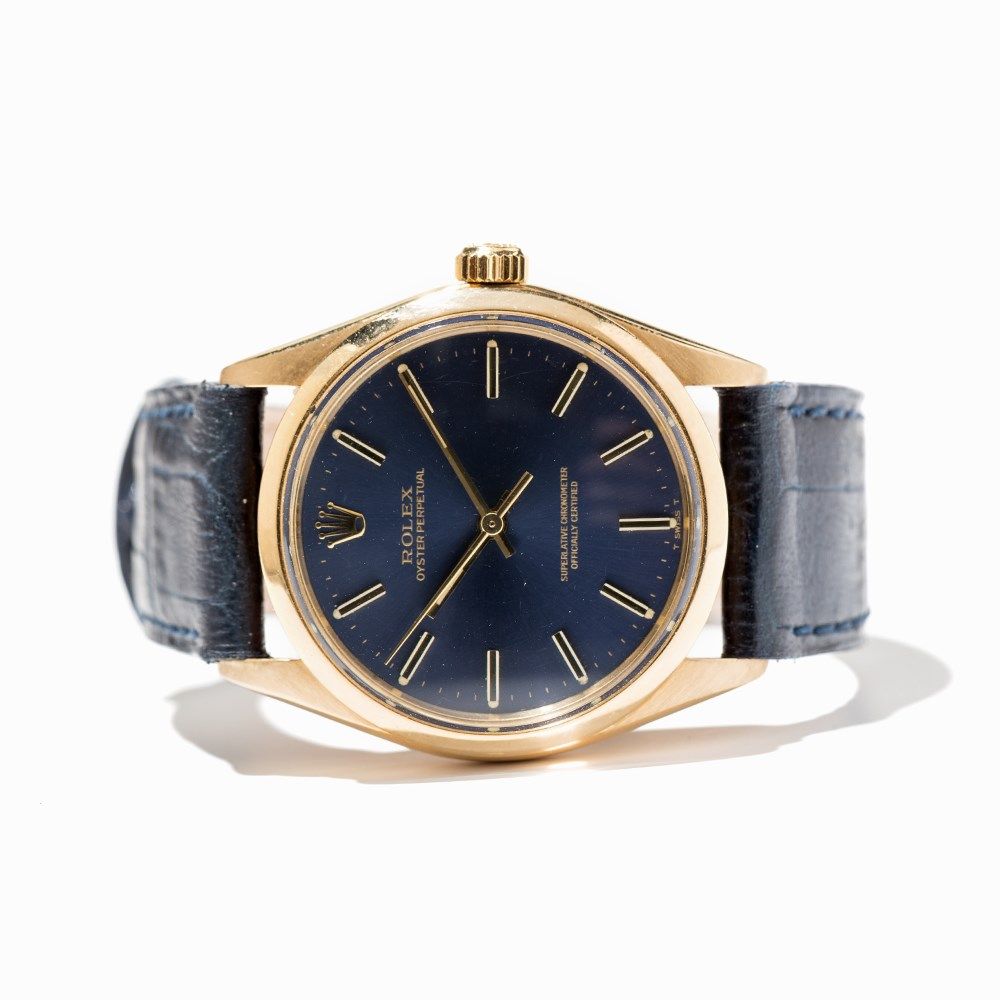 This Rolex Oyster Perpetual chronometer, ref. 1002, was made in Switzerland around 1965. The watch is fitted with an automatic movement calibre 1570 and displays hour, minute and second. The blue dial shows gold hands. The watch case is made of 18K gold. The watch has a blue, Rolex leather strap with an original, gold-plated pin buckle. The movement number is 443991. The watch case is hallmarked.