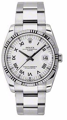 Model: 115234-WHRO - CASE = [Material:Stainless Steel], [Case Diameter:34], [Bezel:Fixed Fluted], [Water Resistant:100 Meters - 330 Feet], [Crystal:Sapphire],; DIAL = [Color:White Roman Numeral],; MOVEMENT = [Type:Automatic Self Winding],; BAND = [Clasp:Deployant], [Type:Stainless Steel Oyster], (Usually ships in 1 to 2 weeks.)