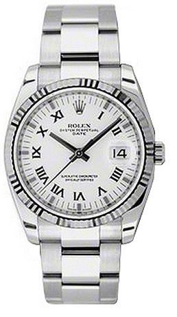 Model: 115234-WHRO - CASE = [Material:Stainless Steel], [Case Diameter:34], [Bezel:Fixed Fluted], [Water Resistant:100 Meters - 330 Feet], [Crystal:Sapphire], DIAL = [Color:White Roman Numeral], MOVEMENT = [Type:Automatic Self Winding], BAND = [Clasp:Deployant], [Type:Stainless Steel Oyster], (Usually ships in 1 to 2 weeks.)