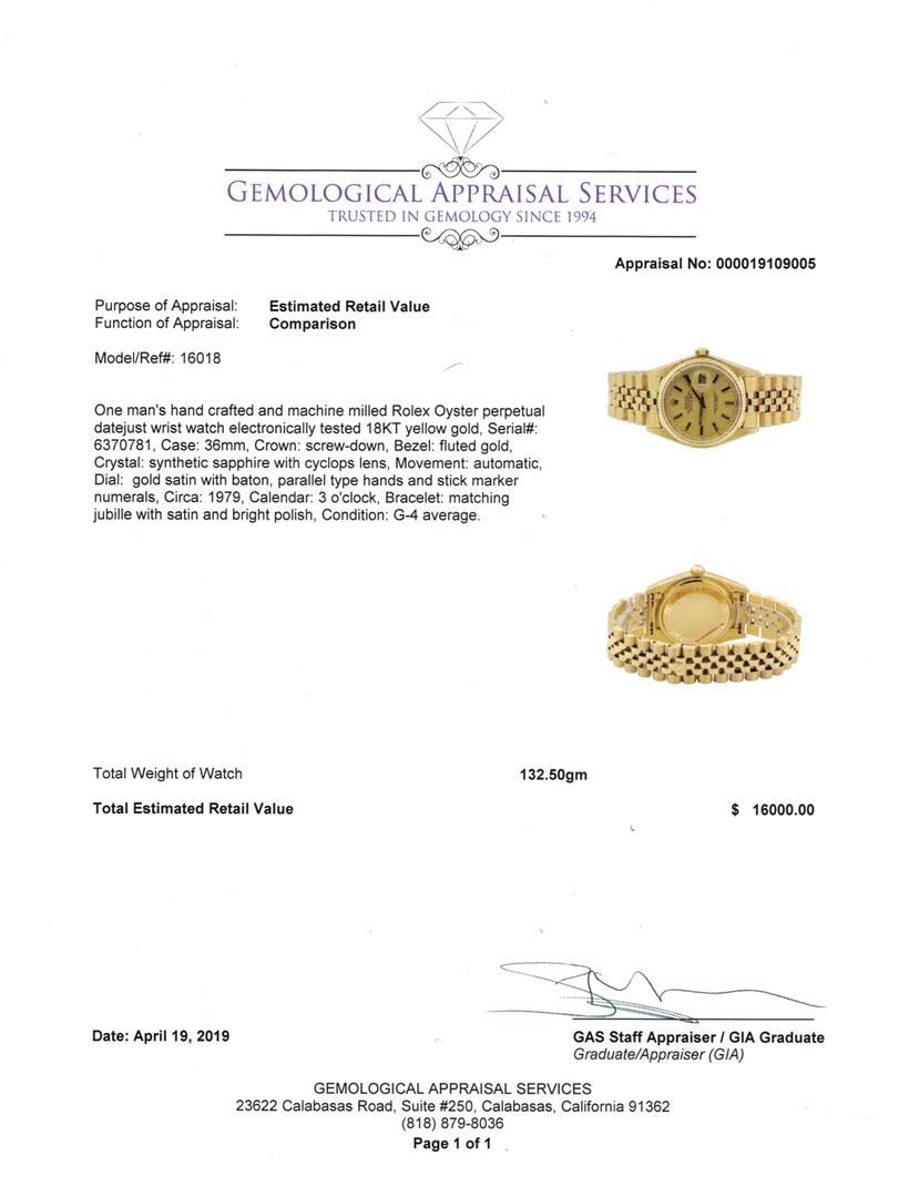 One man's, hand crafted and machine milled Rolex Oyster perpetual day date wrist watch electronically tested 18KT yellow gold, Serial#: 6370781, Case: 36mm, Crown: screw-down, Bezel: fluted gold, Crystal: synthetic sapphire with cyclops lens, Movement: automatic, Dial: gold satin with baton, parallel type hands and stick marker numerals, Circa: 1979, Calendar: 3 o'clock, Bracelet: matching jubille with satin and bright polish, Condition: G-4 average.. Total Weight of Watch 132.50gm GAS Appraised at $16000.00.