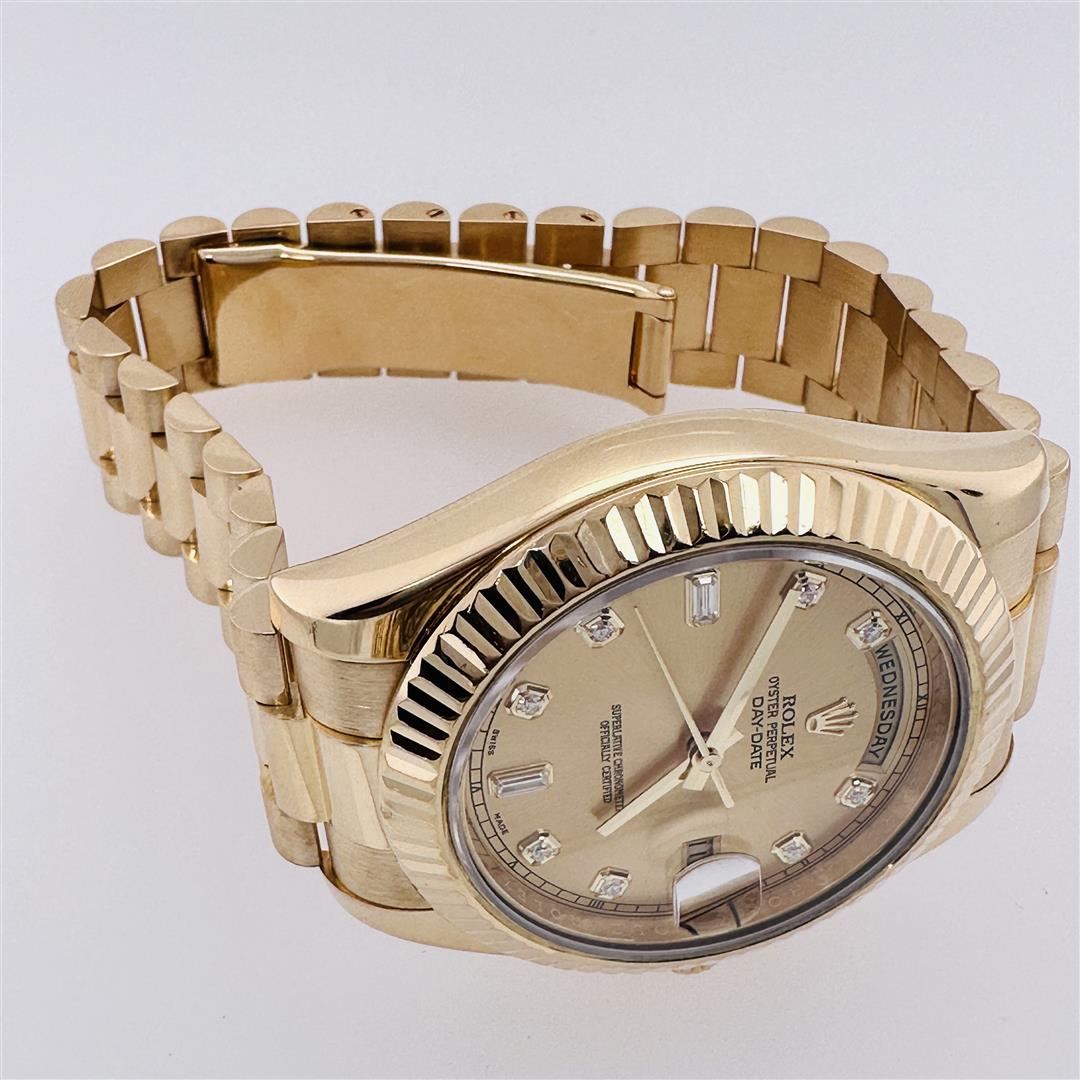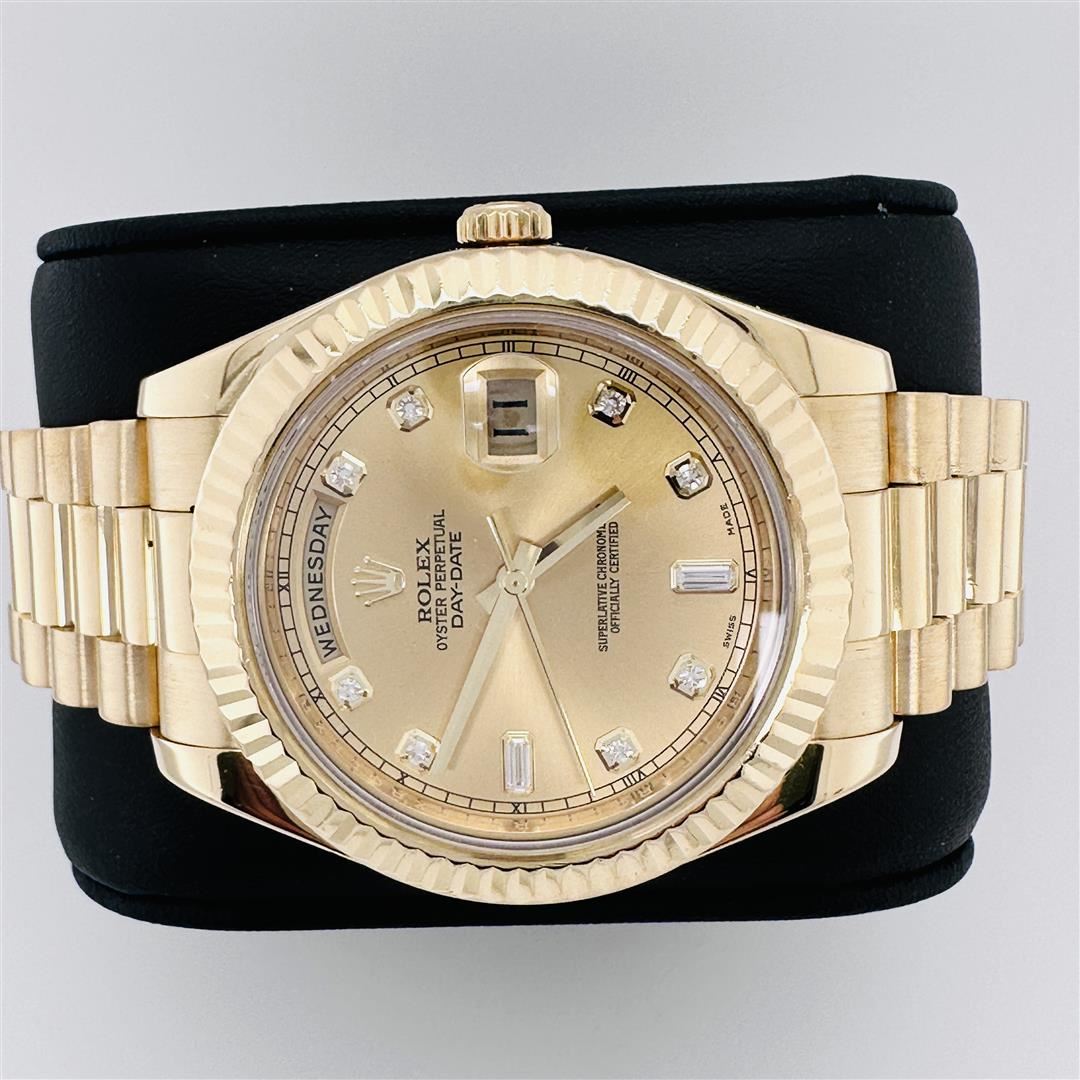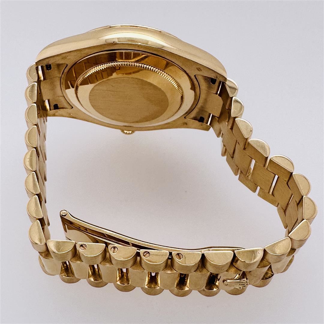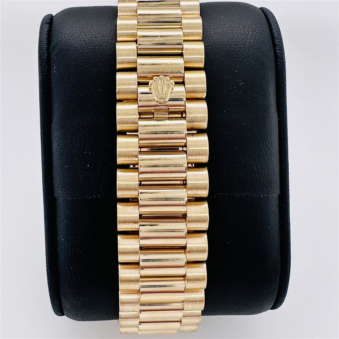 The Rolex Oyster Perpetual Day-Date Wristwatch in Yellow Gold with a Fluted Band epitomizes timeless elegance and precision craftsmanship. Crafted in 18KT Yellow Gold, features a distinctive fluted bezel. The standout feature is the Day-Date complication, showcasing the day spelled out in full below the Cyclops lens magnifying the date at 3 o'clock. The gold dial, adorned with luminescent markers and hands, houses a precise automatic movement. The fluted band offers both style and a comfortable fit. This Rolex Day-Date blends luxurious materials, horological expertise, and classic design, making it a statement piece for all occasions.
