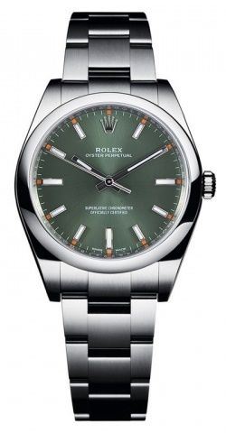 Model: 114200-0021 - CASE = [Material:Stainless Steel], [Case Diameter:34], [Water Resistant:100 Meters - 330 Feet], [Crystal:Scratch Resistant Sapphire], DIAL = [Color:Olive Green with Luminescent Hands and Hour Markers], MOVEMENT = [Type:Manual Winding], [Crown:Screw Down], BAND = [Clasp:Oysterclasp], [Type:Stainless Steel], (Usually ships in 1 to 2 weeks.)
