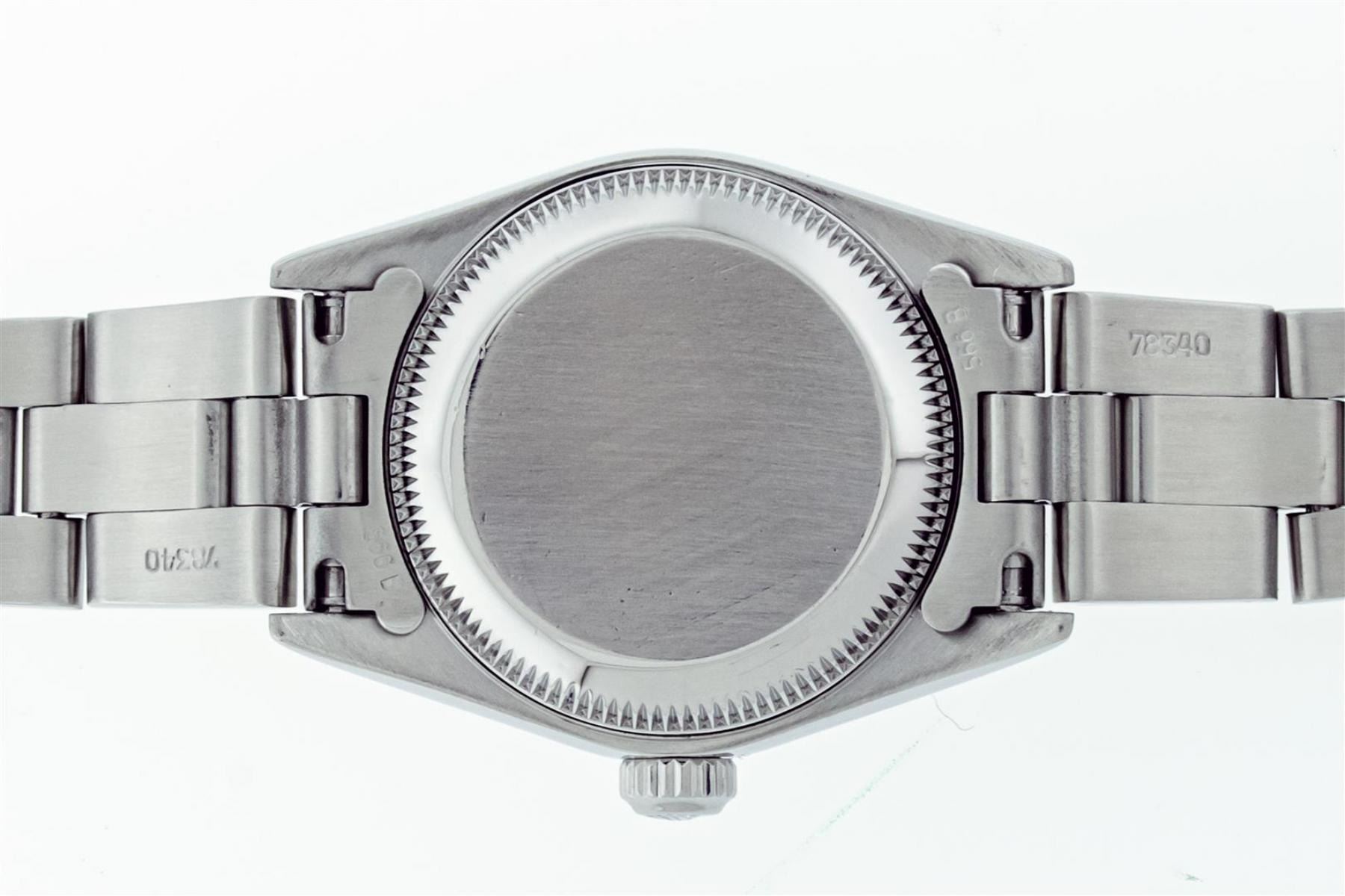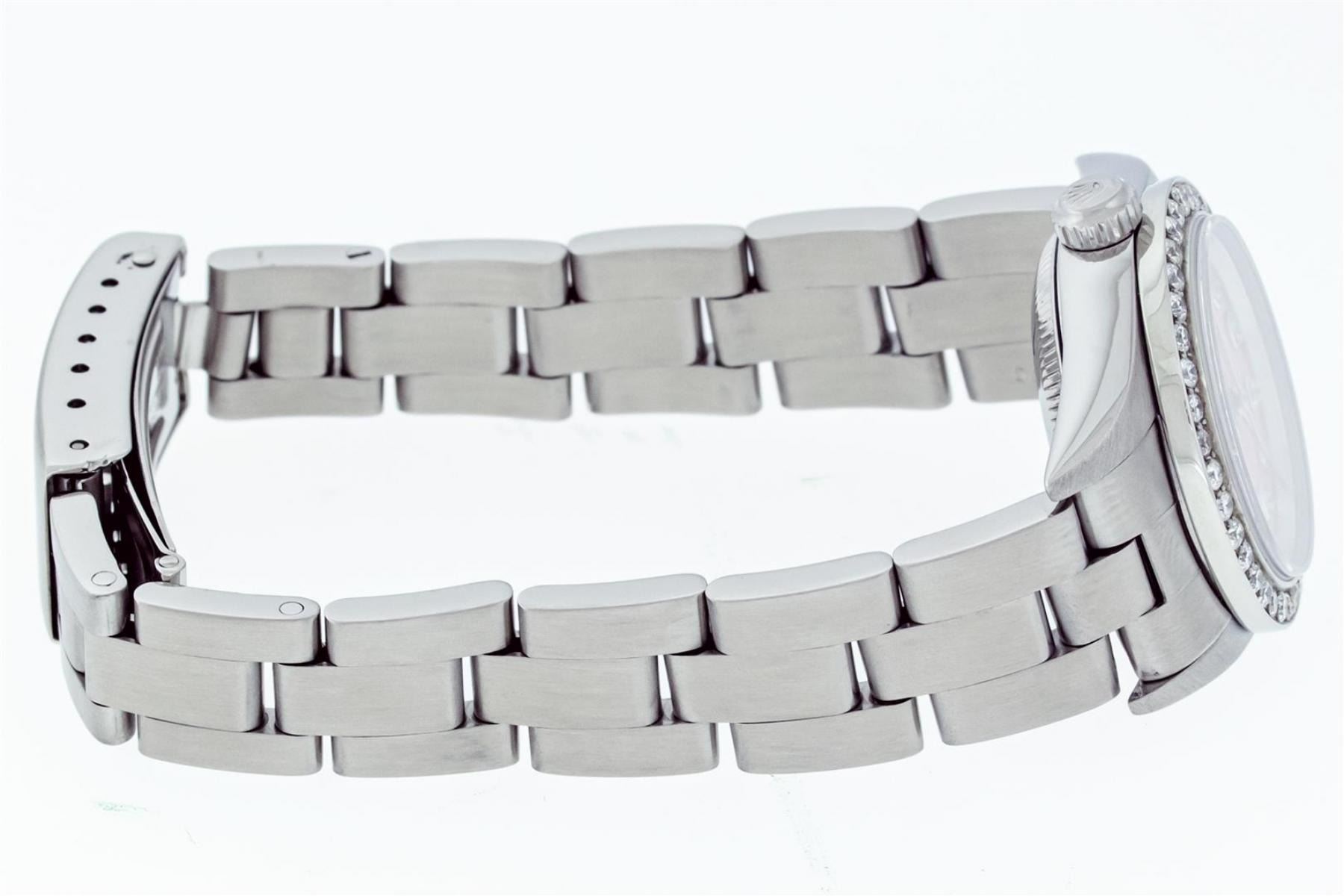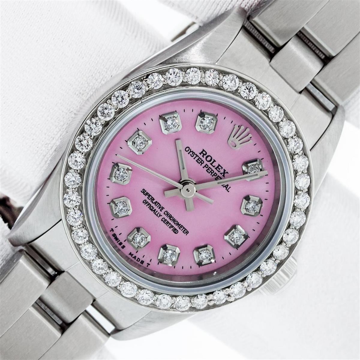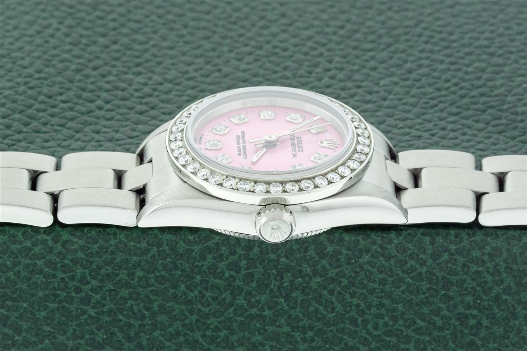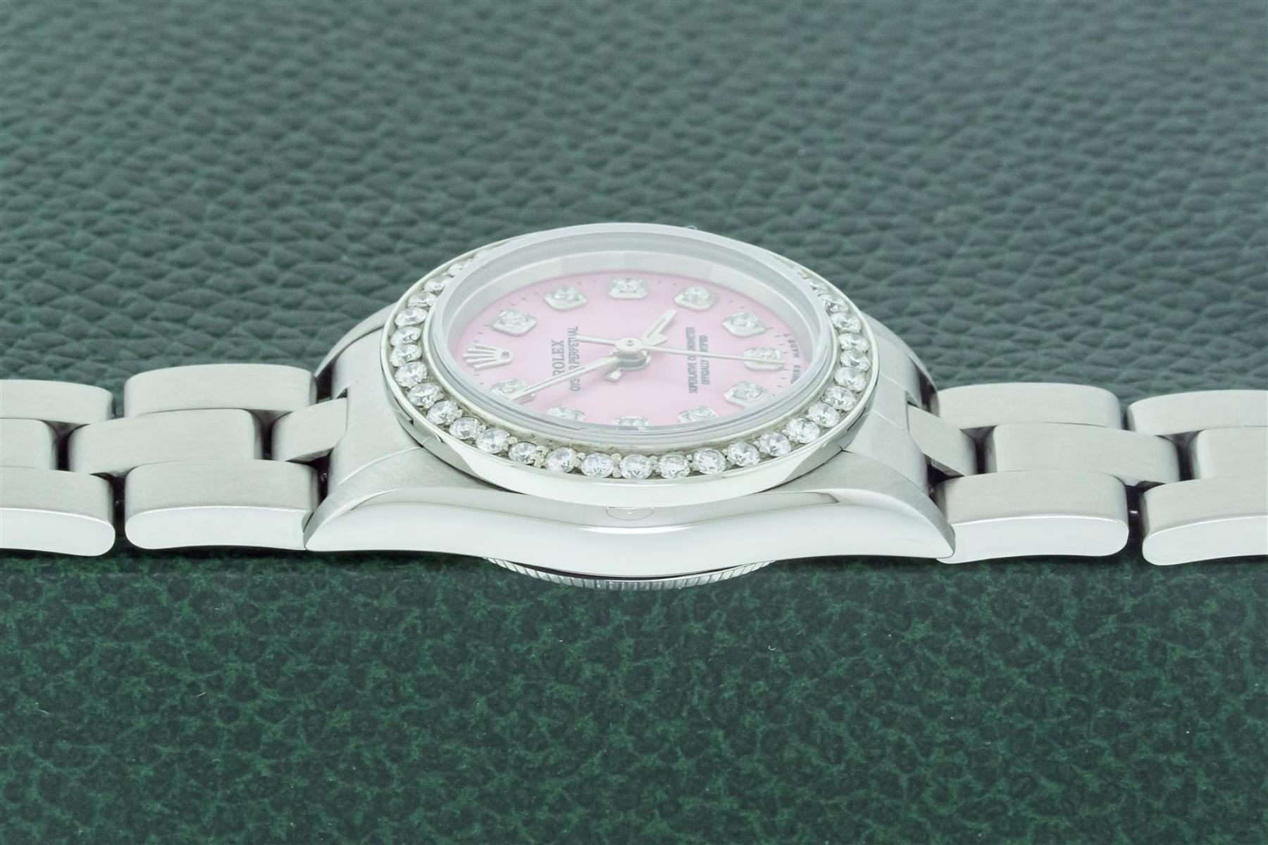One Ladies Stainless Steel Rolex Oyster Perpetual Datejust Polished Bright with Satin Finish, Serviced & Electronically Tested, Stainless Steel Case: 25mm, Stainless Steel Crown, Custom Bezel: Stainless Steel Beadset Diamond Bezel, Diamond Count: 38 Diamonds In Bezel, Diamond Color: G To H, Clarity VS2-SI1, Custom Crystal: New Acrylic Plastic Crystal. Custom Hands: New Luminescent Hands. Movement: Automatic Winding Movement 2230. Custom Dial: Pink Diamond Dial, Diamond Count: 10 Diamonds On Dial. Date Window: 3 O'Clock Position Date Display, Model: Oyster Perpetual 76080. Condition: G-6 Extra Fine. Bracelet: Stainless Steel Oyster Band. Bright Polish & Satin Finish. 6.0 Inches Length, Adjustable. Original Clasp With Rolex Logo. This Watch Has Been Serviced Time Tested And Is In Excellent Condition It Is Free Of All Scratches And Dents. This Watch Comes With A Rolex Box, Rolex Booklets, And Rolex Red Wallet.