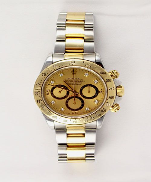MEN'S ROLEX DAYTONA TWO TONE ENGRAVED TACHYMETER BEZEL DIAMOND HOUR MARKER CHAMPAGNE DIAMOND DIAL TWOTONE OYSTER BRACELET