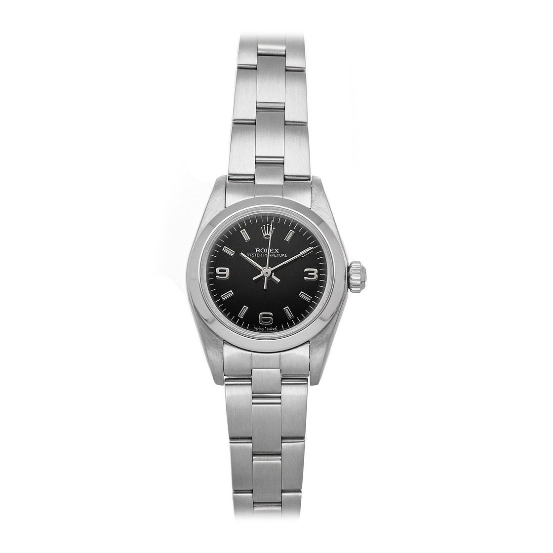 Pre-Owned Rolex Oyster Perpetual (76080) self-winding automatic watch, features a 24mm stainless steel case surrounding a blue dial on a stainless steel Oyster bracelet with folding buckle.