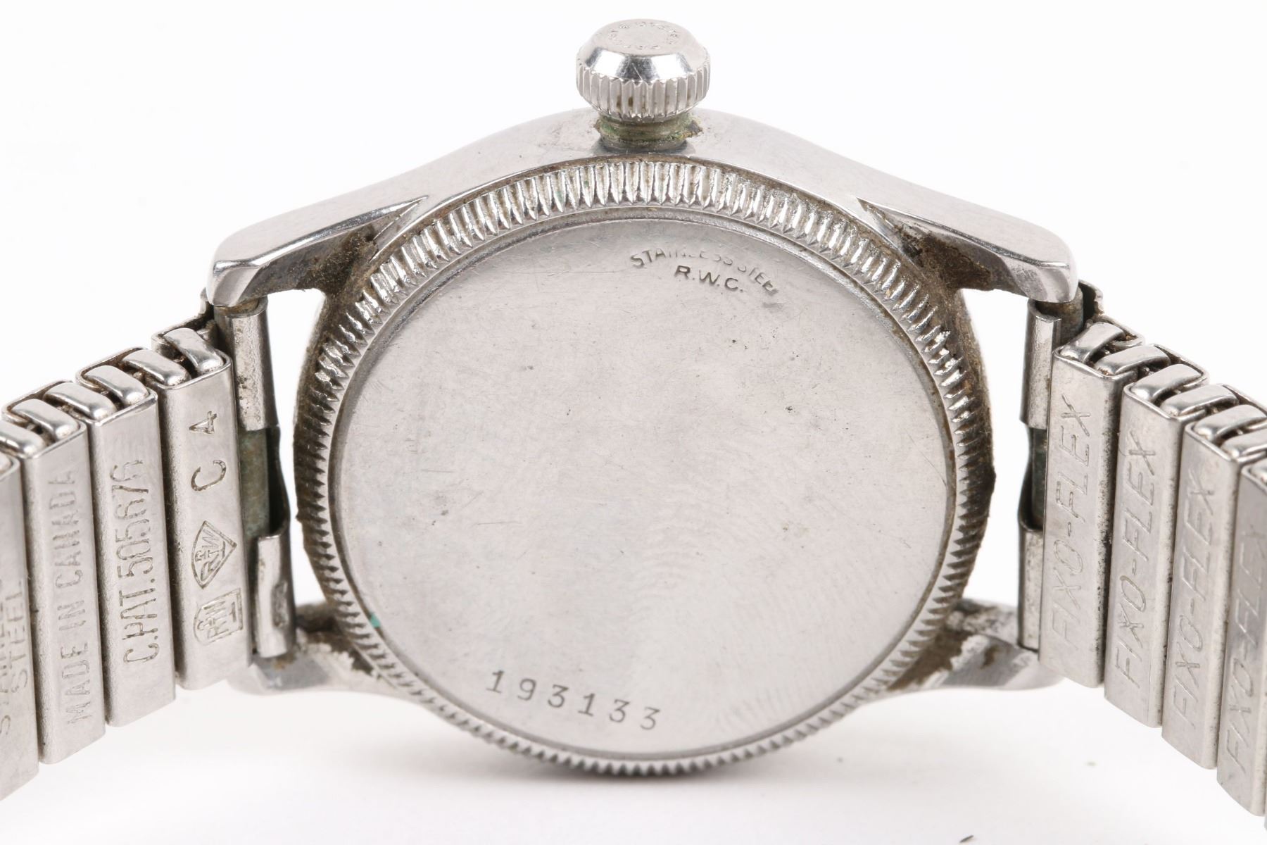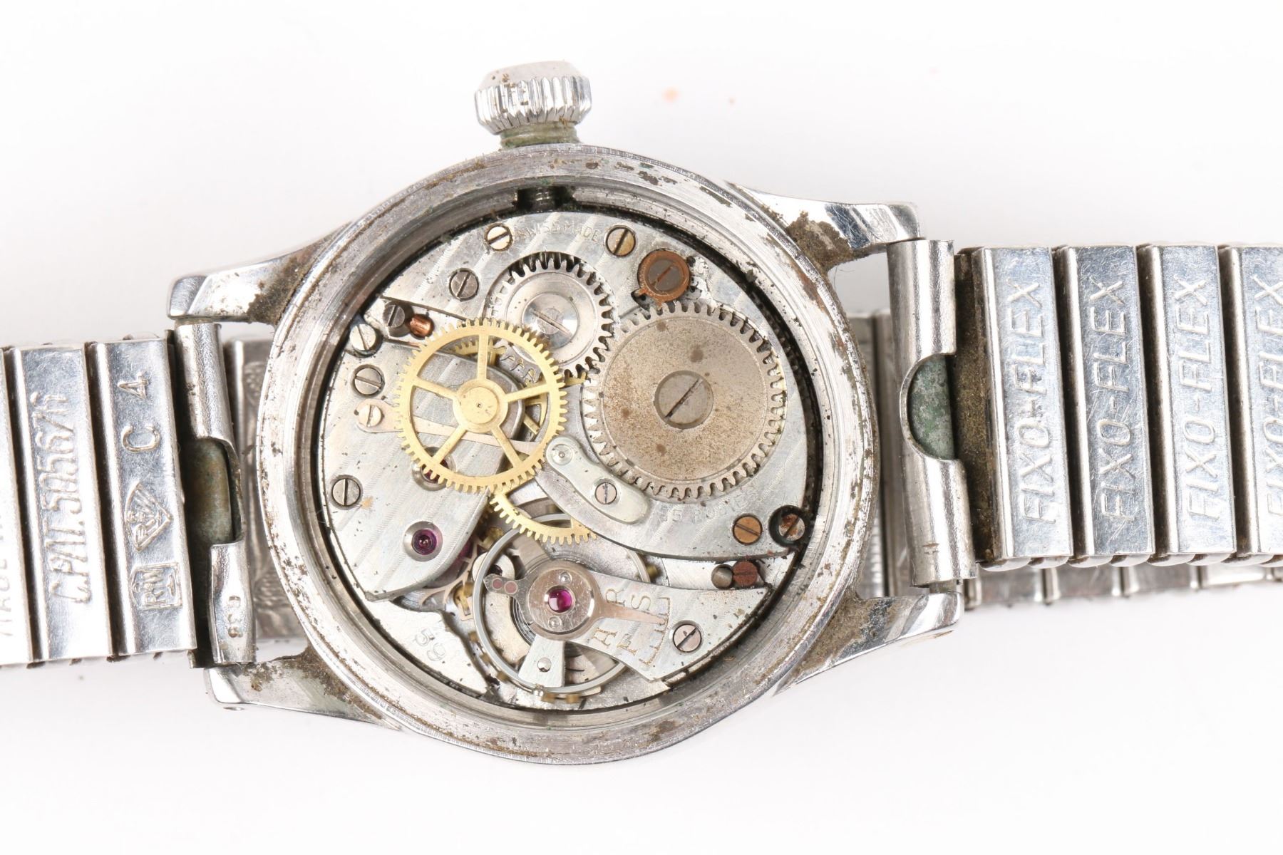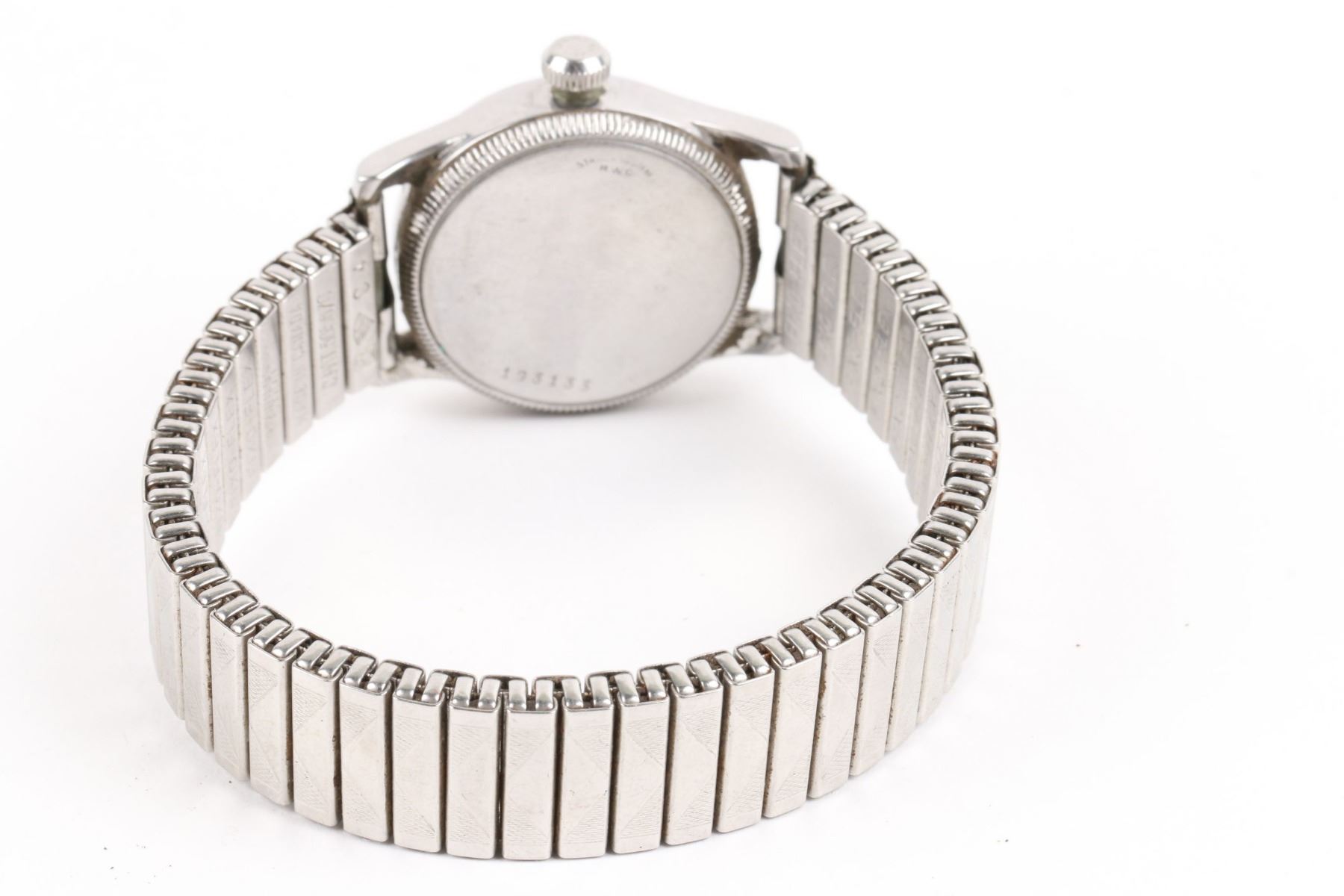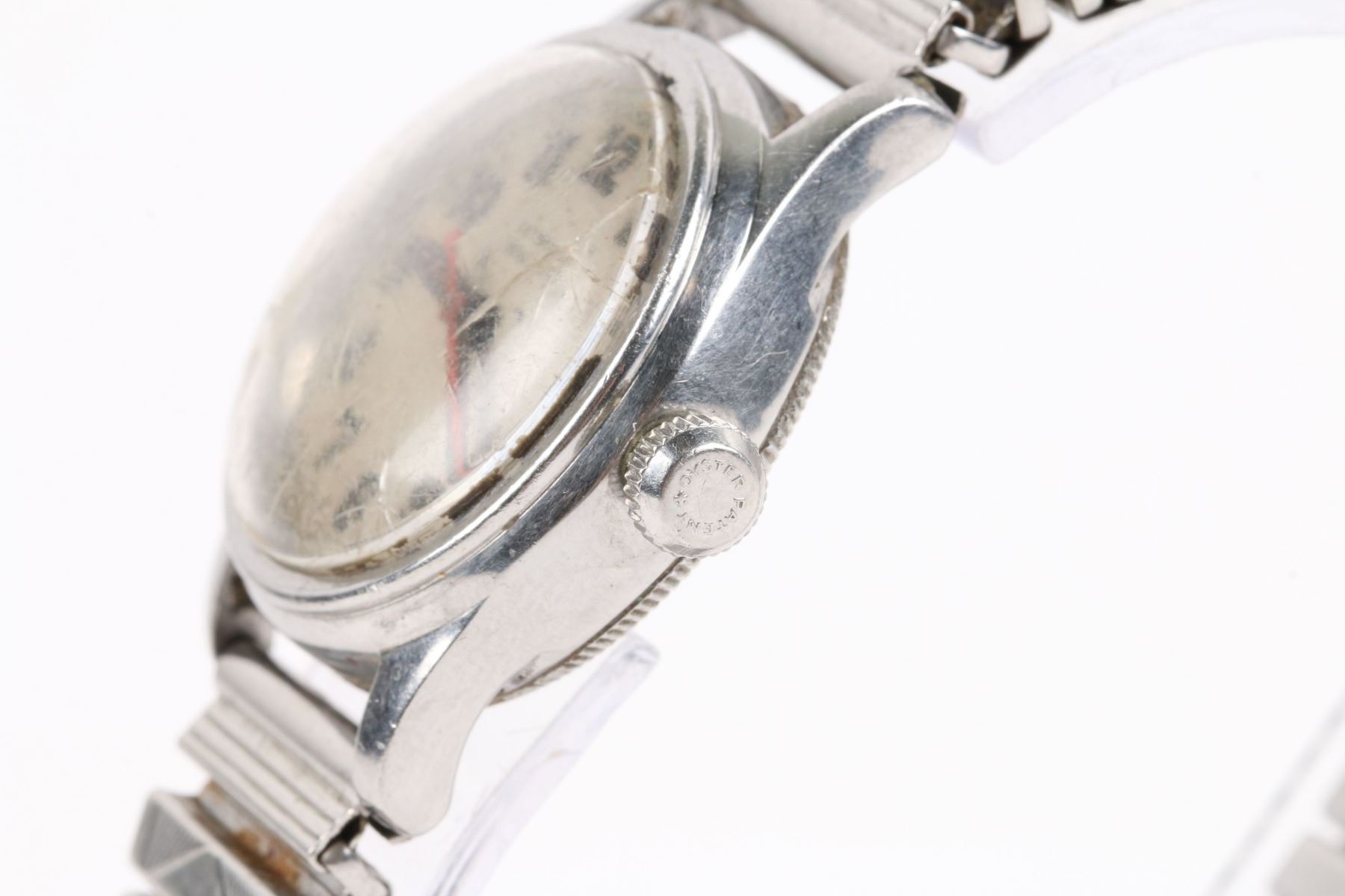 CIRCA: 1940s. CASE MATERIAL: Stainless. DIAL DIAMETER: 24mm. BRACELET MATERIAL: Stainless Steel. MOVEMENT: Manual Wind. NOTES: Crown tube stripped. Crystal cracked, worn. Movement, case back exhibit oxidation. WEIGHT: 61.5g. Est. $400-600 DISCLOSURE: Watches were running at time of photography unless otherwise stated. Service history is unknown unless paperwork is provided. We cannot guarantee accuracy of any of the watches offered. "