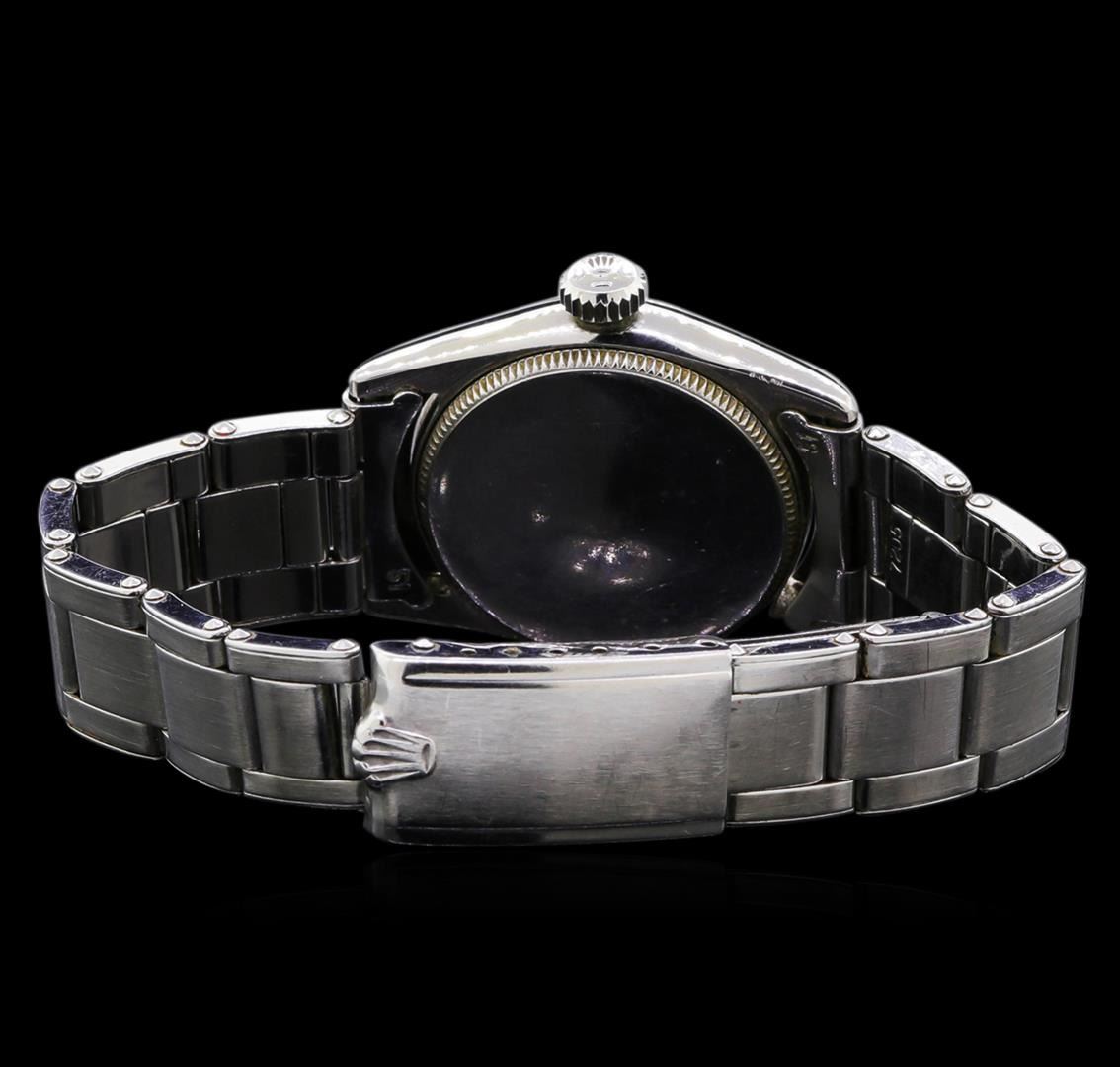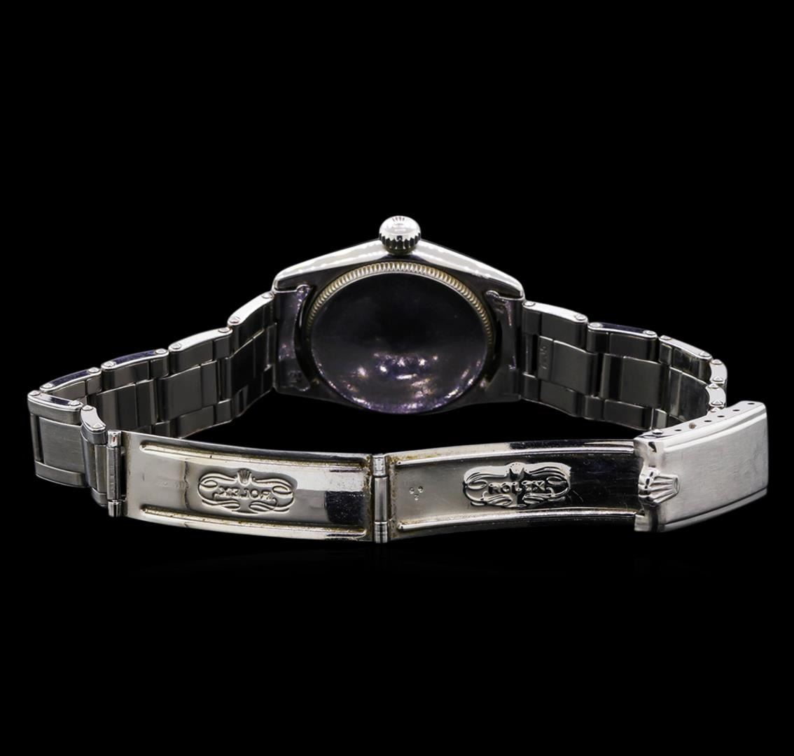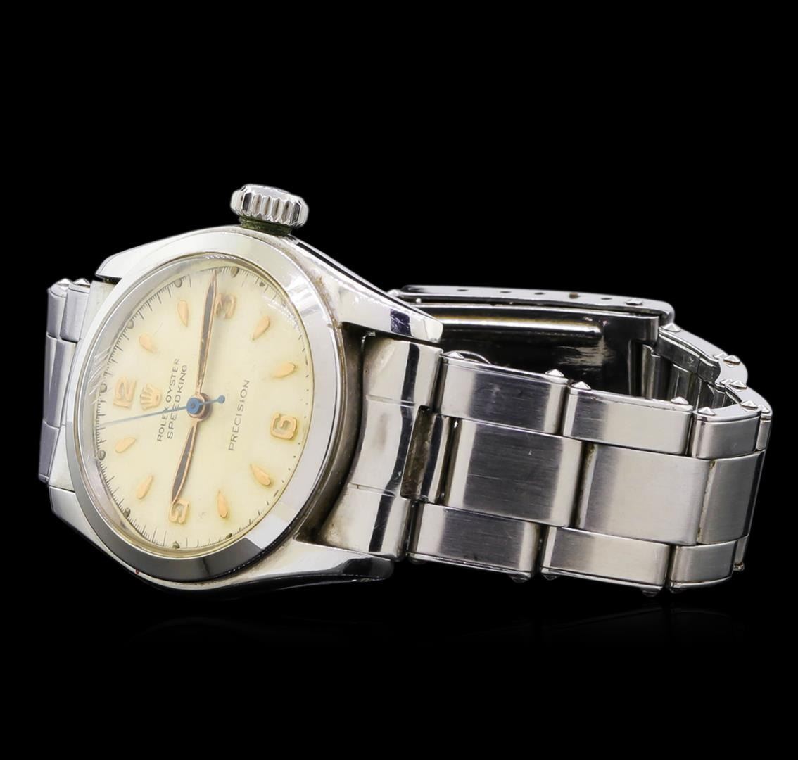 One Rolex Oyster Speedking watch featuring: Case: round, 36 x 29mm, steel. Bezel: Steel. Dial: Beige with gold colored dot markers and Arabic numerals at 3, 6, 9 and 12 o'clock. Movement: Manual. Crystal: Sapphire. Bracelet: Steel with deployment clasp. Condition: Moderate wear on bracelet and case and light scratches on crystal, but otherwise in good working condition.