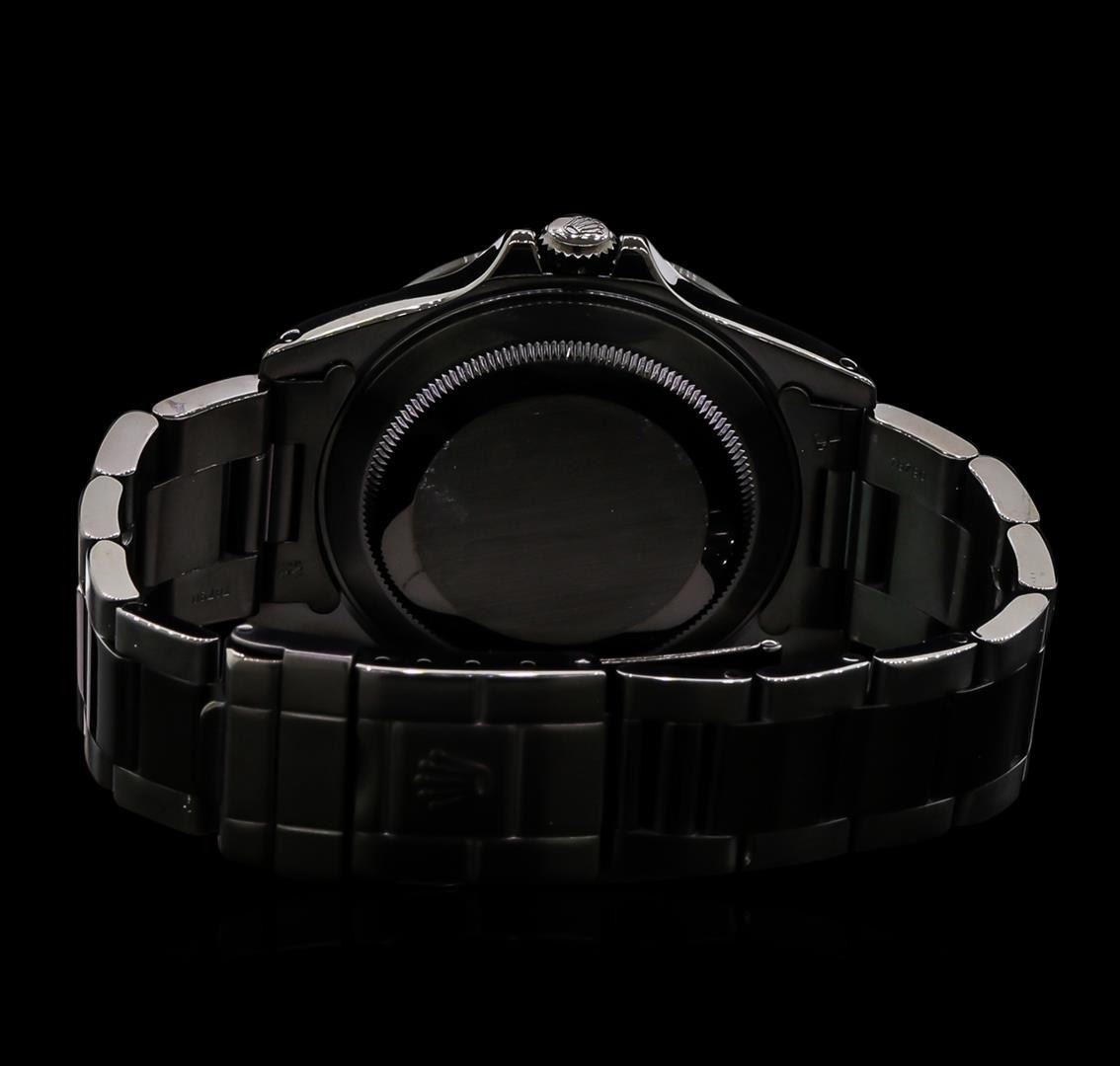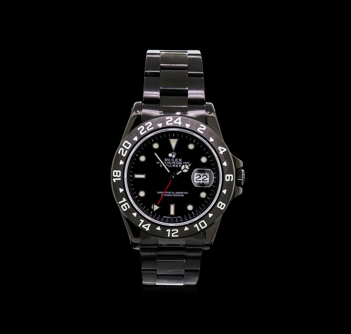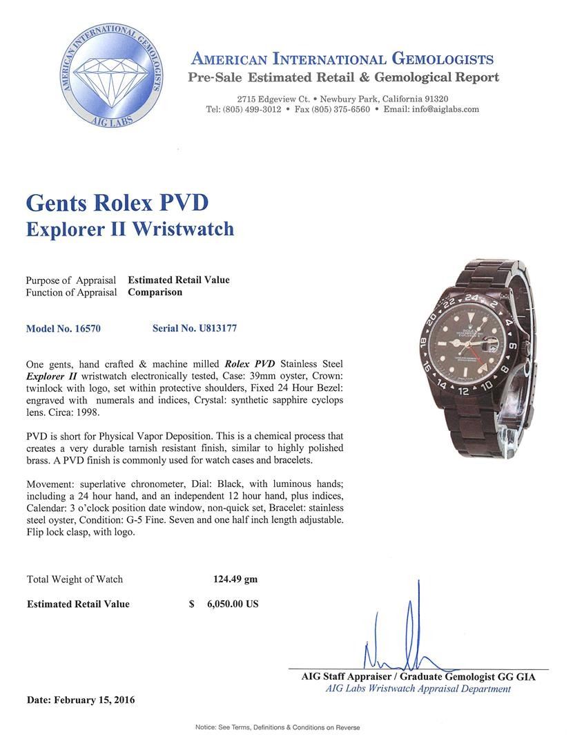 One gents, hand crafted & machine milled Rolex PVD Stainless Steel Explorer II wristwatch electronically tested, Case: 39mm oyster, Crown: twinlock with logo, set within protective shoulders, Fixed 24 Hour Bezel: engraved with numerals and indices, Crystal: synthetic sapphire cyclops lens. Circa: 1998.PVD is short for Physical Vapor Deposition. This is a chemical process that creates a very durable tarnish resistant finish, similar to highly polished brass. A PVD finish is commonly used for watch cases and bracelets. Movement: superlative chronometer, Dial: Black, with luminous hands; including a 24 hour hand, and an independent 12 hour hand, plus indices, Calendar: 3 o'clock position date window, non-quick set, Bracelet: stainless steel oyster, Condition: G-5 Fine. Seven and one half inch length adjustable. Flip lock clasp, with logo. Total Weight of Watch 124.49gm. AIG Appraised at $6,050.00.